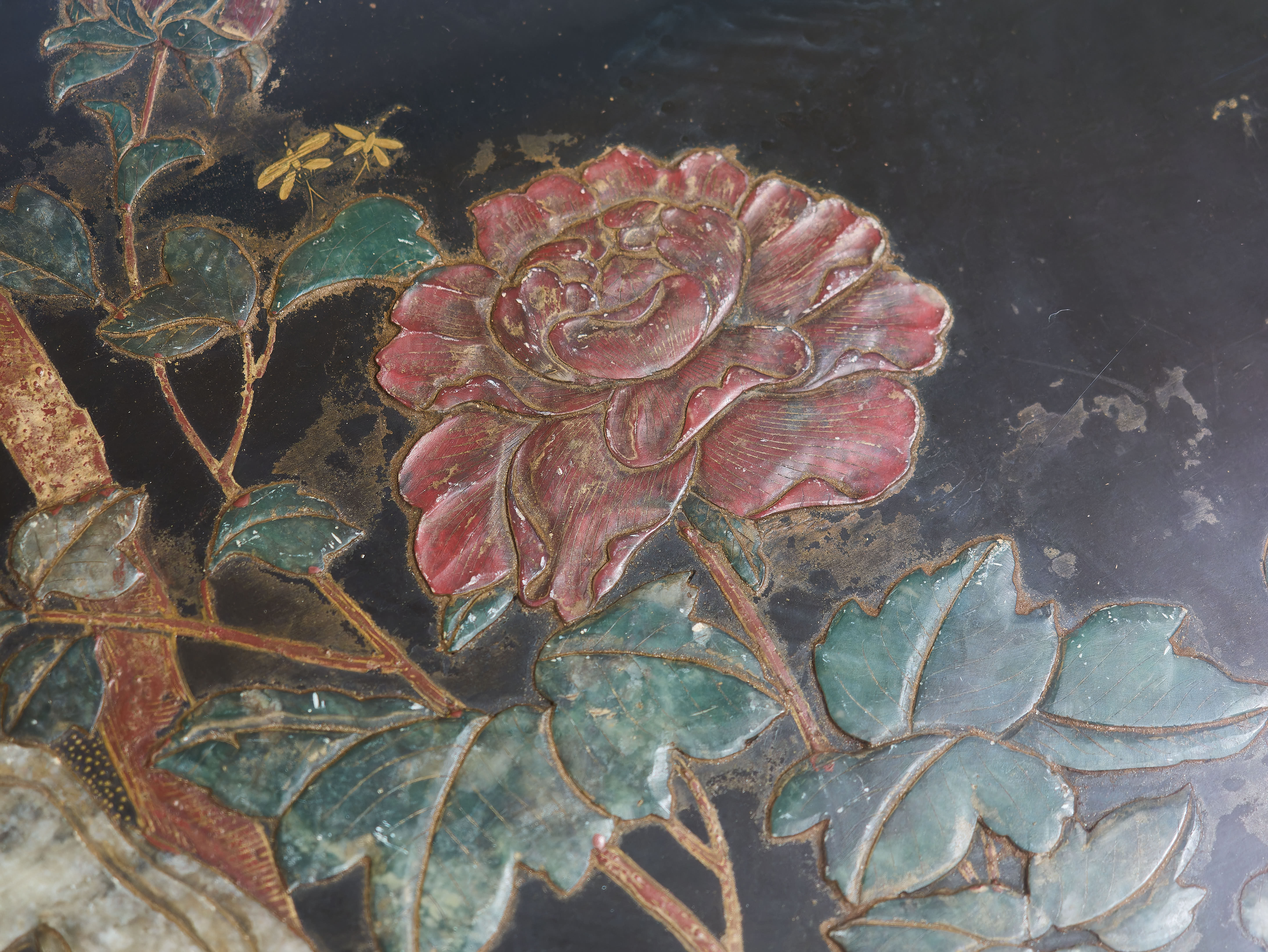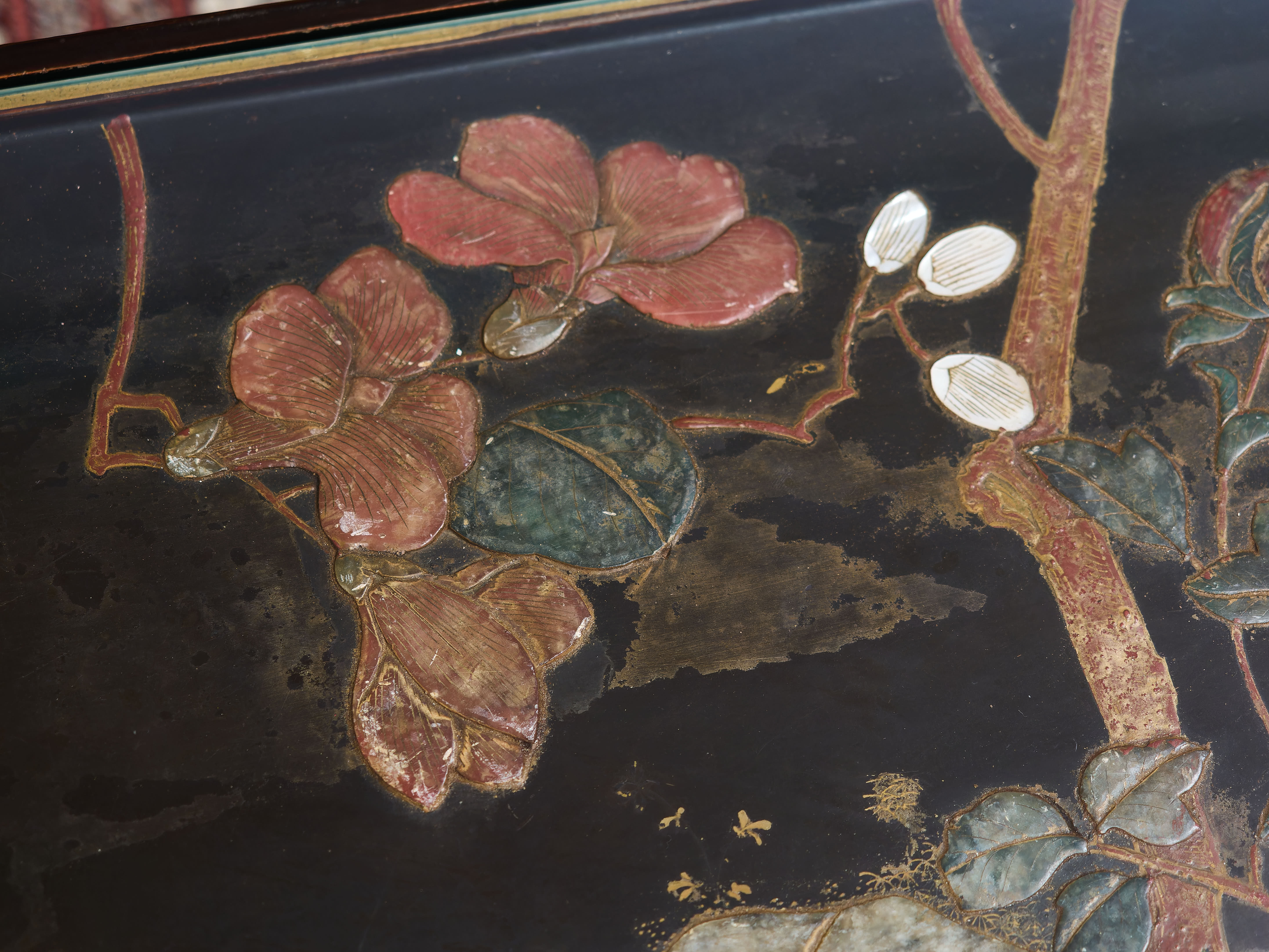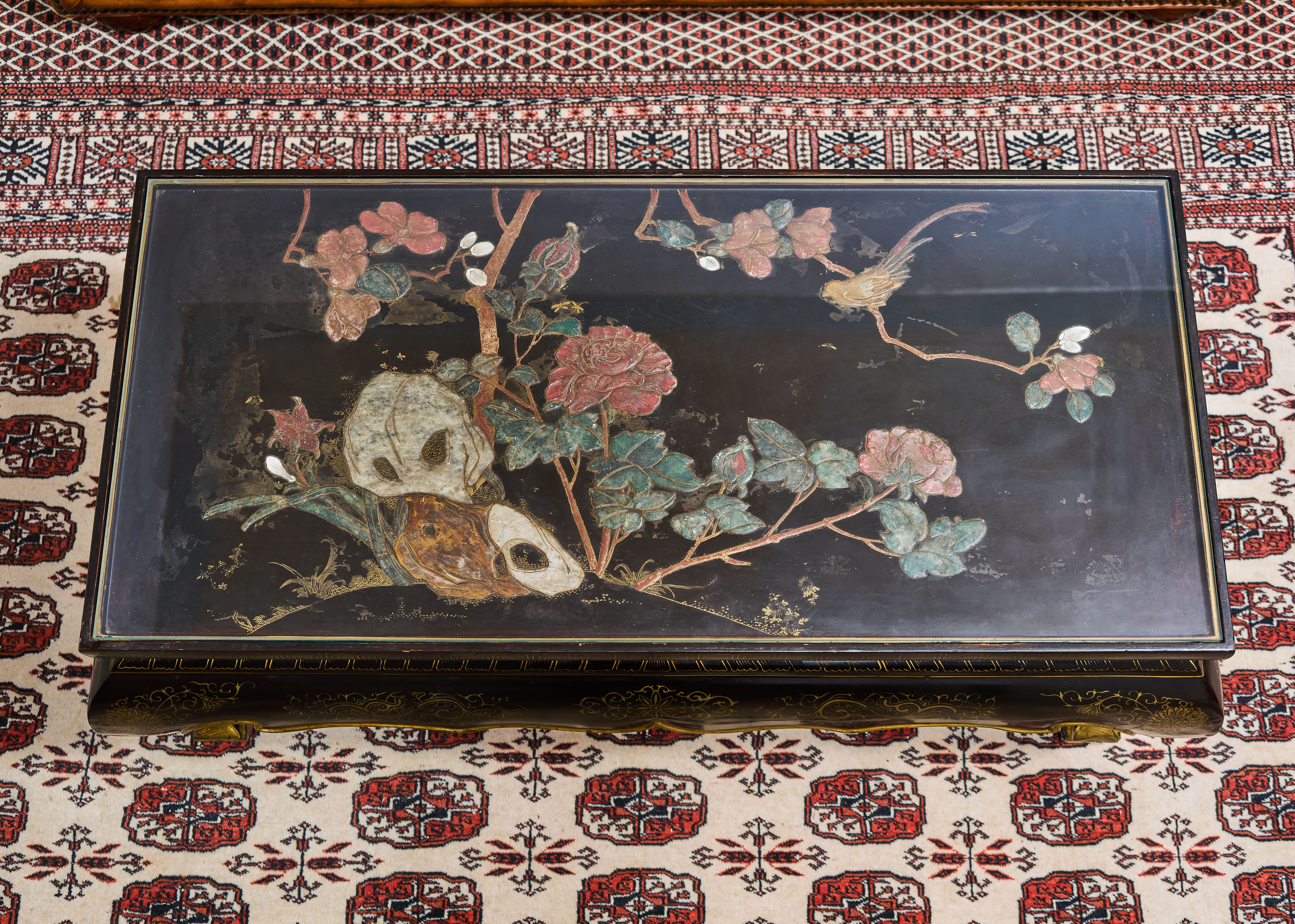 Výjimečný starožitný nízký stolek pocházející z Číny, zhotovený z masivního exotického dřeva a opatřený hlubokým černým lakem se zlacenými ornamenty. Horní deska je bohatě ručně malovaná a vykládaná ručně řezanými kameny, pravděpodobně jadeitem a dalšími polodrahokamy, s jemným květinovým motivem v tradiční čínské symbolice.