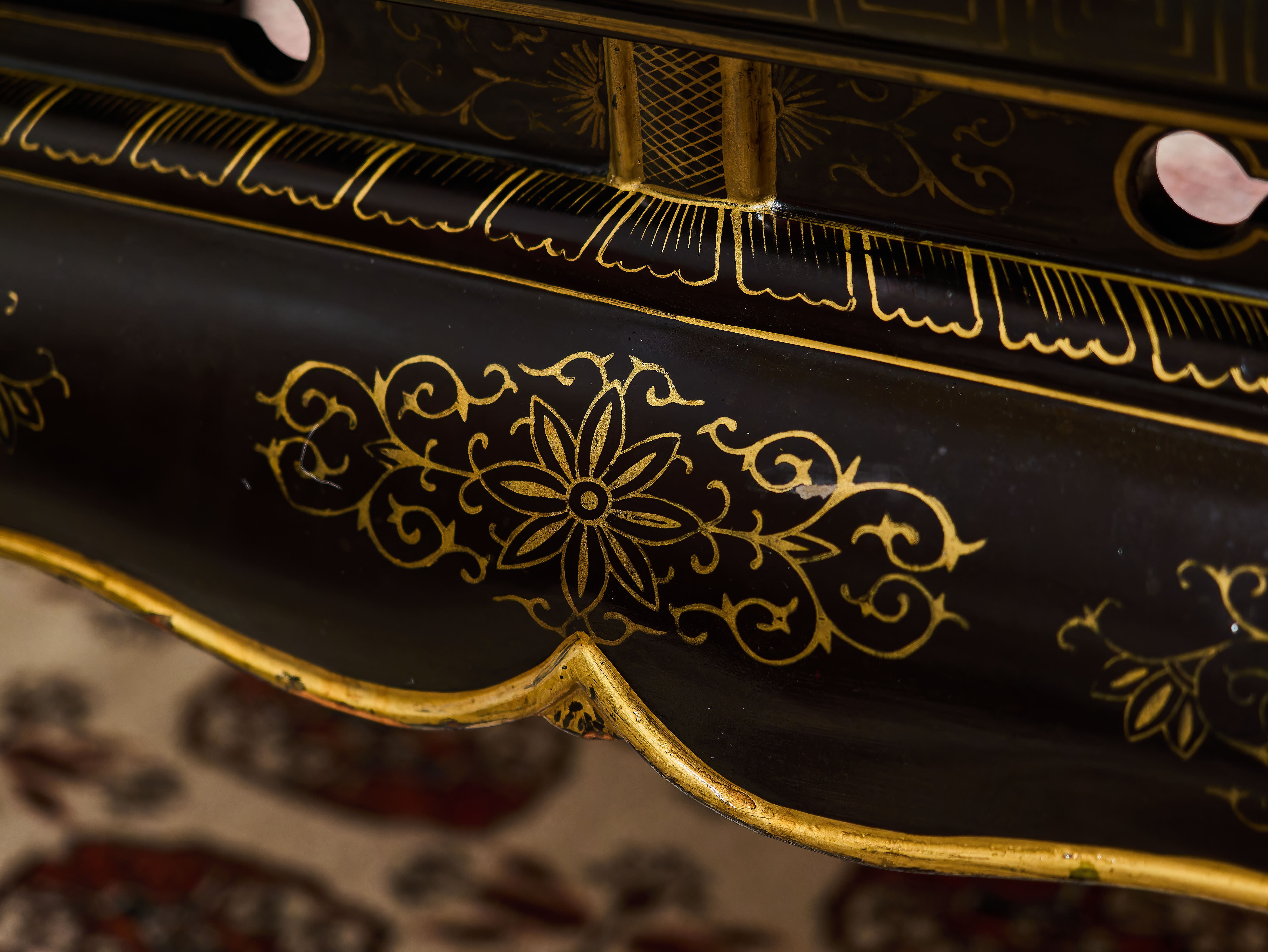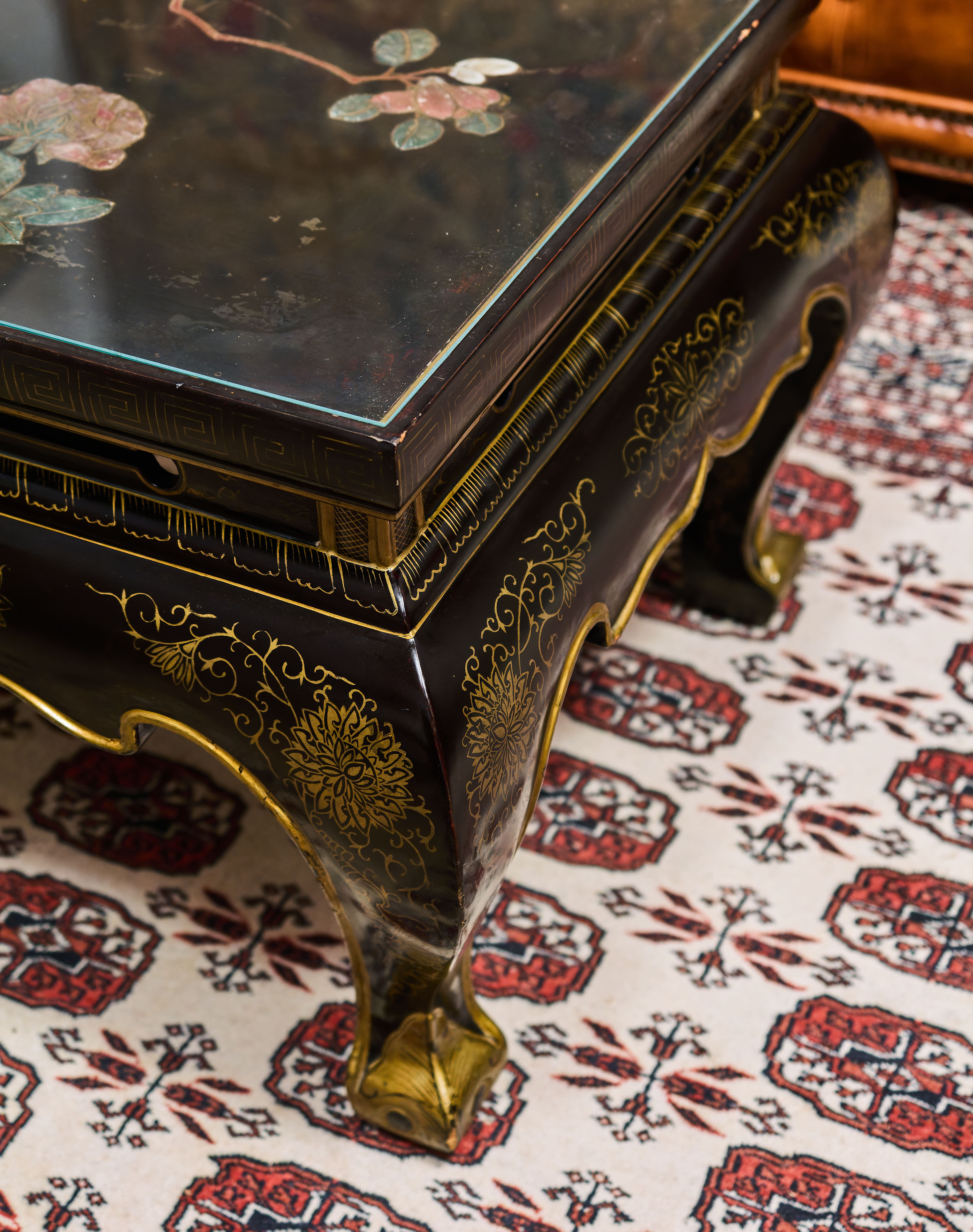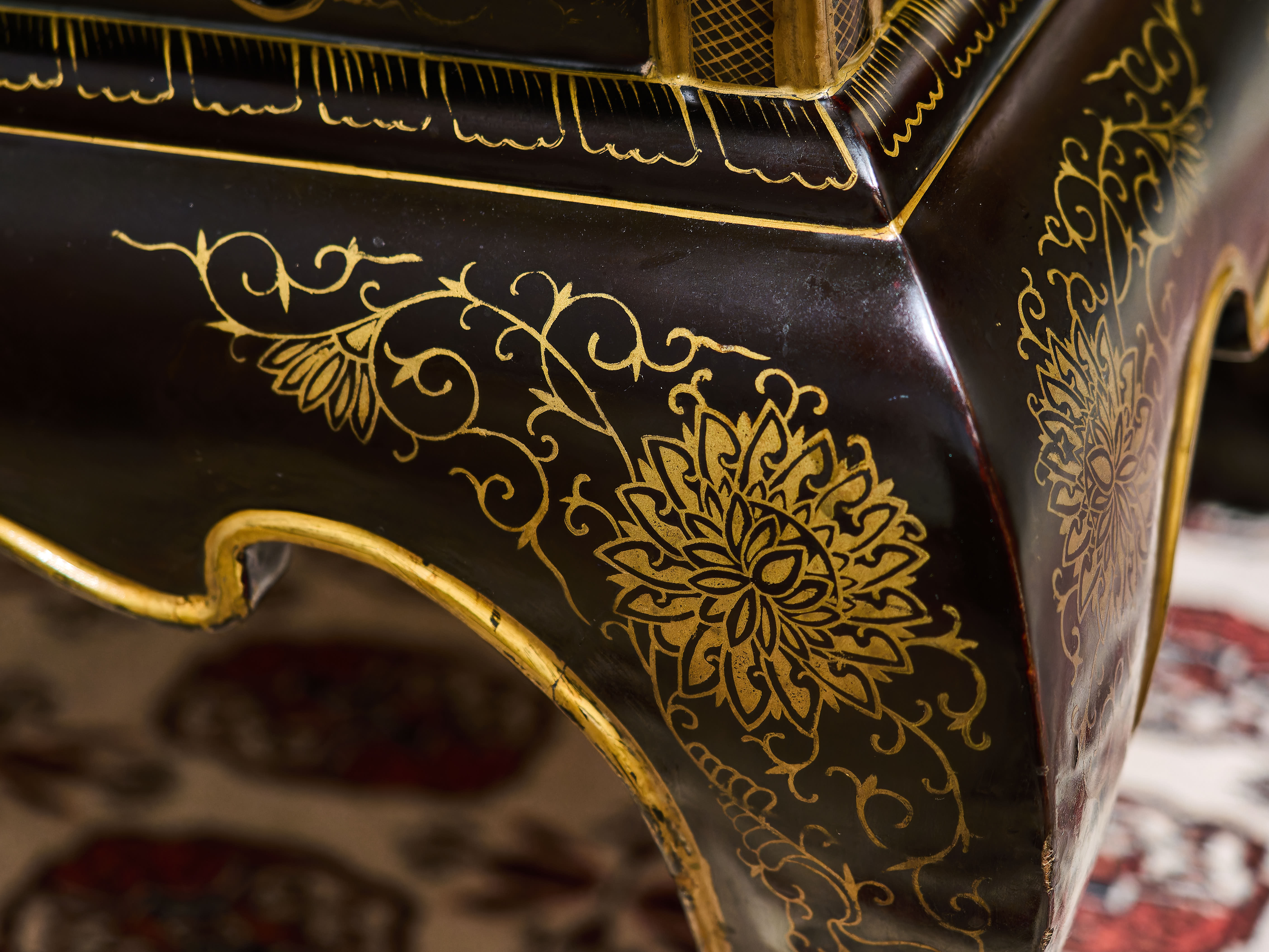 Stolek stojí na elegantně tvarovaných nohách s jemným zlacením, korpus je precizně zpracovaný a dekorativní z každého pohledu. Celek působí velmi reprezentativně a má silný vizuální efekt, typický pro kvalitní čínský exportní lak určený pro evropské interiéry.