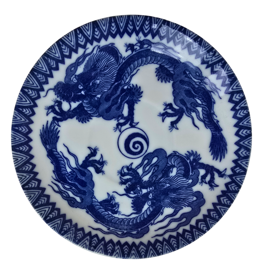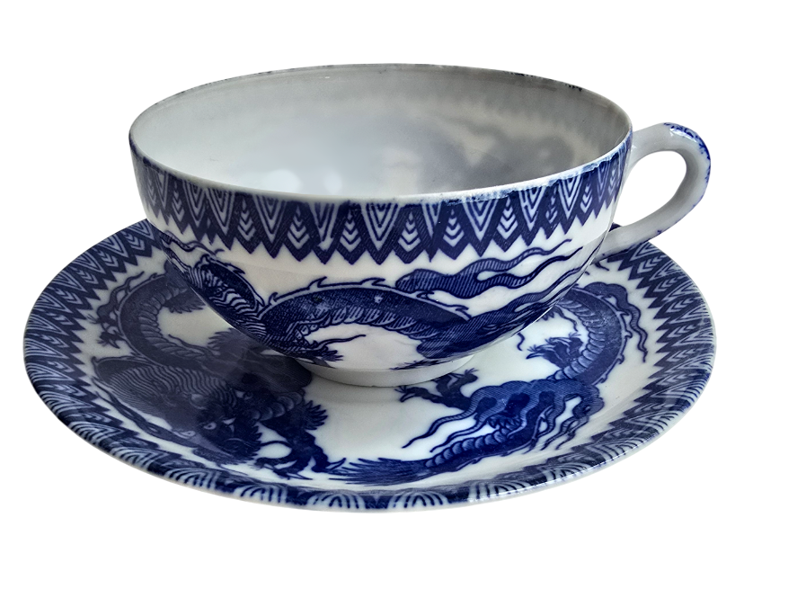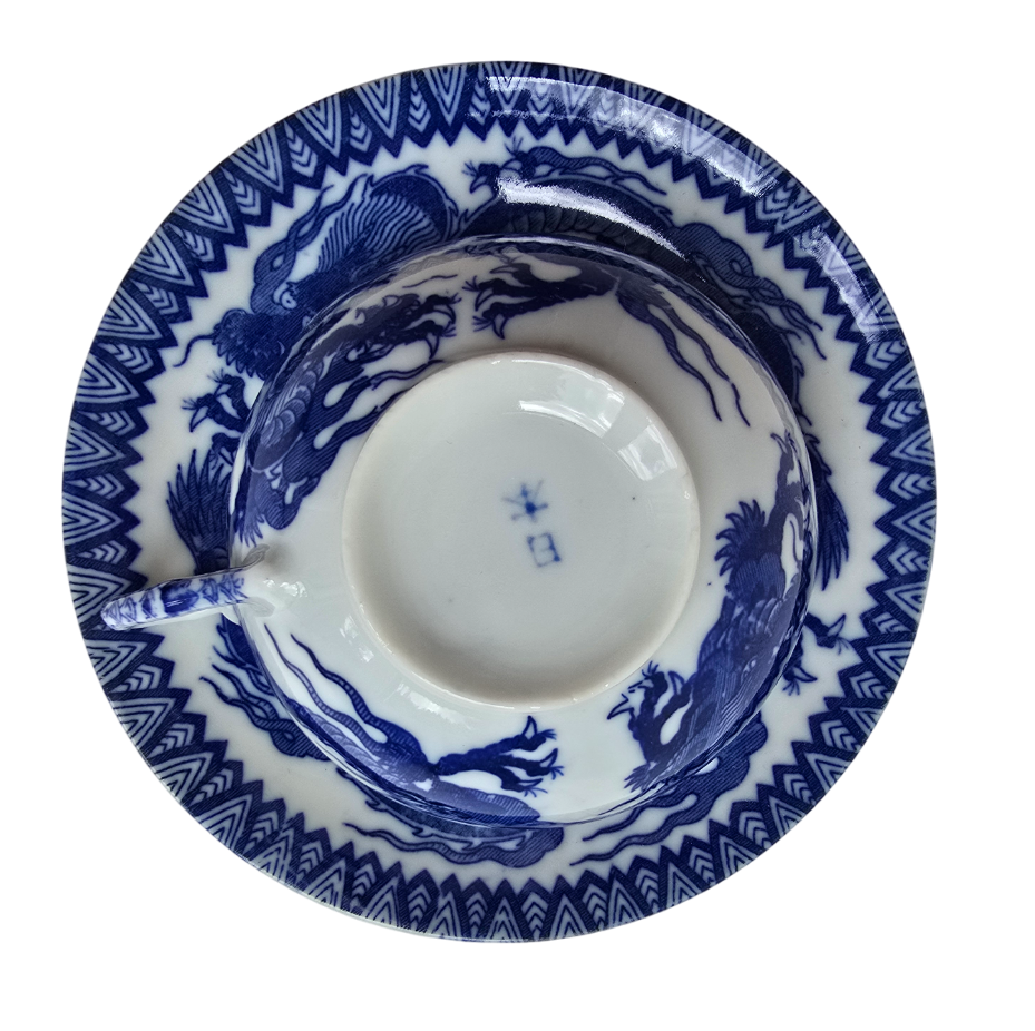 Popis: Tenkostěnný starožitný čínský šálek s podšálkem, dekorovaný modrými čínskými draky. Signace na spodní straně šálku i podšálku. Nepoškozeno, bez otluků. Výborný stav.