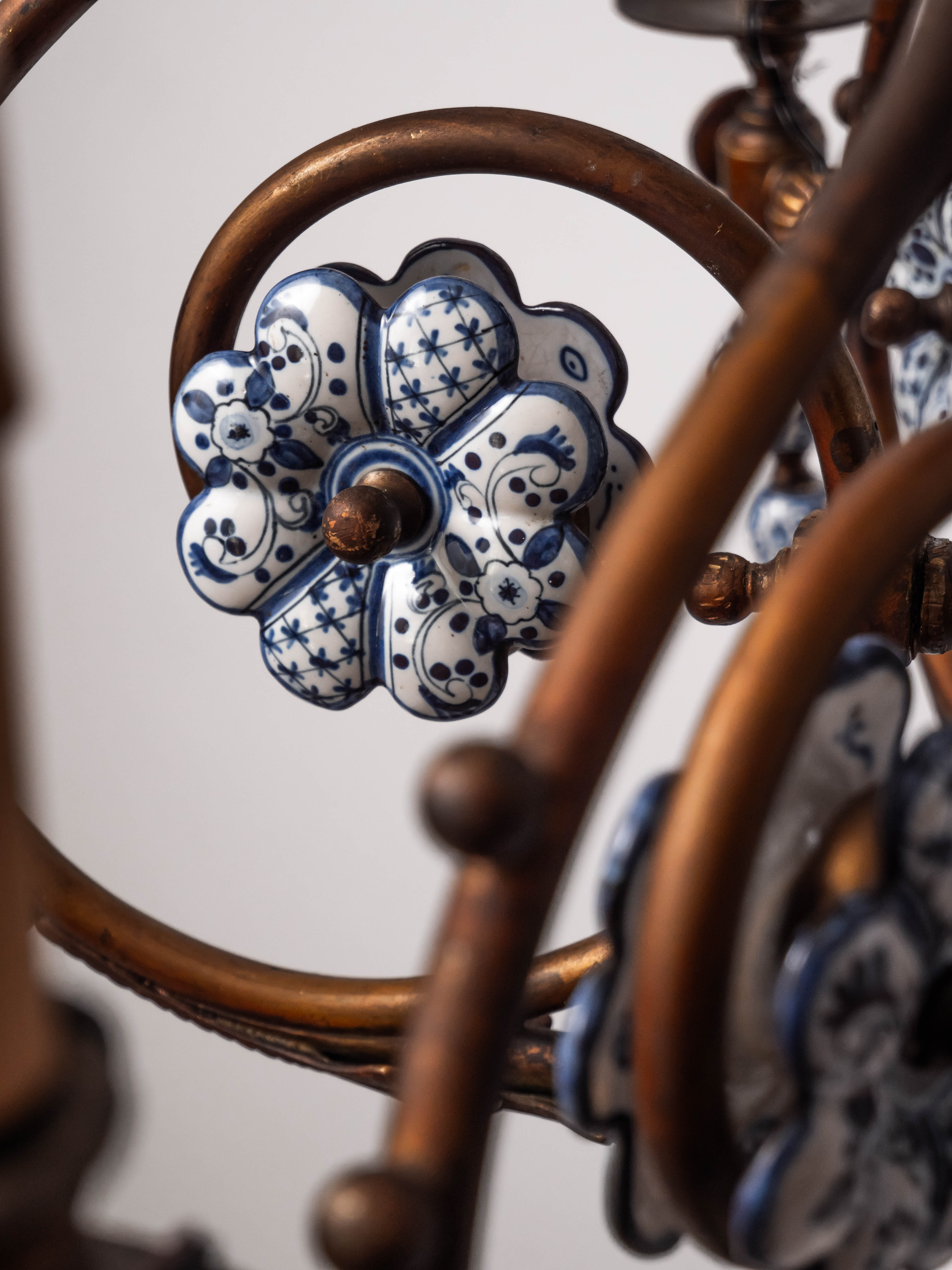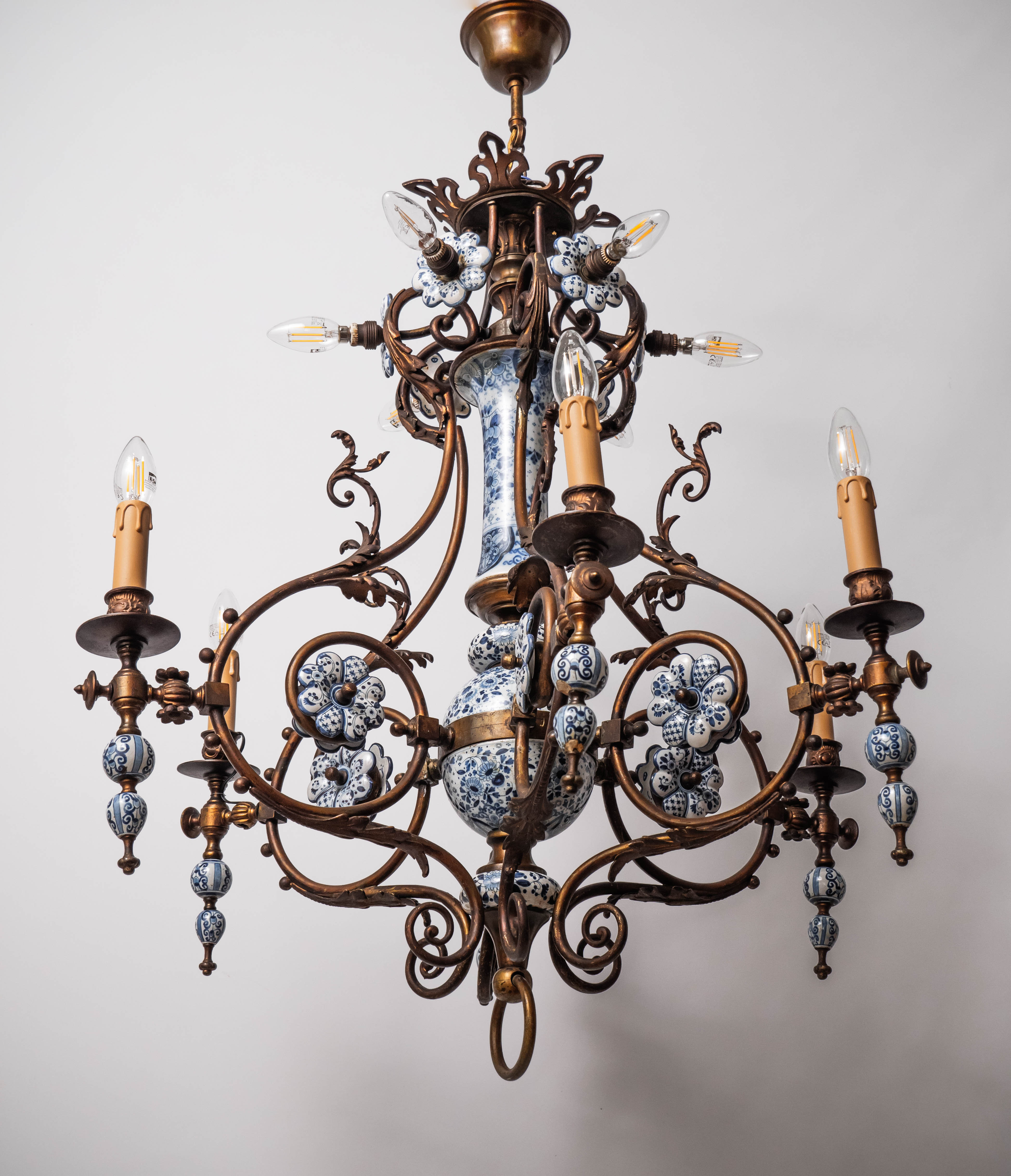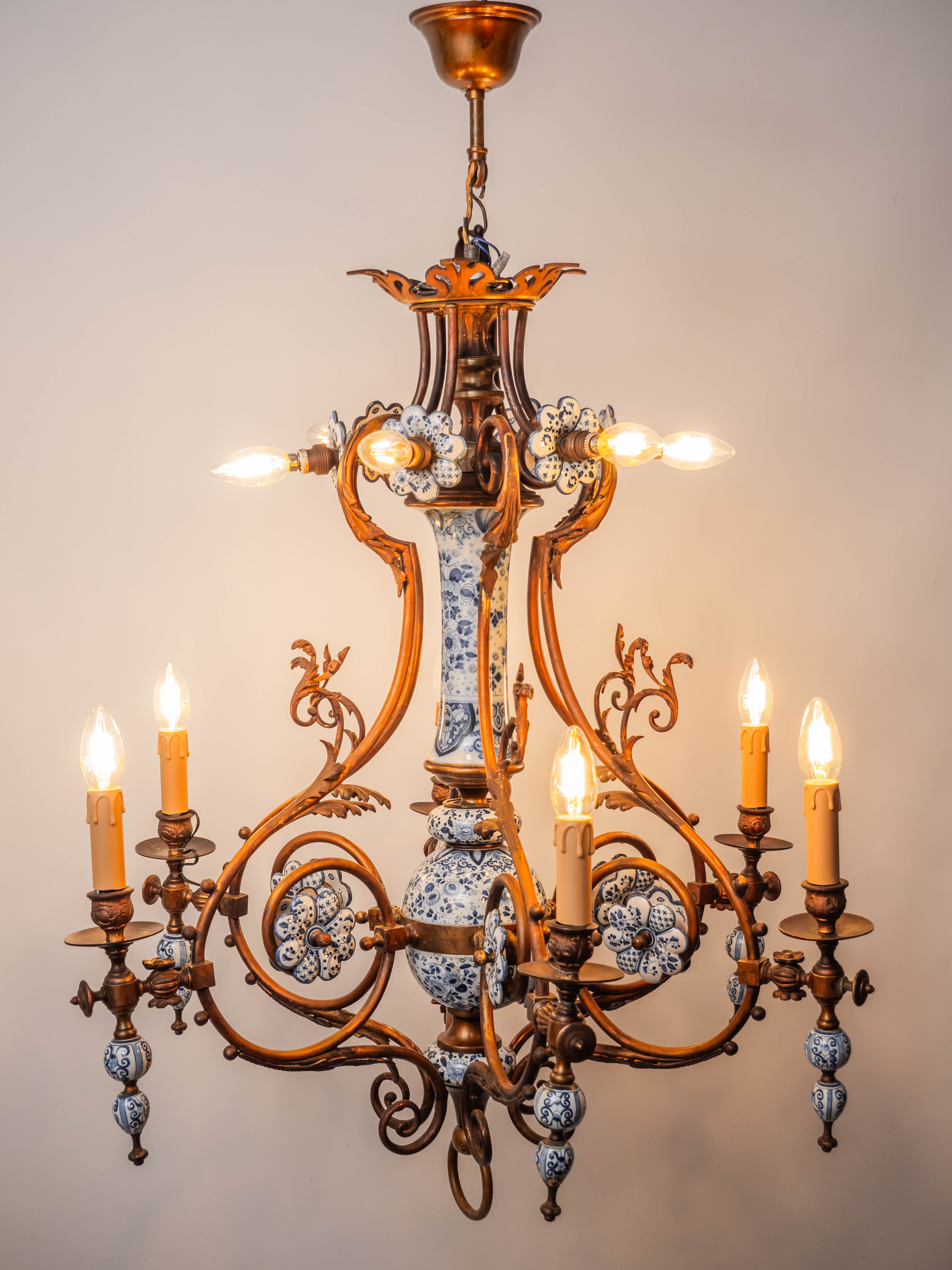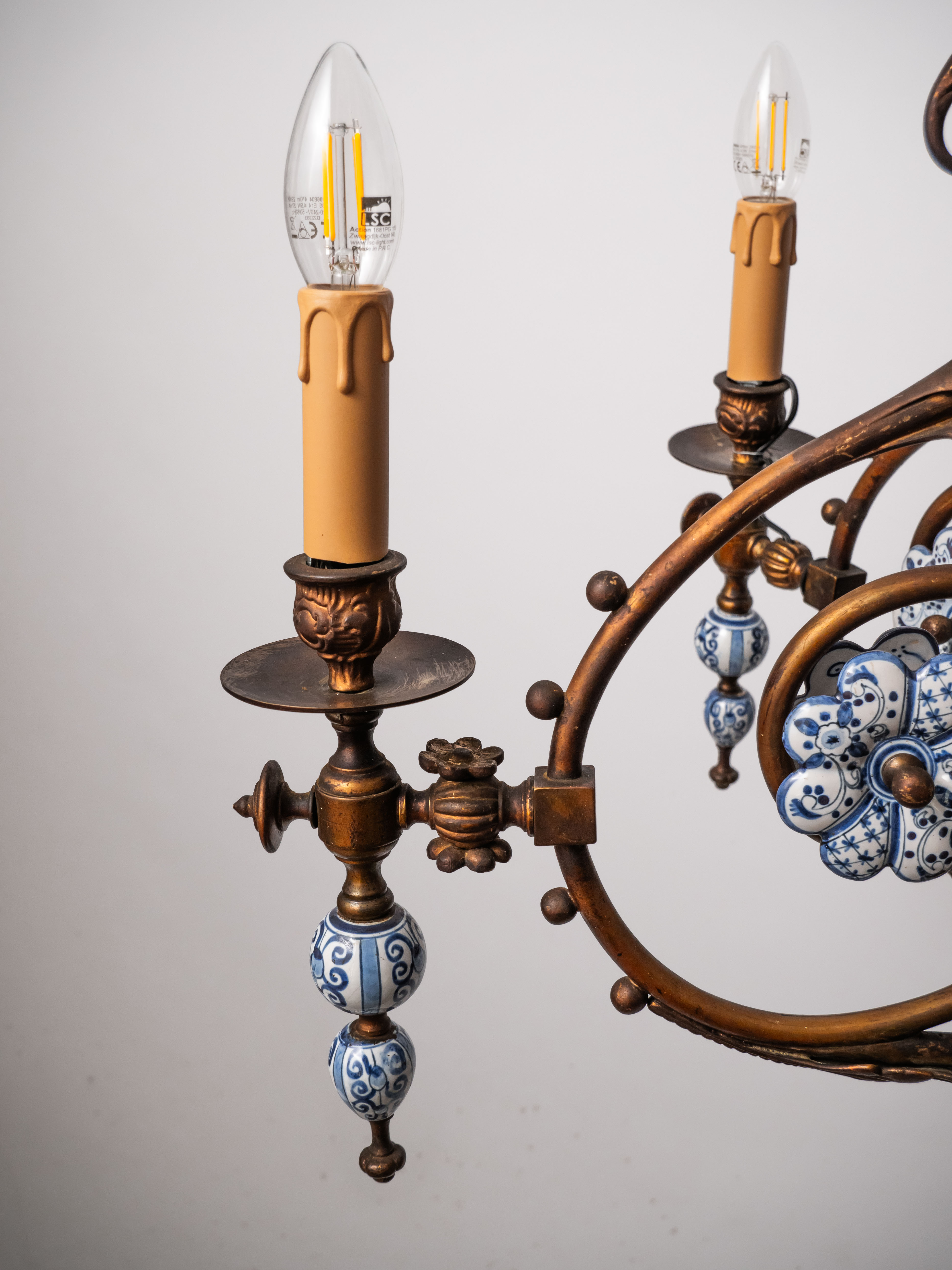 Delftský desetiramenný lustr z 19. století je krásným příkladem historického řemesla a designu. Původně fungoval na svítiplyn a na počátku 20. století byl modernizován na elektrické osvětlení. Lustr je nyní vybaven svíčkovými žárovkami s paticí E14 do 40 W – vhodné jsou normální, halogenové i LED žárovky, které napodobují vzhled tradičních svící.