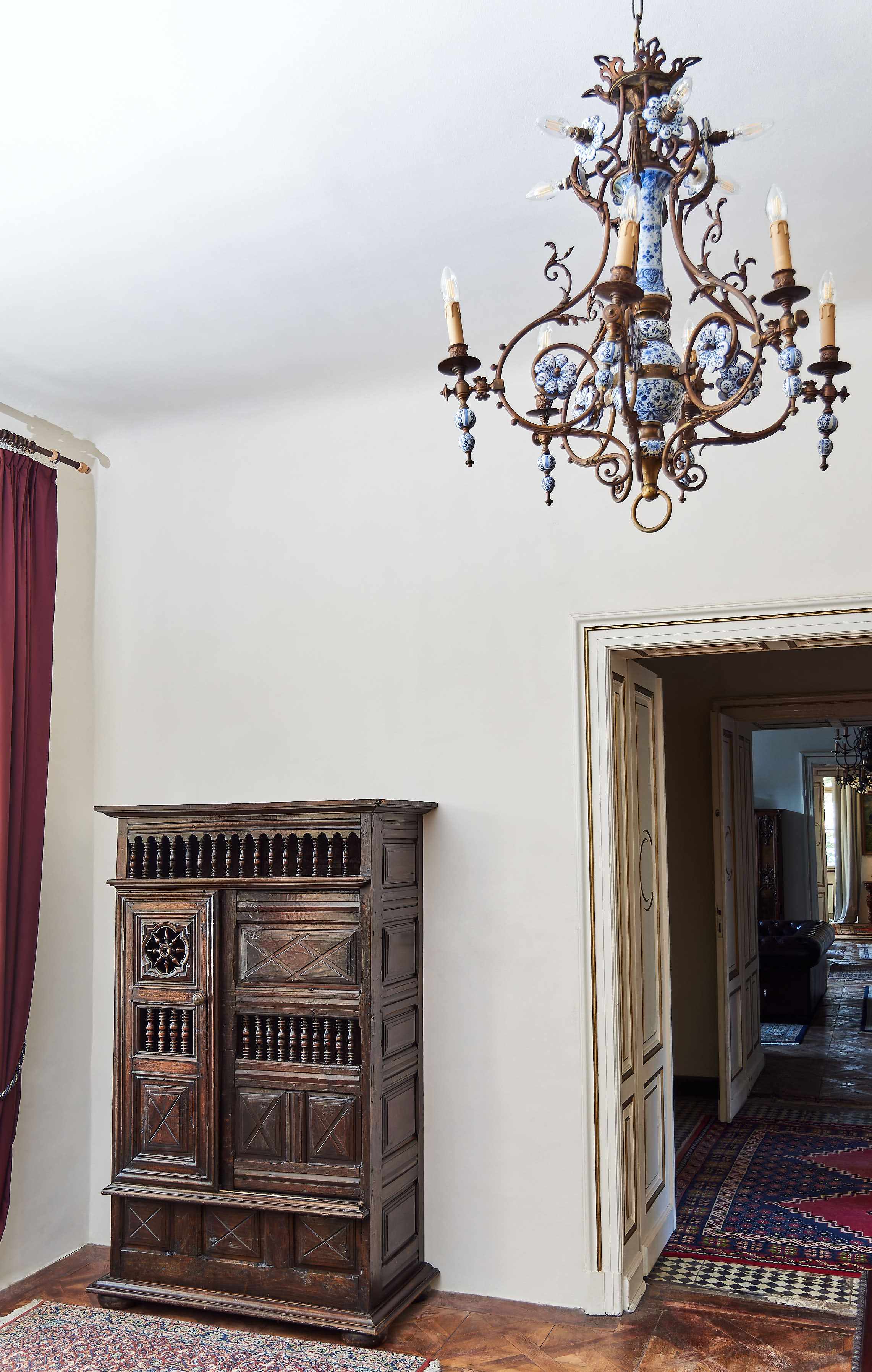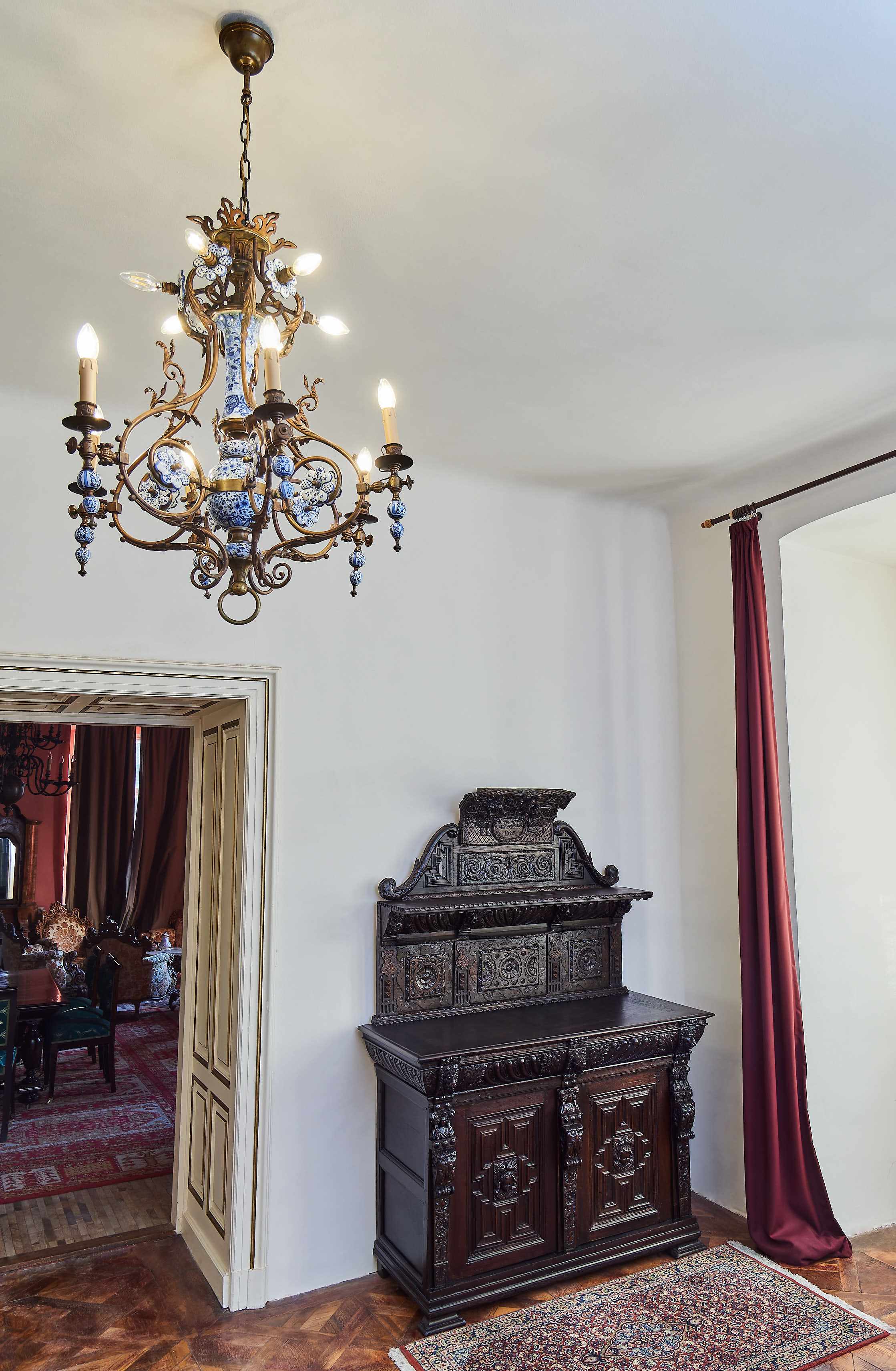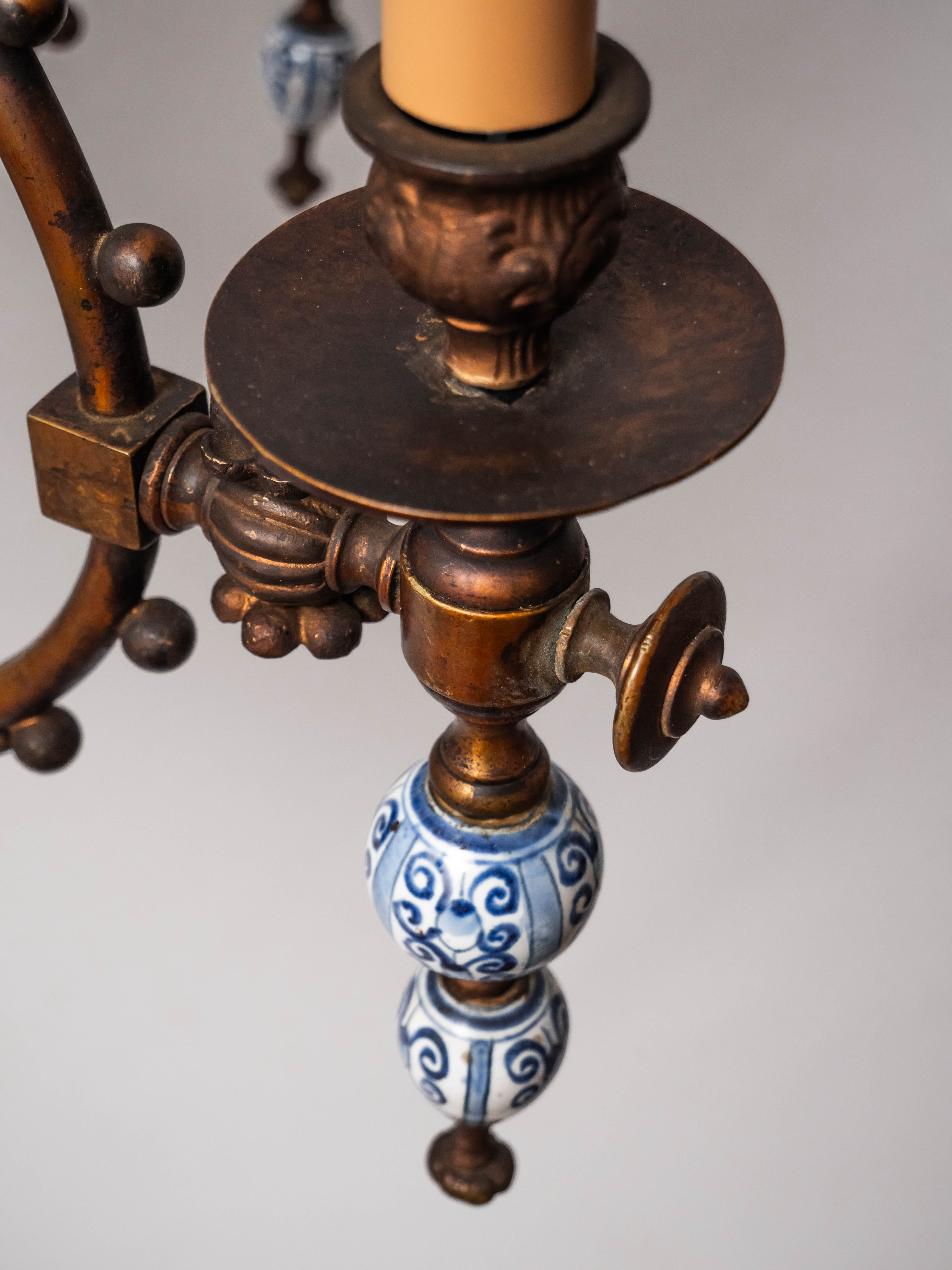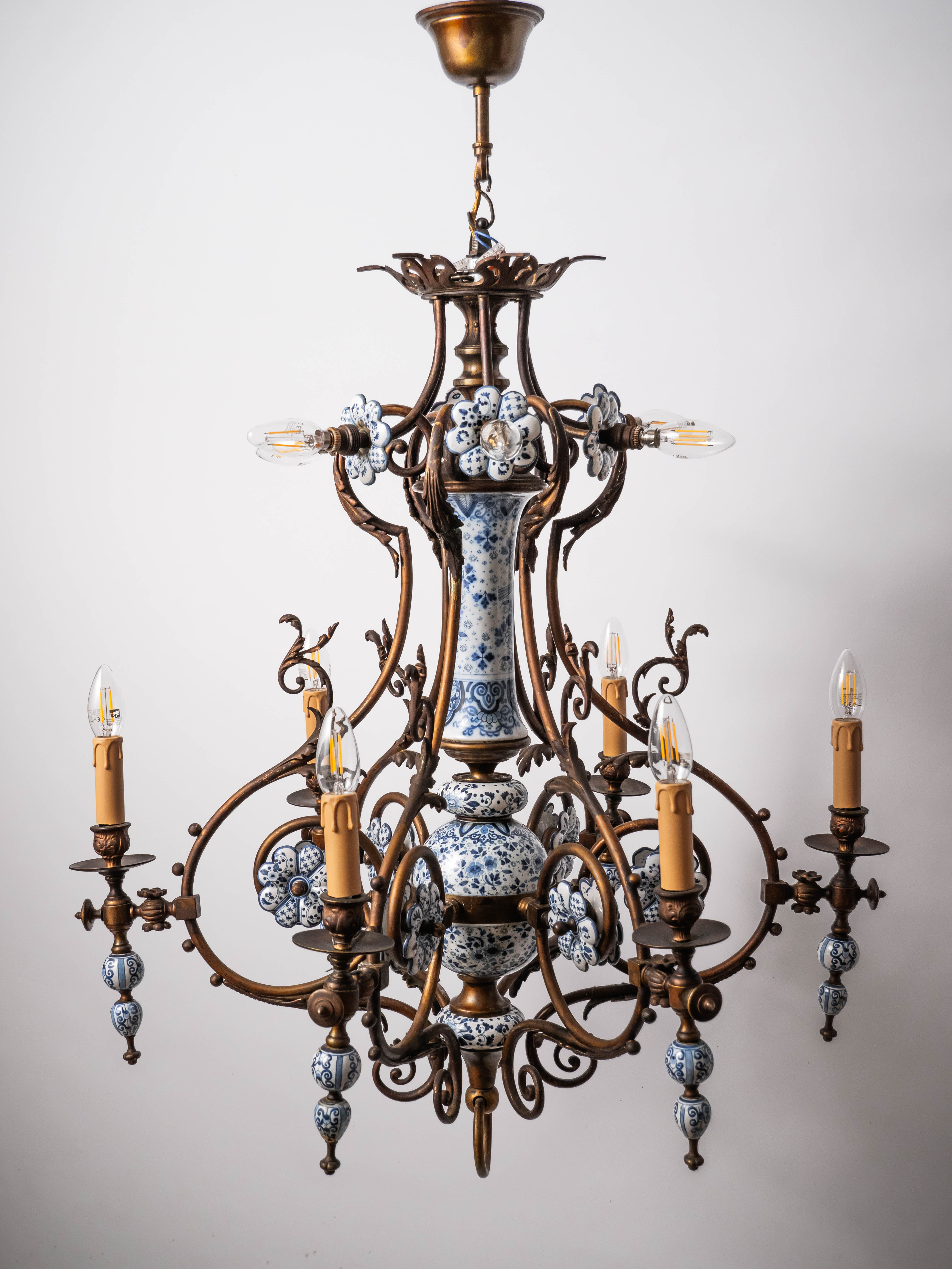 Delftský desetiramenný lustr z 19. století je krásným příkladem historického řemesla a designu. Původně fungoval na svítiplyn a na počátku 20. století byl modernizován na elektrické osvětlení. Lustr je nyní vybaven svíčkovými žárovkami s paticí E14 do 40 W – vhodné jsou normální, halogenové i LED žárovky, které napodobují vzhled tradičních svící.
