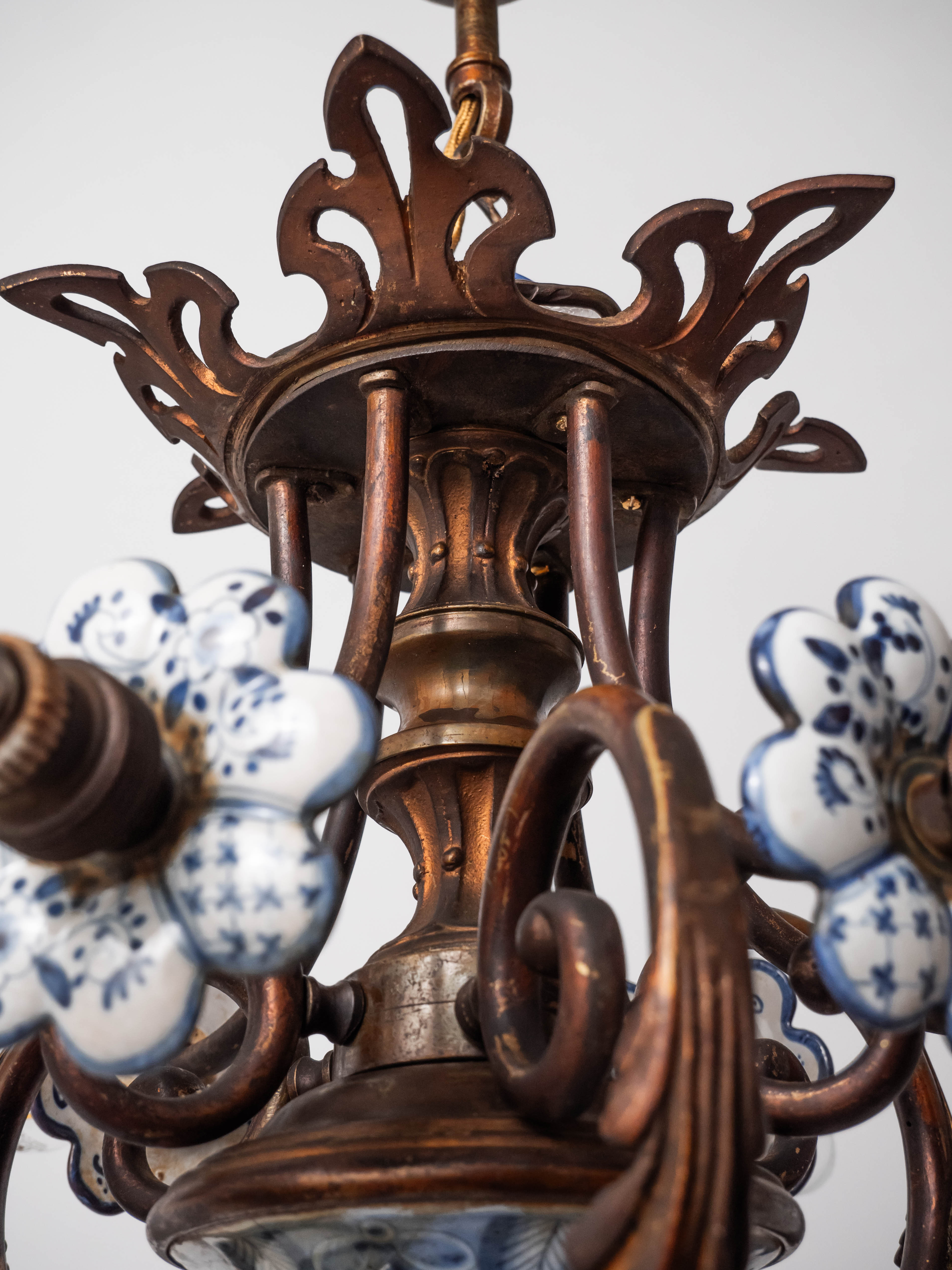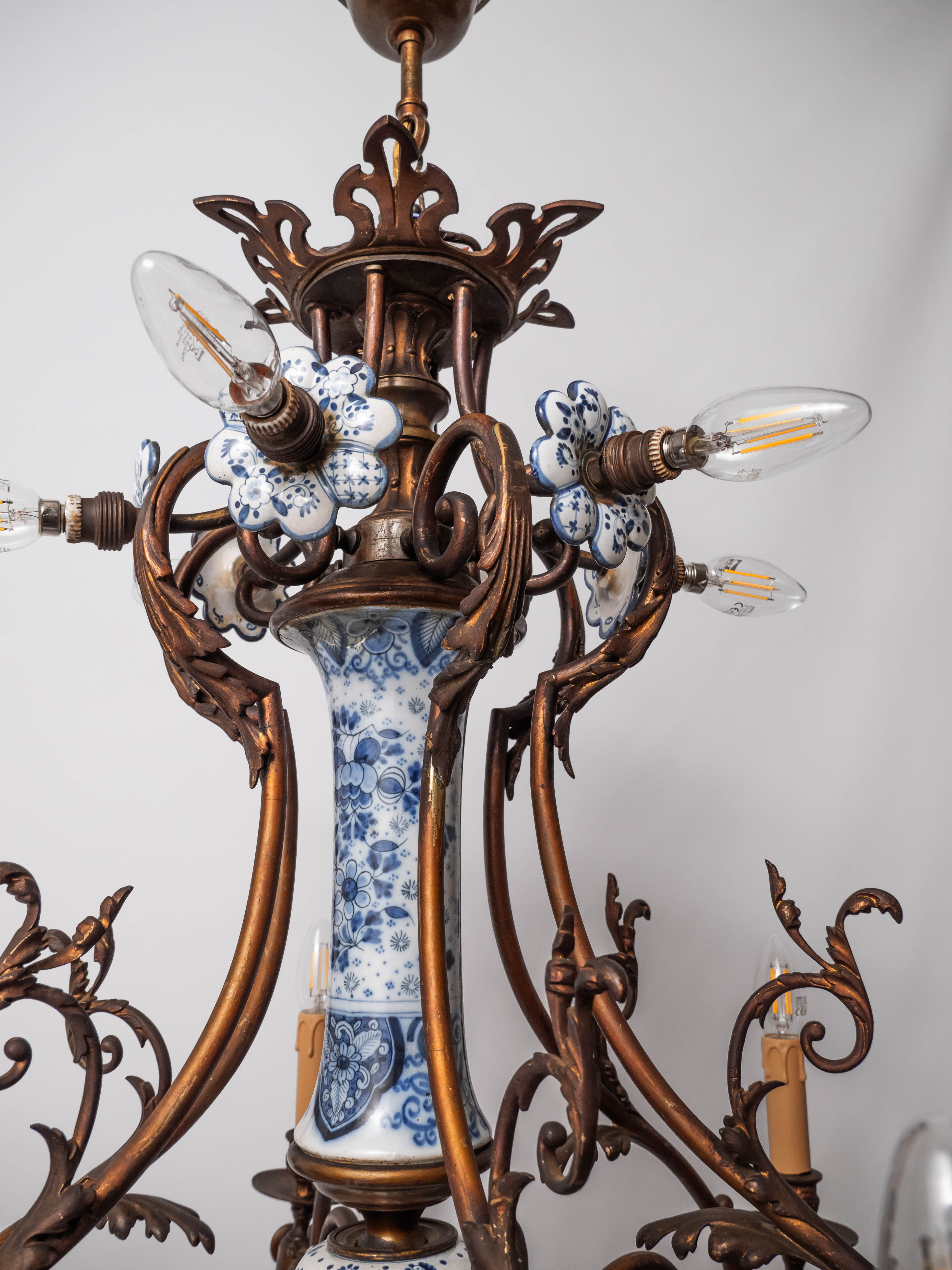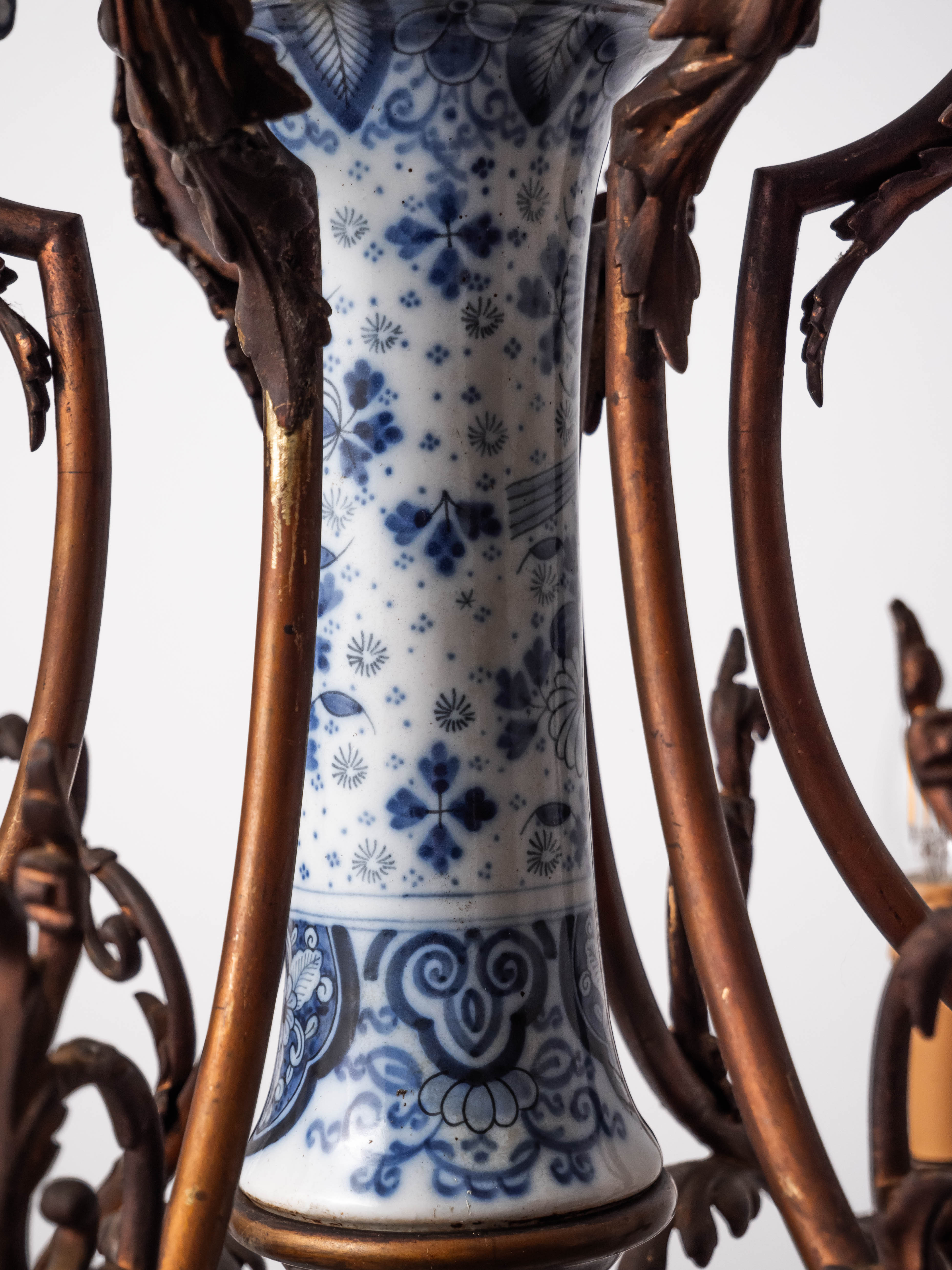 Lustr je vyroben z bronzu, což mu dodává pevnost a zároveň elegantní vzhled. Design lustru je bohatě zdobený s množstvím detailních ornamentů a zakřivených prvků, což je typické pro tuto éru. Lustr má centrální osovou část s několika rameny, které drží svíčkové žárovky. Každé rameno je propracovaně zdobeno jemnými detaily a ručně malovanými keramickými květinovými motivy v kobaltově modré barvě, což přispívá k celkové eleganci lustru.