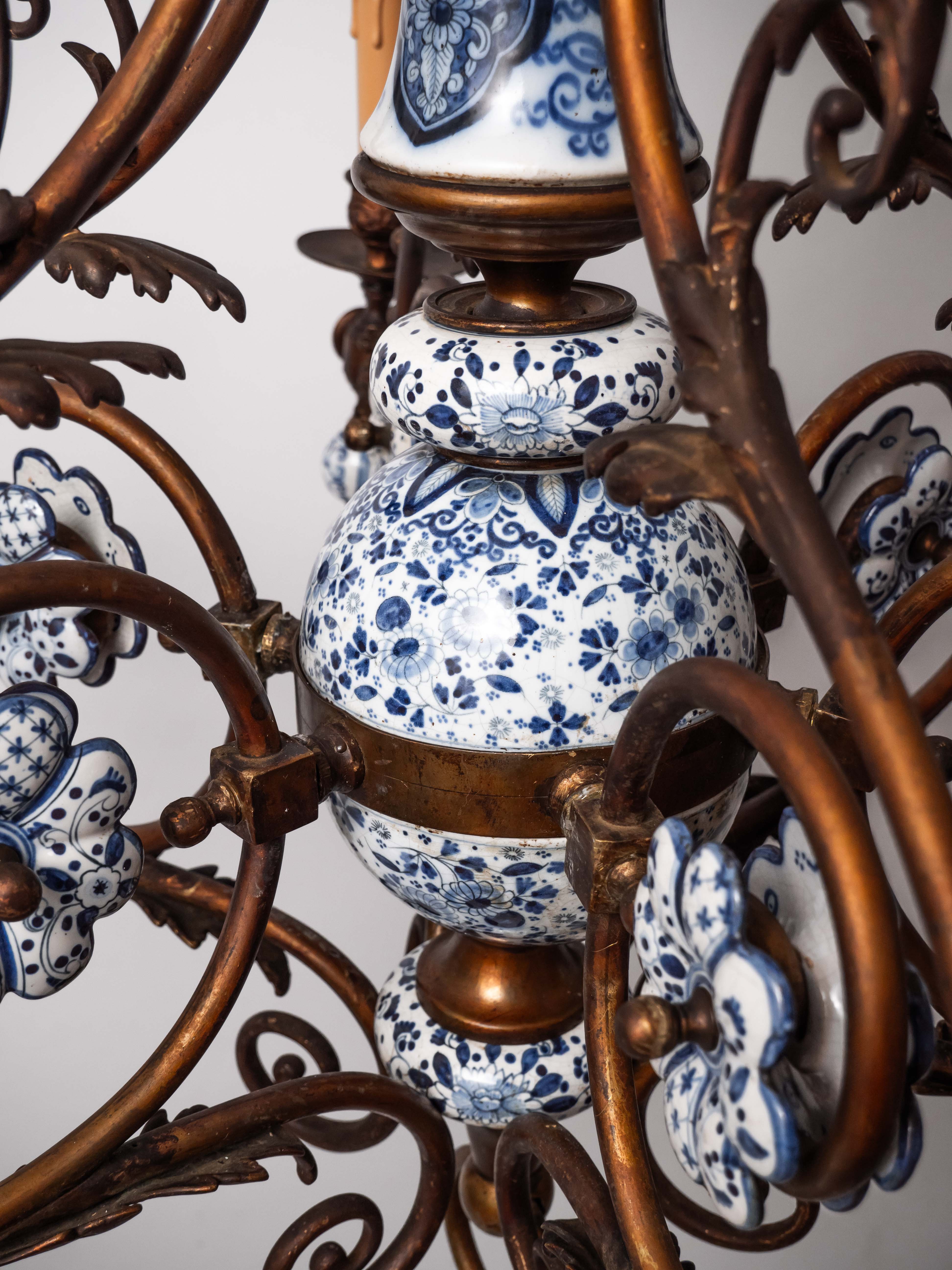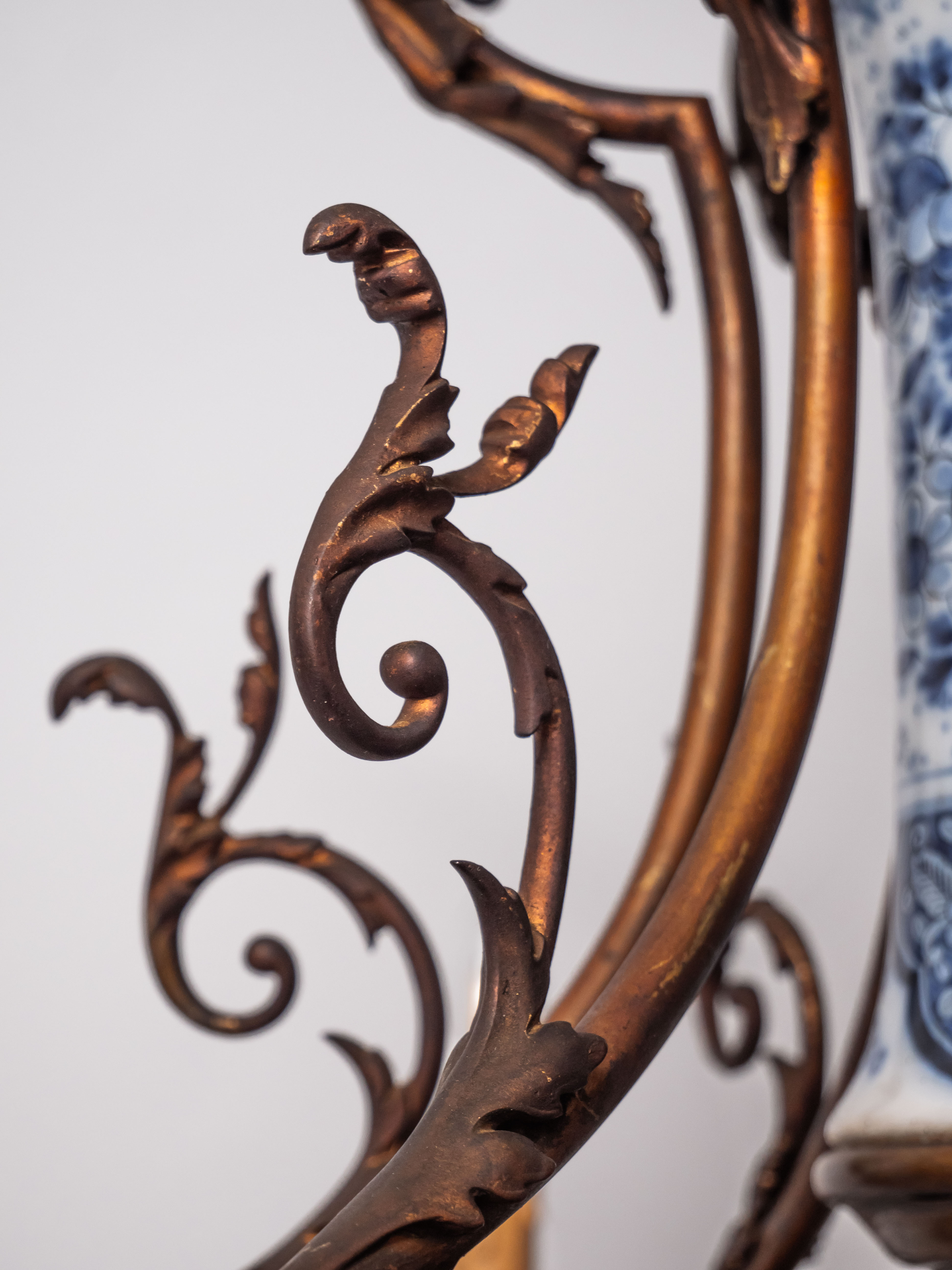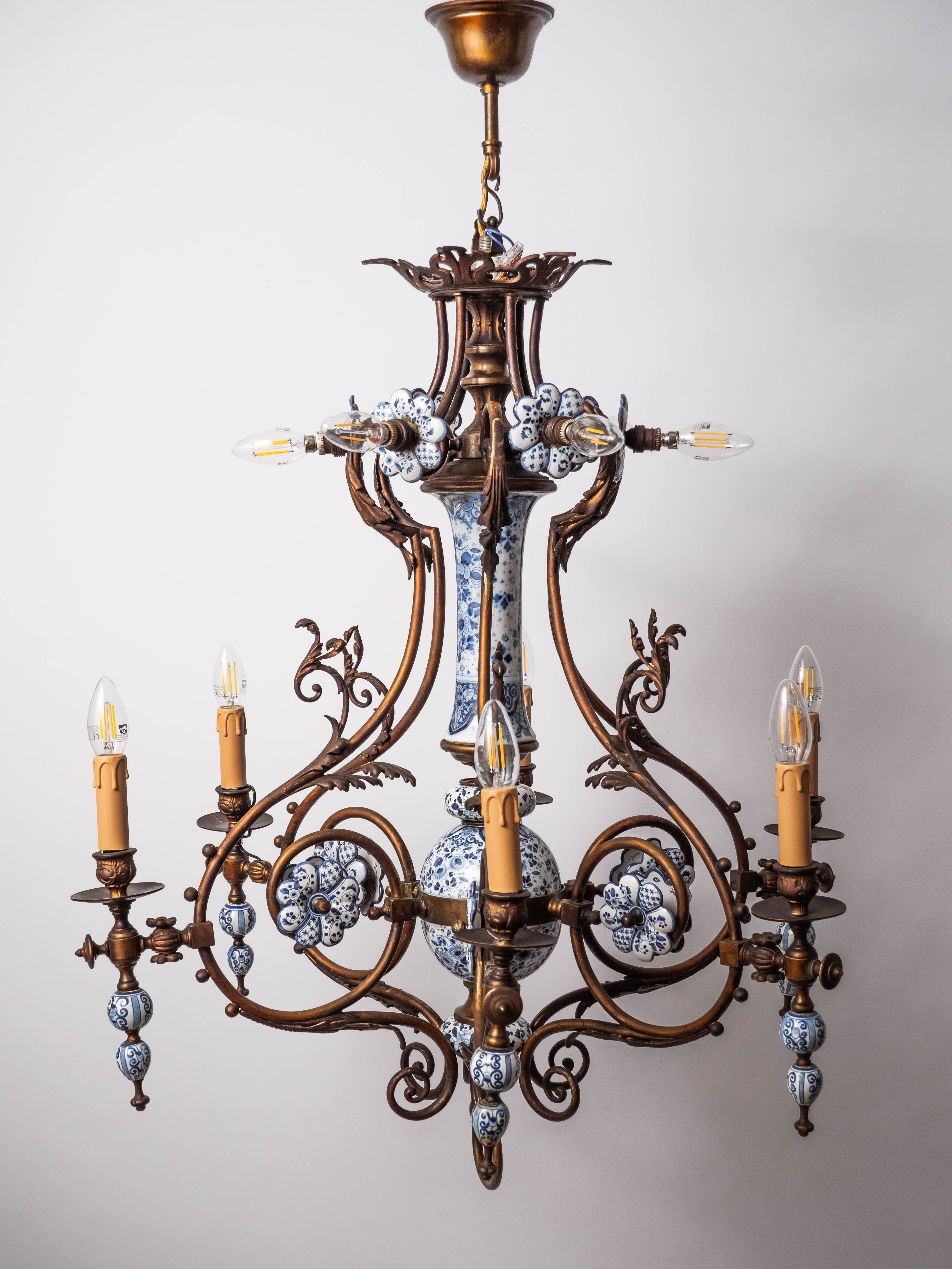 Lustr je vyroben z bronzu, což mu dodává pevnost a zároveň elegantní vzhled. Design lustru je bohatě zdobený s množstvím detailních ornamentů a zakřivených prvků, což je typické pro tuto éru. Lustr má centrální osovou část s několika rameny, které drží svíčkové žárovky. Každé rameno je propracovaně zdobeno jemnými detaily a ručně malovanými keramickými květinovými motivy v kobaltově modré barvě, což přispívá k celkové eleganci lustru.