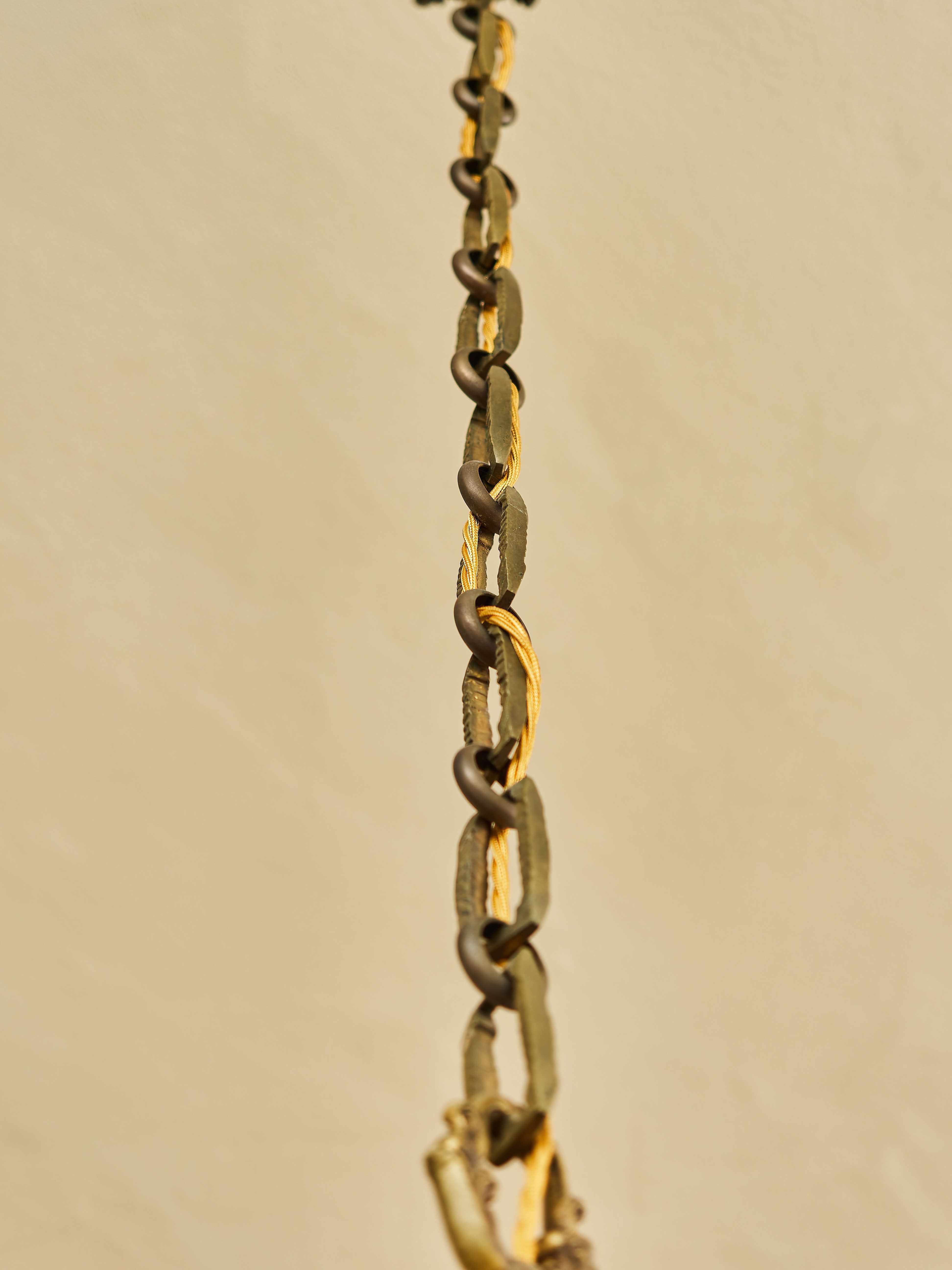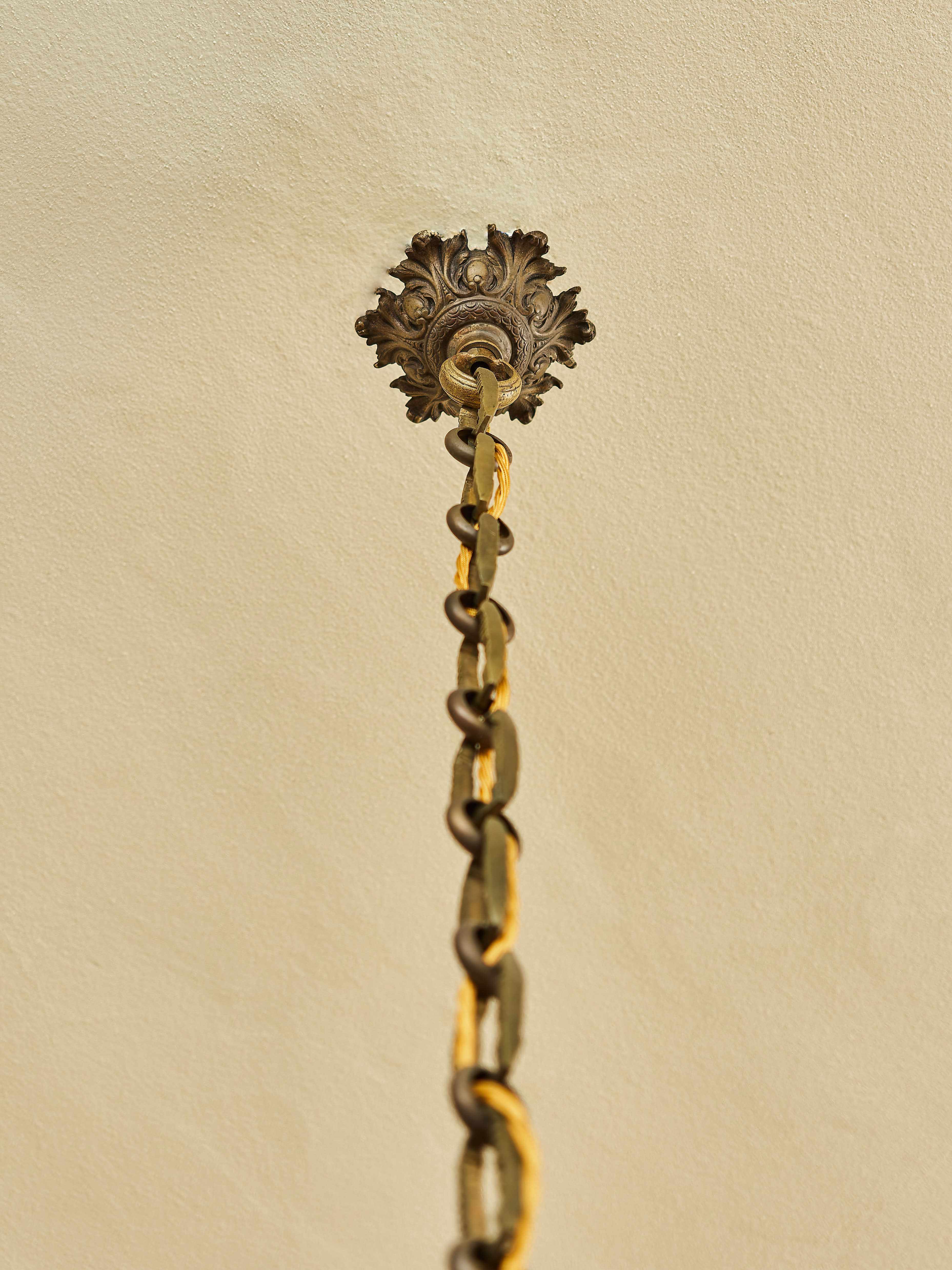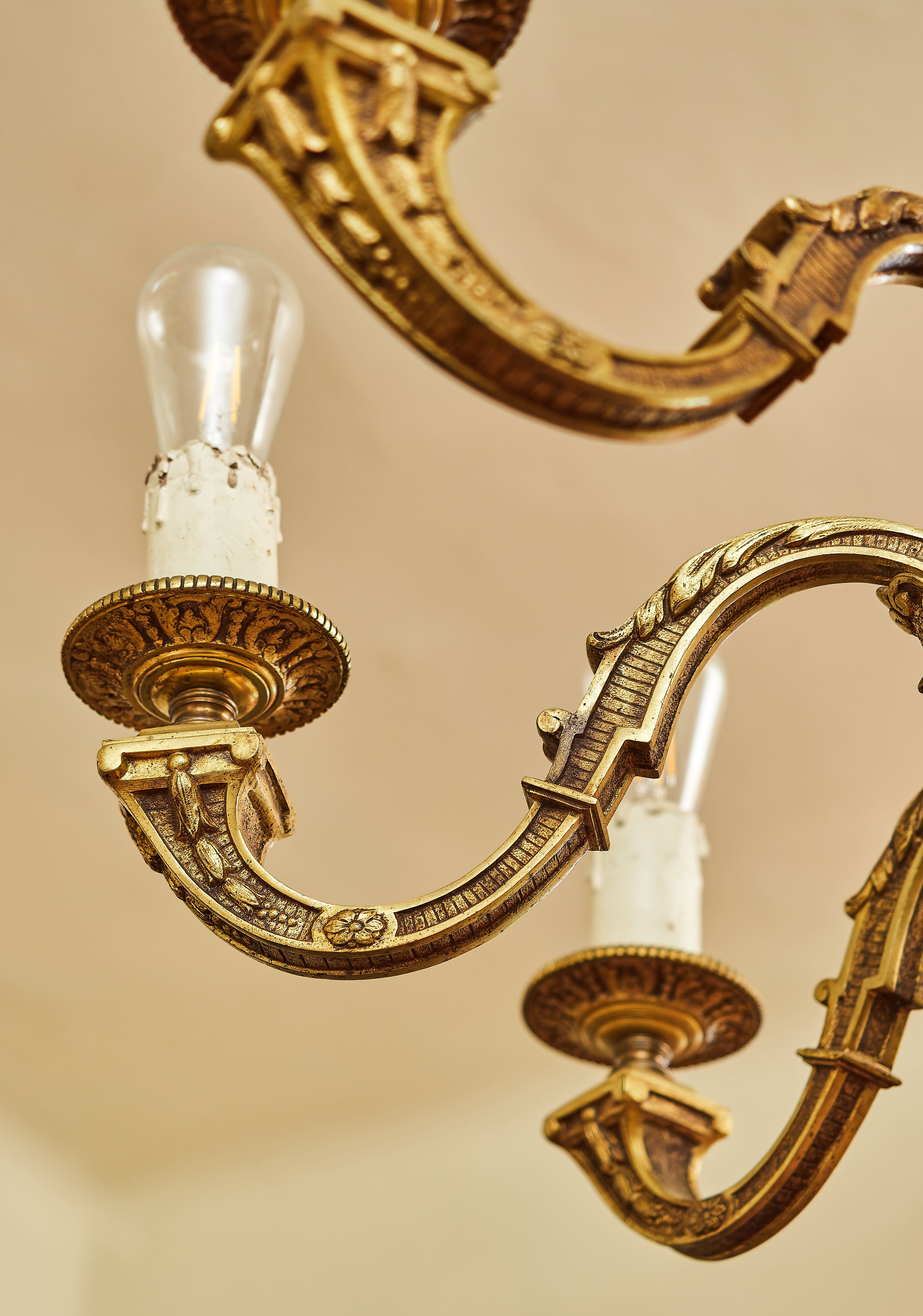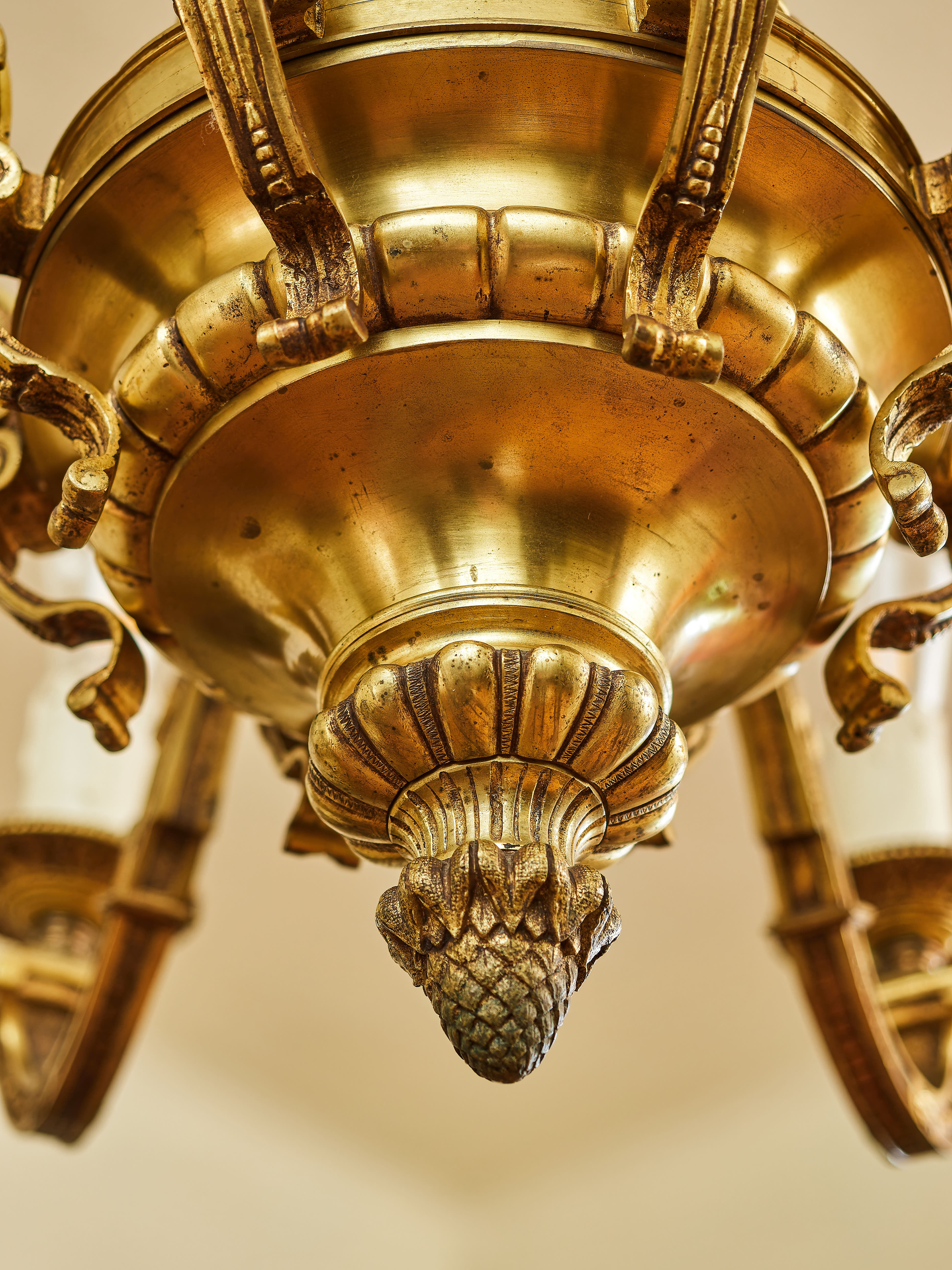 Centrální trup připomíná zdobenou vázovou formu s špičatým koncovým prvkem ve tvaru stylizované šišky (cul de lampe en graine), jemně modelovaný, typický pro francouzské lustry této kategorie. Lustr je kompletně elektrován – paticové provedení E27 umožňuje nasazení běžných žárovek, čímž se snadno adaptuje na moderní použití. Vzácné zachování malých detailů, jako jsou původní články řetězu s profilovanou rozetou, svědčí o vynikající zachovalosti.