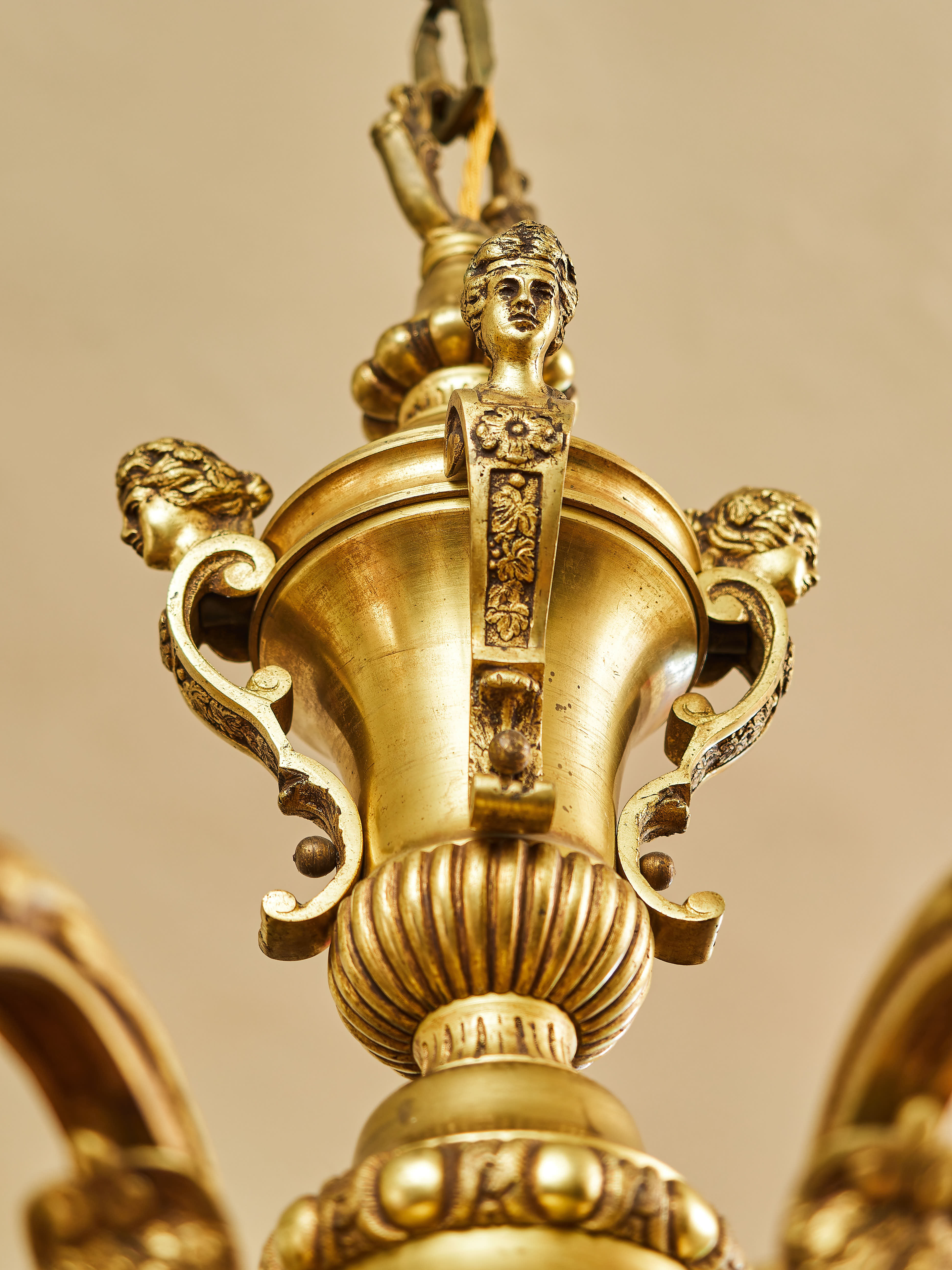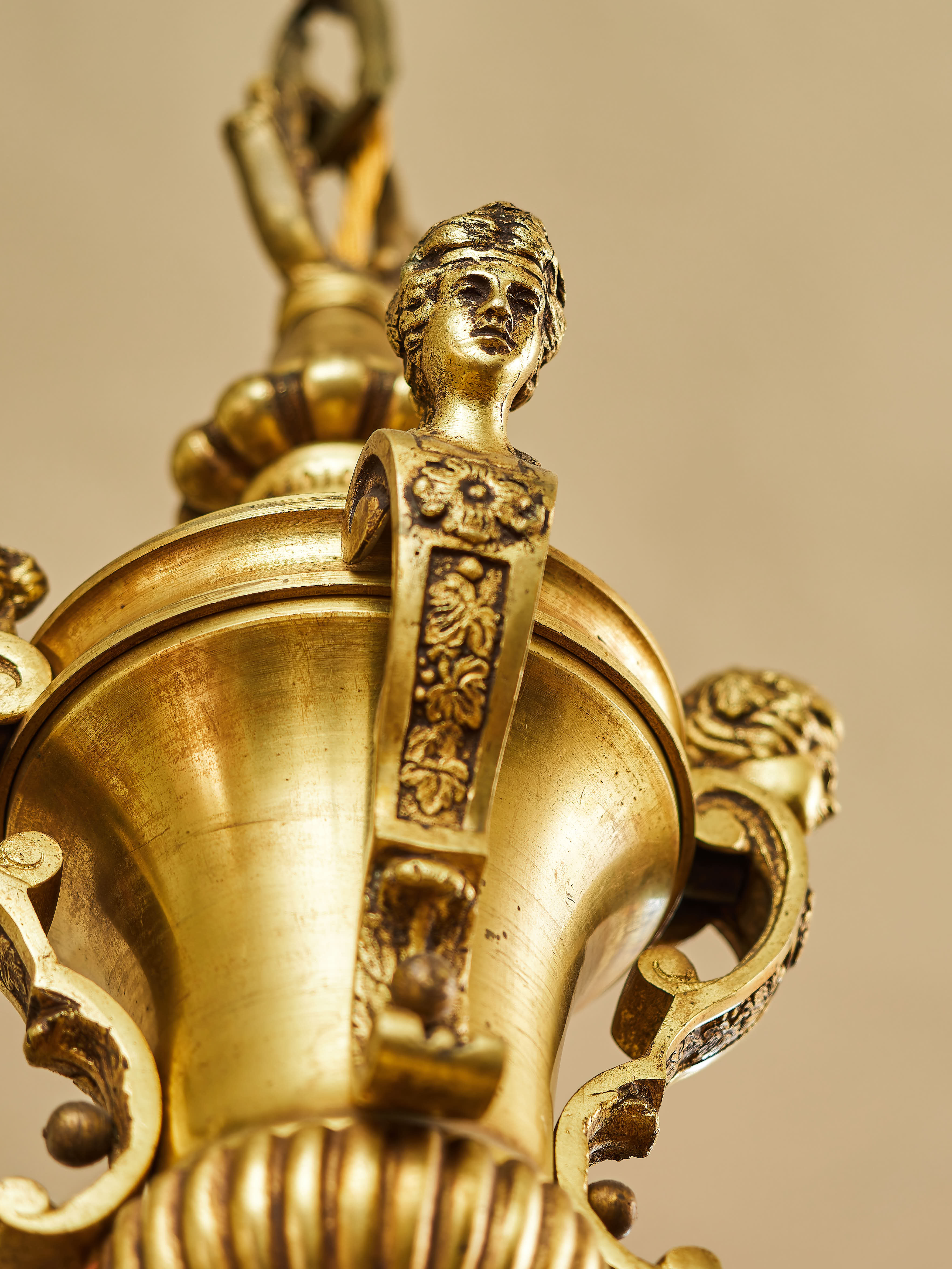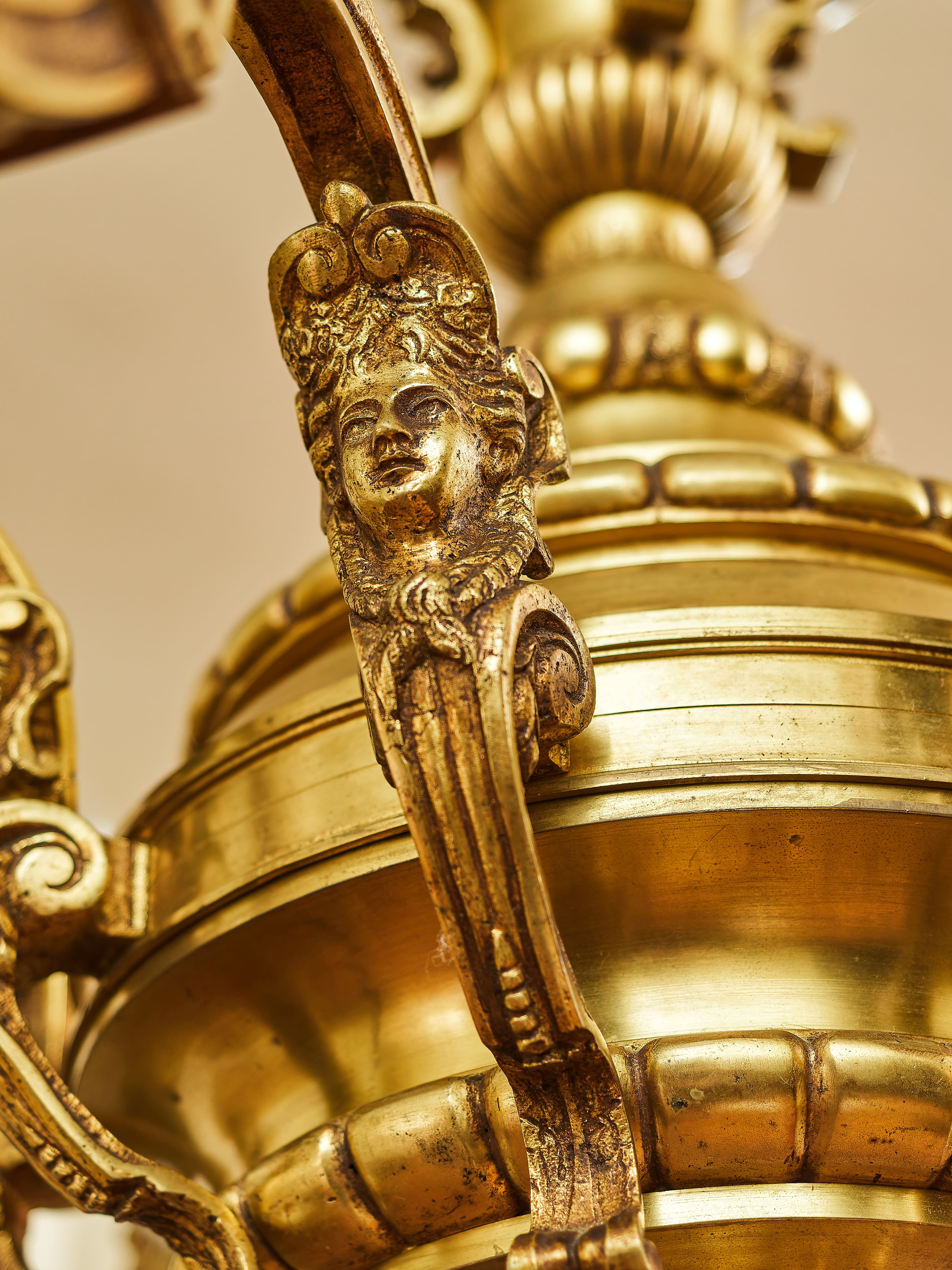 Reprezentativní osmiramenný lustr ve stylu Mazarin, francouzského původu, z období druhé poloviny 19. století (kolem 1880). Konstrukce je celá z nejkvalitnějšího bronzu s bohatým ciselovaným dekorom, pokryta jemně zlaceným povrchem technique doré. Ramena se rozvětvují do tvaru volut ve čtvercovém průřezu, bohatě zdobené akantovými listy, květinovými motivy a plastickými ženskými hlavami, často naznačující mytologické či groteskní postavy – typicky oblíbené v rámci stylu Louis XIV, jak je doloženo u obdobných exemplářů inspirovaných tvorbou André‑Charles Boulle.