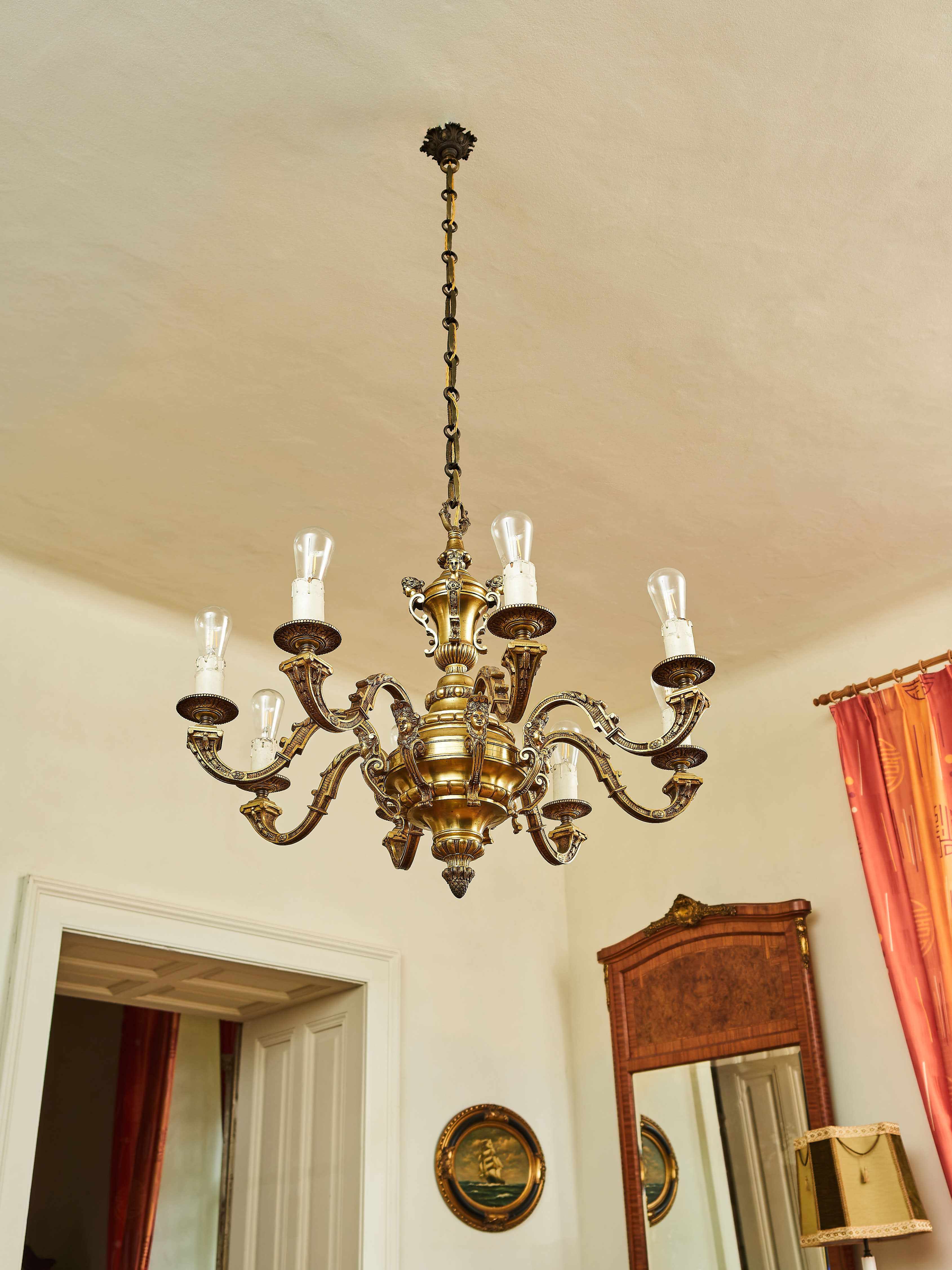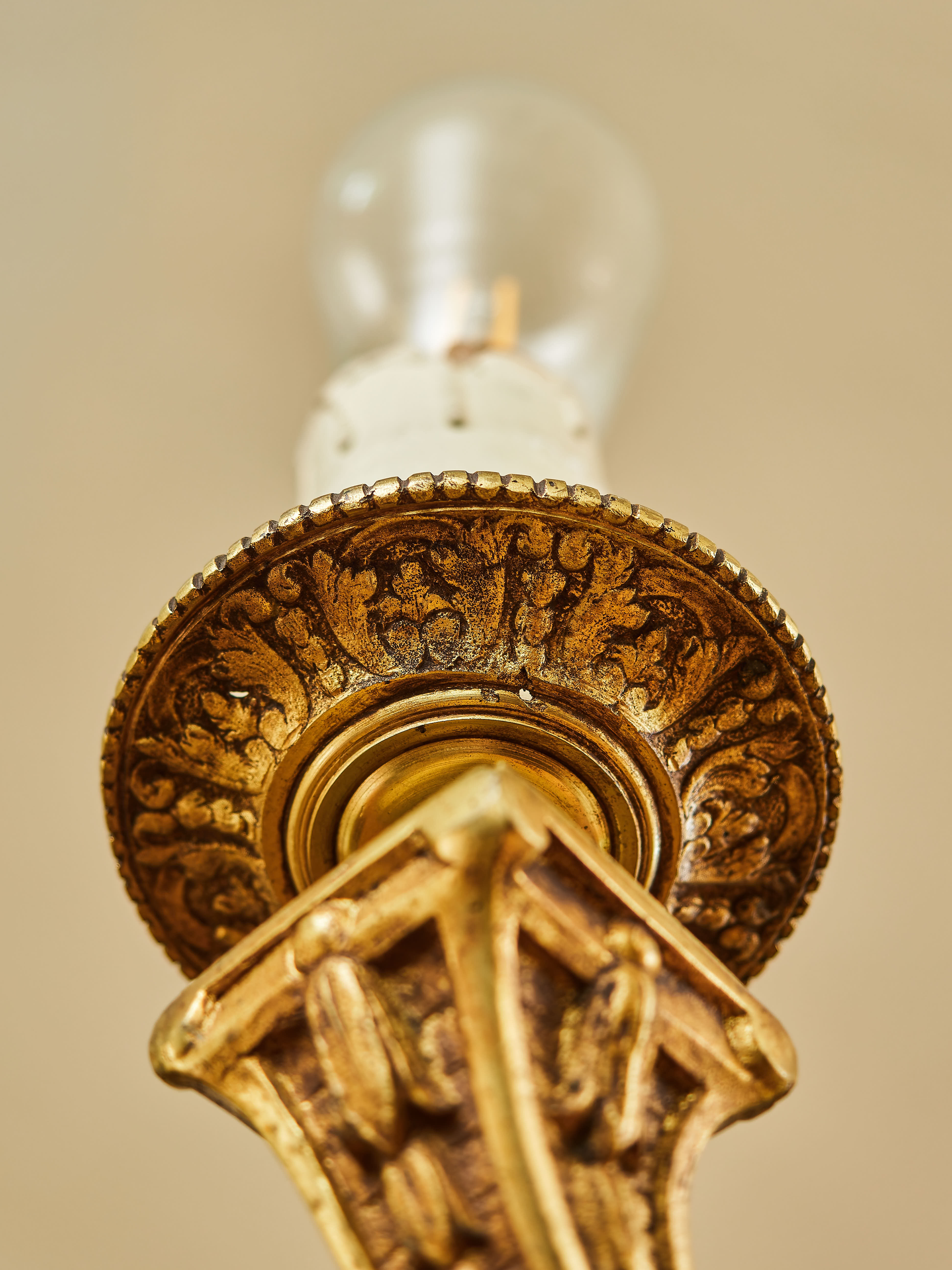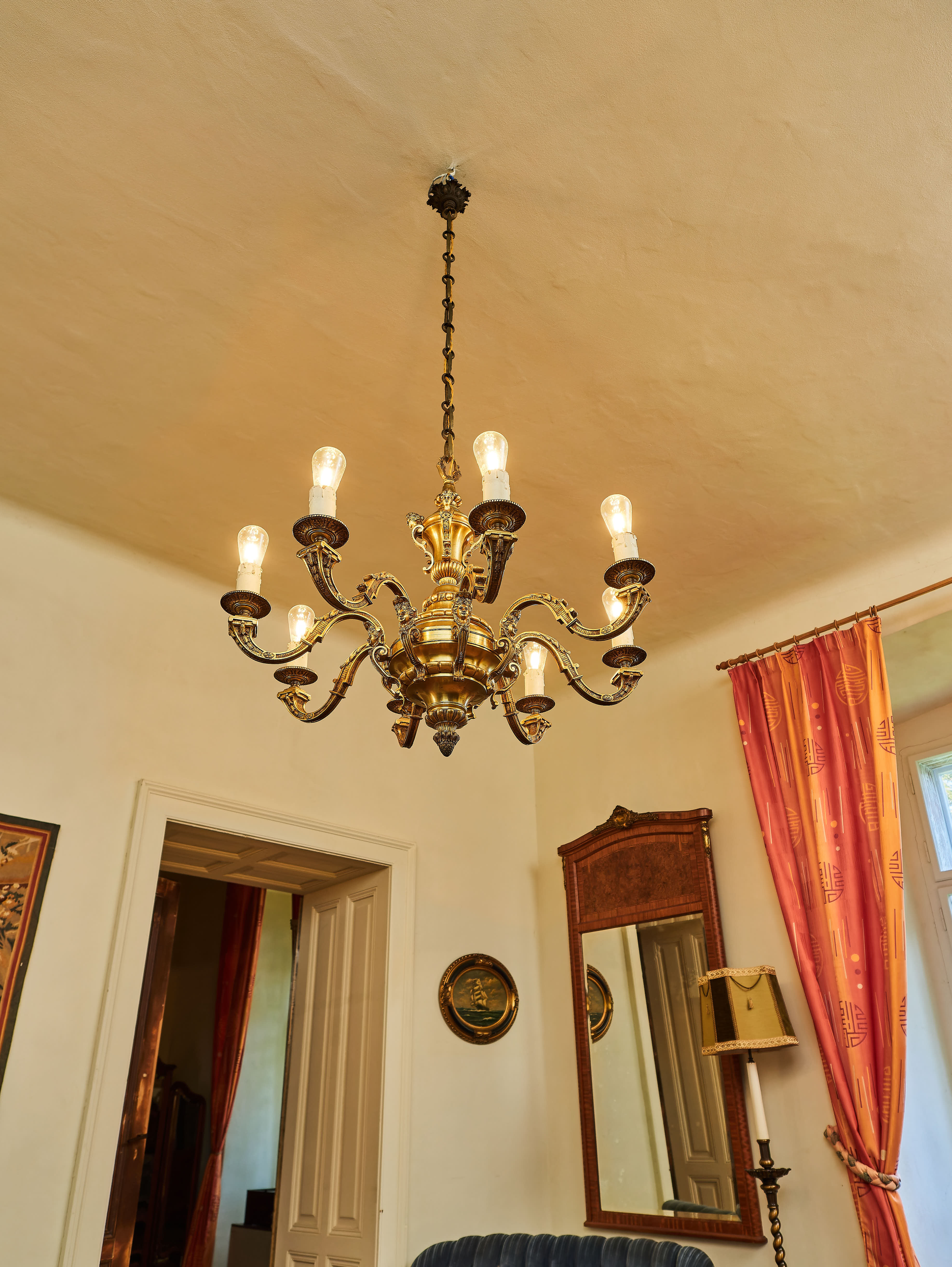 Reprezentativní osmiramenný lustr ve stylu Mazarin, francouzského původu, z období druhé poloviny 19. století (kolem 1880). Konstrukce je celá z nejkvalitnějšího bronzu s bohatým ciselovaným dekorom, pokryta jemně zlaceným povrchem technique doré. Ramena se rozvětvují do tvaru volut ve čtvercovém průřezu, bohatě zdobené akantovými listy, květinovými motivy a plastickými ženskými hlavami, často naznačující mytologické či groteskní postavy – typicky oblíbené v rámci stylu Louis XIV, jak je doloženo u obdobných exemplářů inspirovaných tvorbou André‑Charles Boulle.