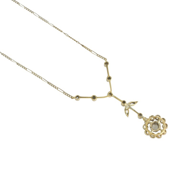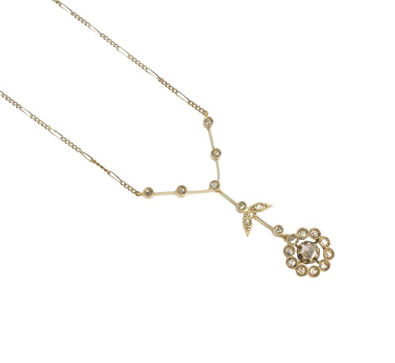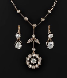 Starožitná secesní souprava, náhrdelník a náušnice osazené přírodními diamany routového brusu,