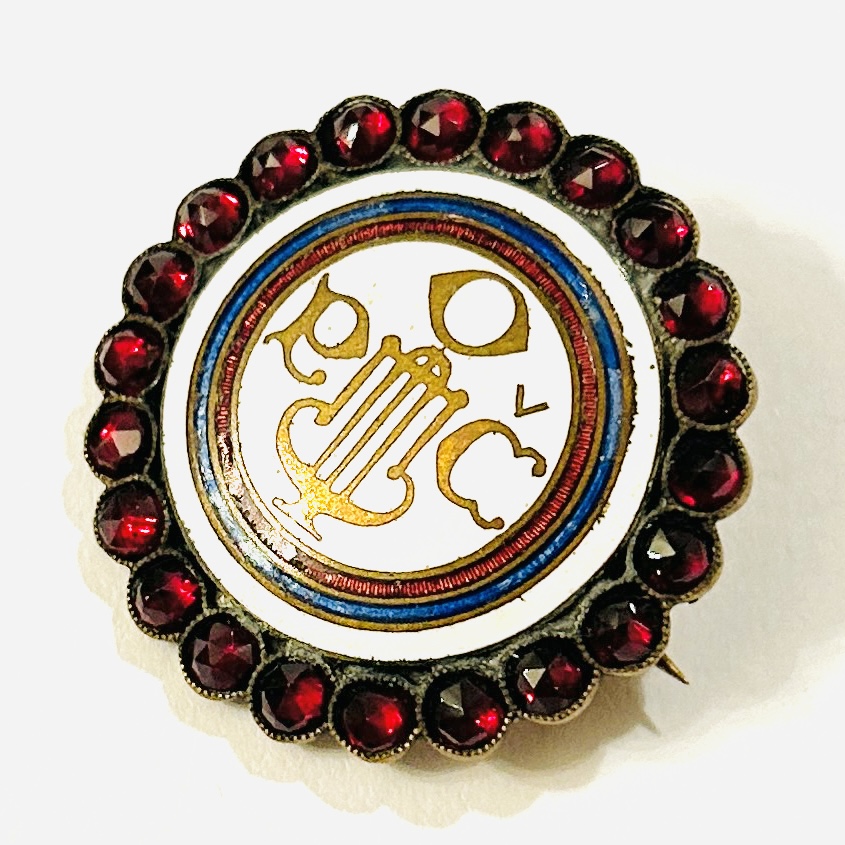 Starožitný, málo vídaný odznak/brož Pěvecké obce české, jejíž logotyp je provedený v barevném smaltu, rámeček osázen českými granáty kulatého routového brusu, fasováno v zrnitých obrubách. Udíleno jako výroční (?) členský či památeční odznak, existují varianty i ve stříbře či bez granátového orámování. Kvalitní tuzemská práce z první třetiny 20. století. Sběratelsky zajímavé.