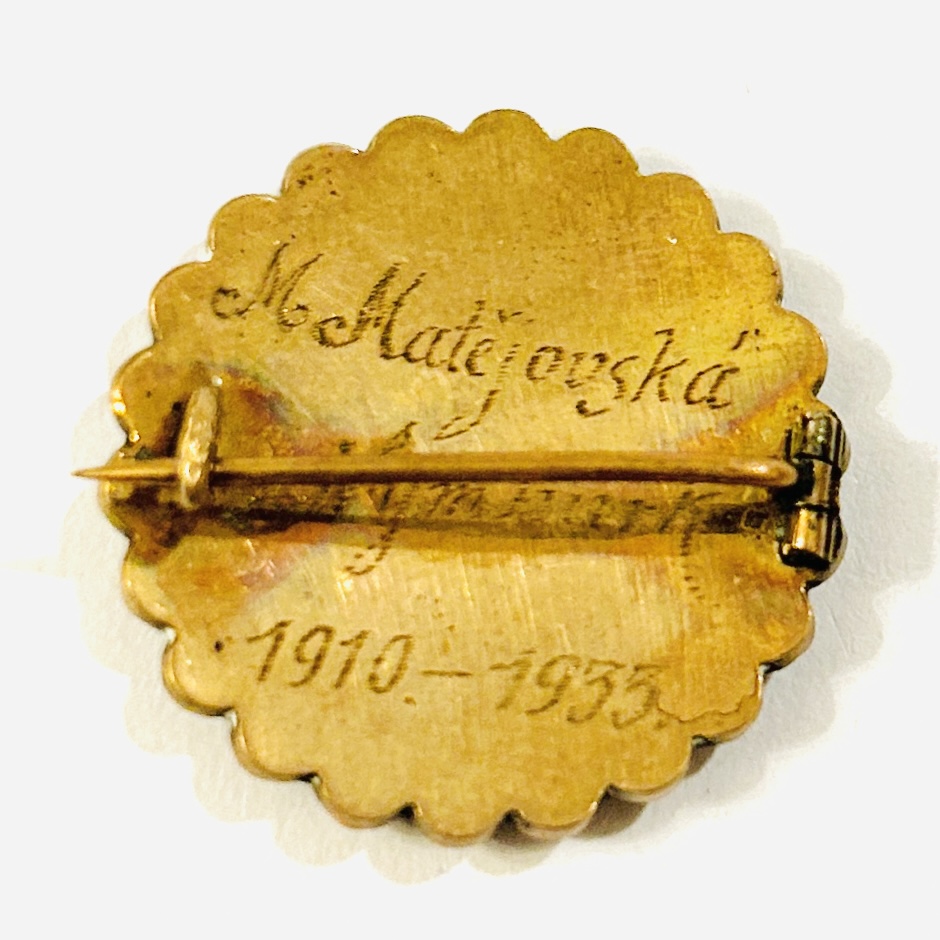 Zasazeno ve slitině tombaku; neznačeno, dedikace \“M. Matějovská Nymburk 1910.-1933.\“ zezadu. Hmotnost 6,24 g, průměr 28,5 mm. Zapínání na \“C\“ sponu v pořádku, ponecháno s přirozenou patinou, v zachovalém stavu.