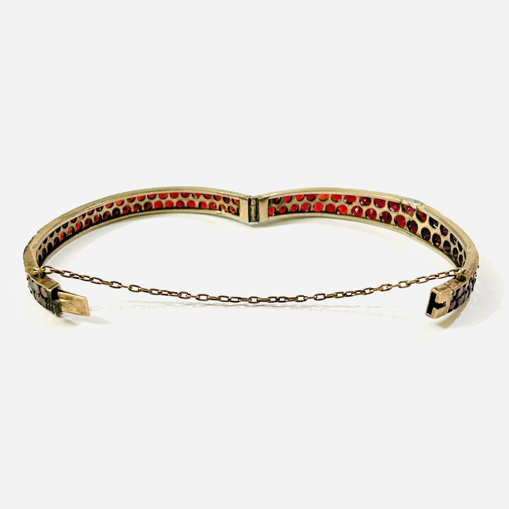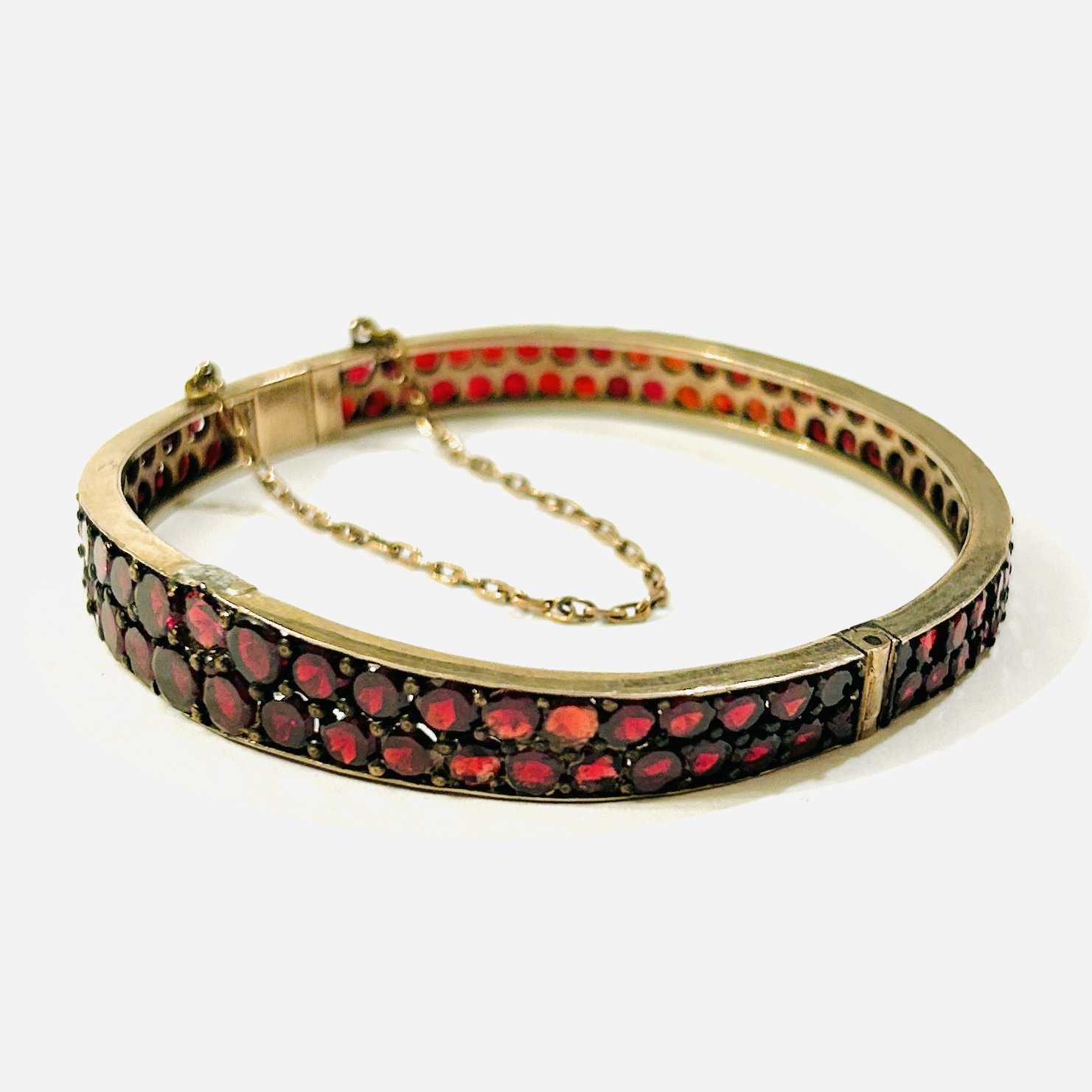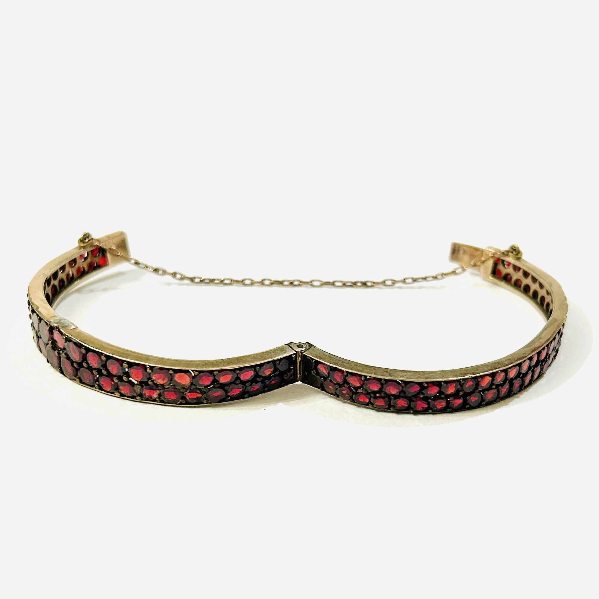 Starožitný, efektní otevírací náramek s rozšiřující se horní polovinou, po celém obvodu osazeno ve dvou řadách přírodními českými granáty kulatého plochého brusu, fasováno nýtkovou technikou, kameny opatřeny průsvitakmi pro jejich lepší podsvícení. Precizní tuzemská granátnická práce z poslední pětiny 19. století.