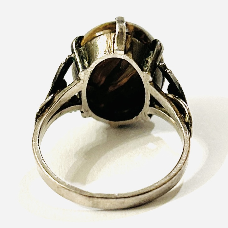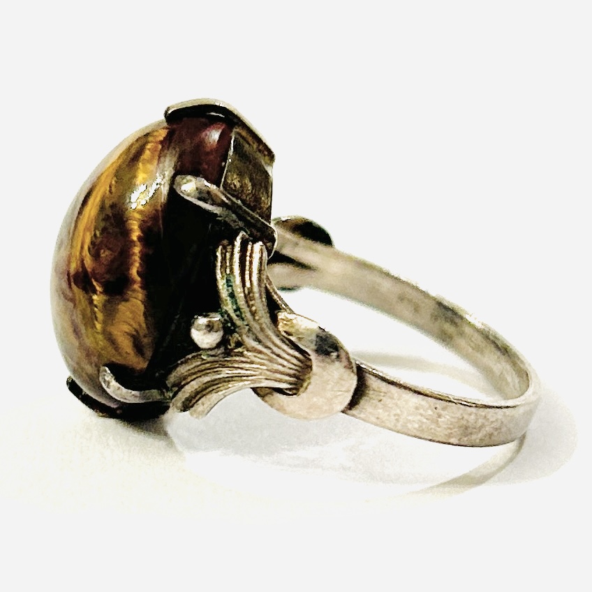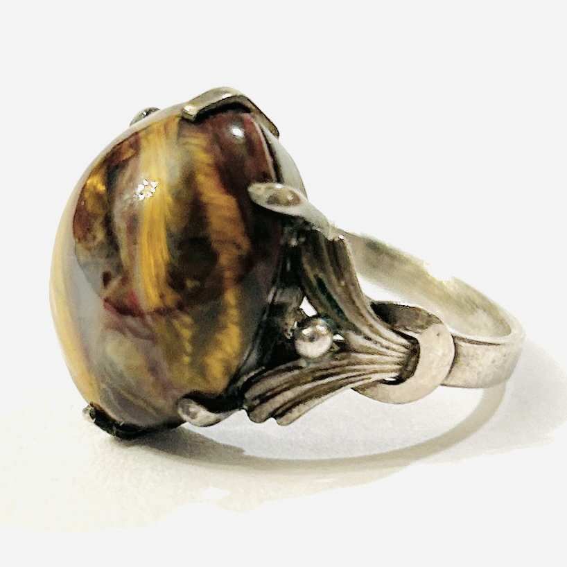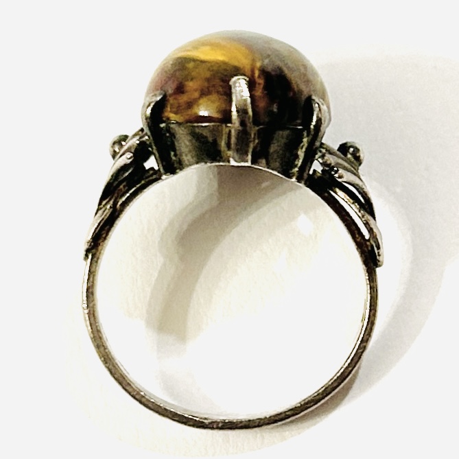 Výrazný prsten osazený zřídka se vyskytující odrůdou červeného achátu s tygřím okem, oválná mugle fasována šesti krapnami, přístavky šíny v art-de o tvarosloví. Kvalitní, patrně západoevropská zlatnická práce z druhé třetiny 20. století, dovezená na naše území ve stejném období.
