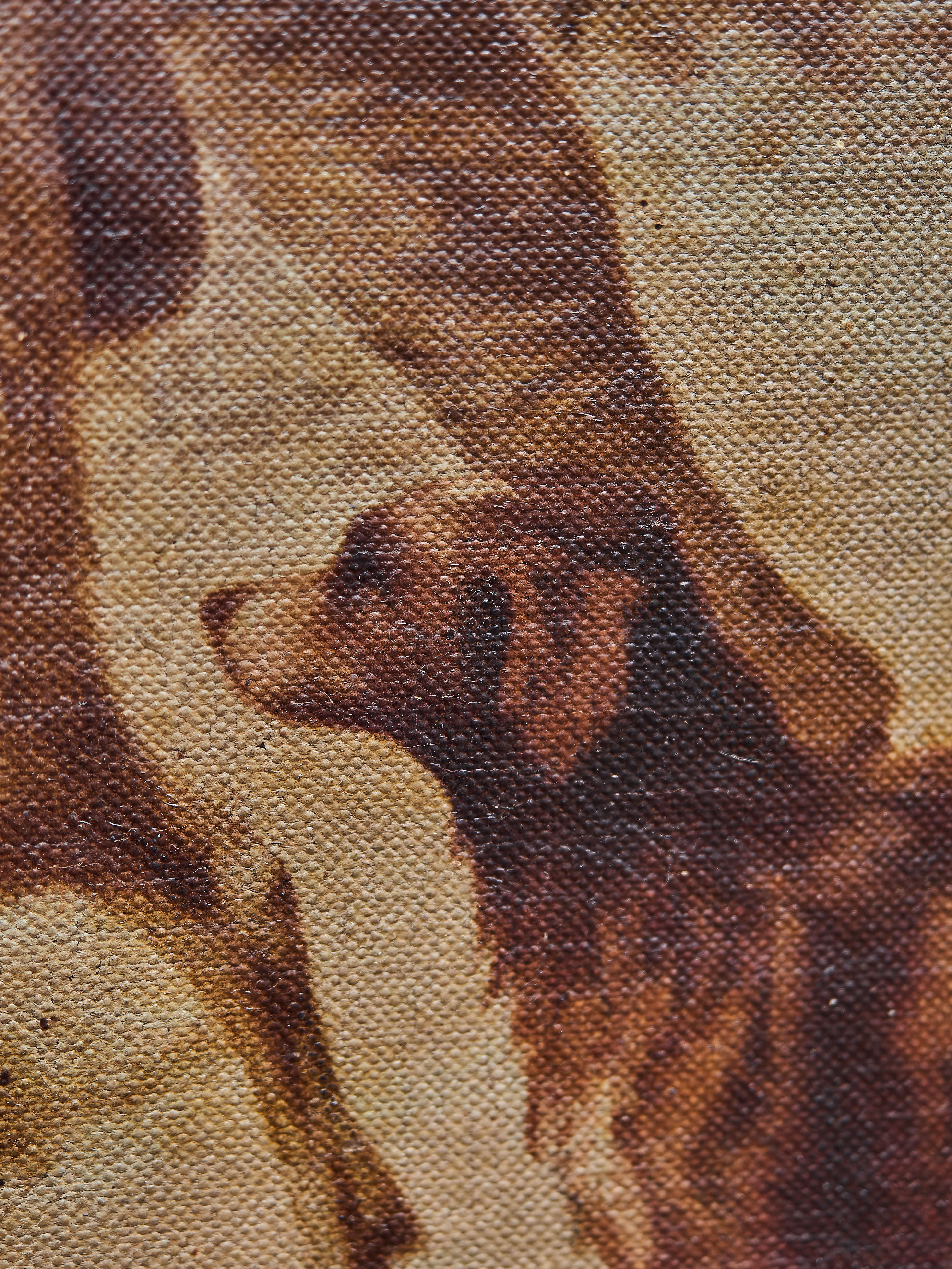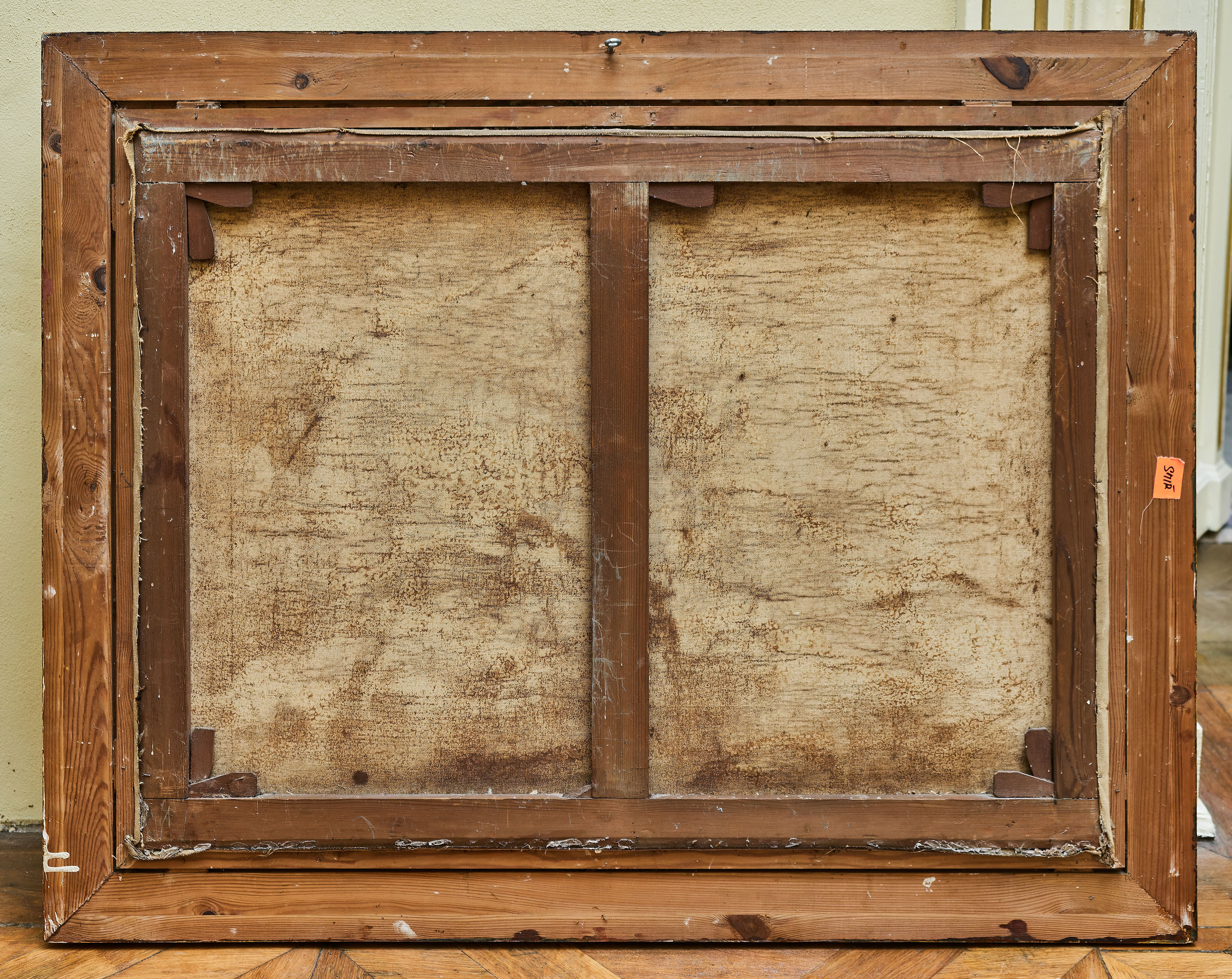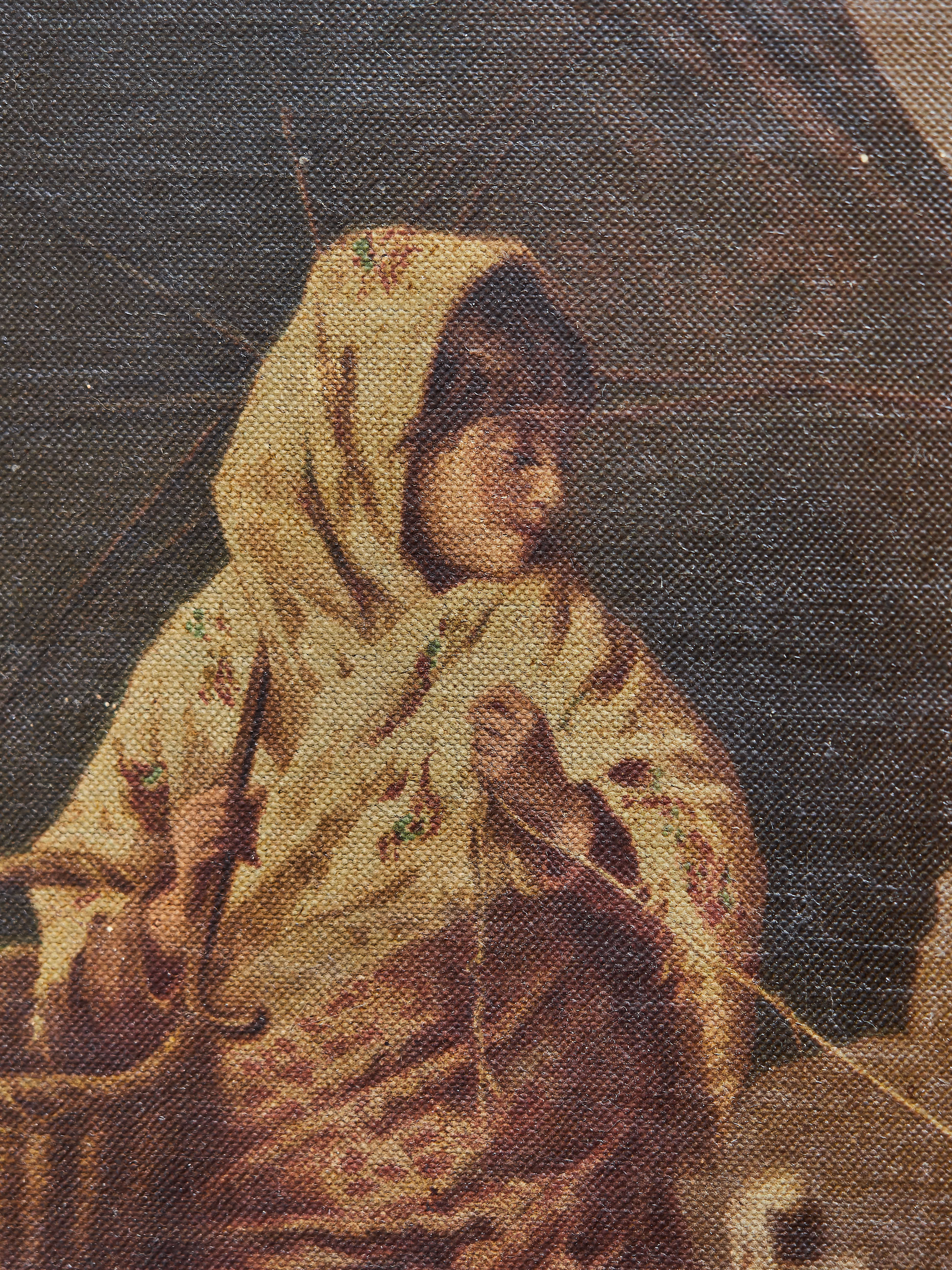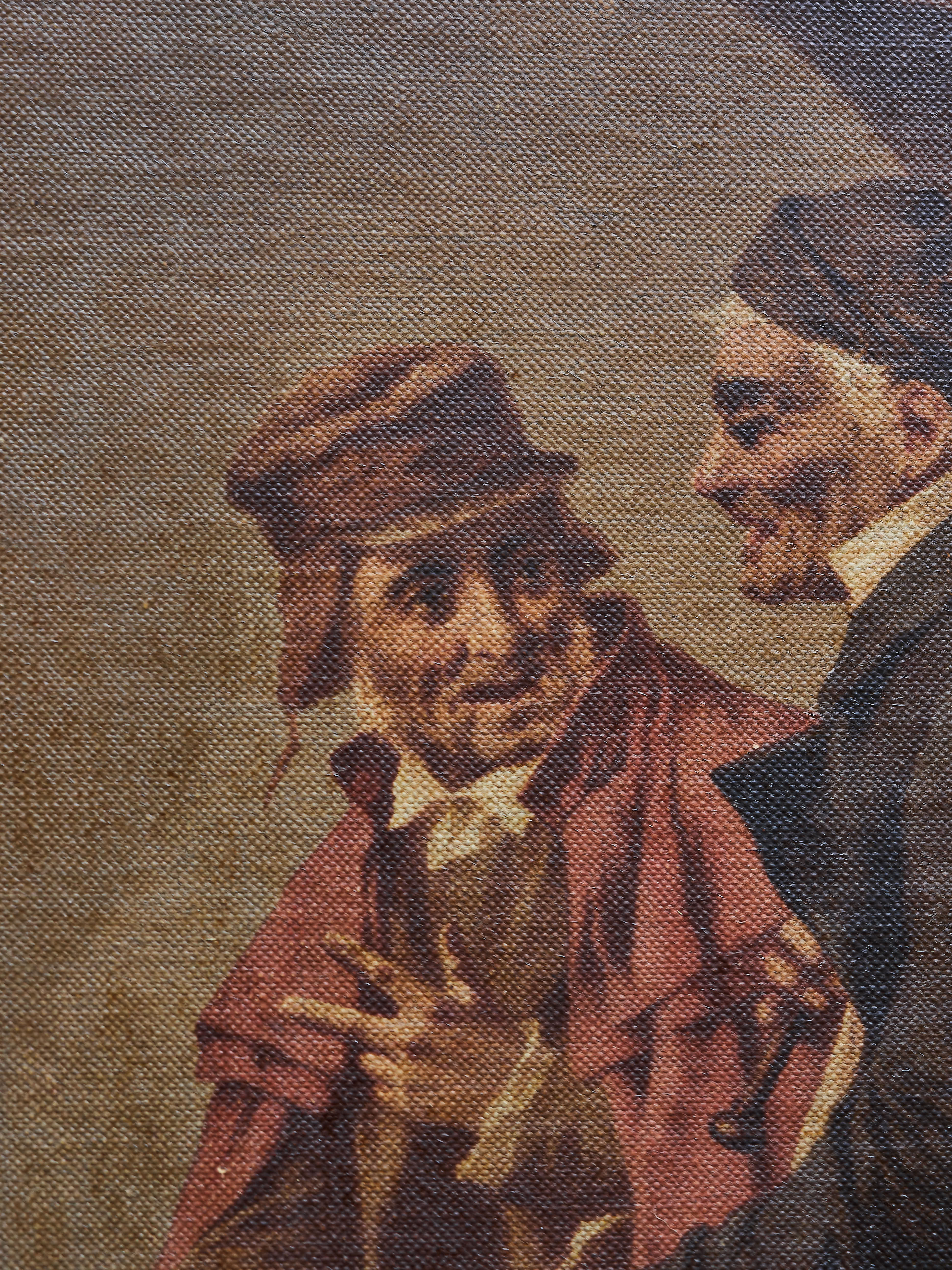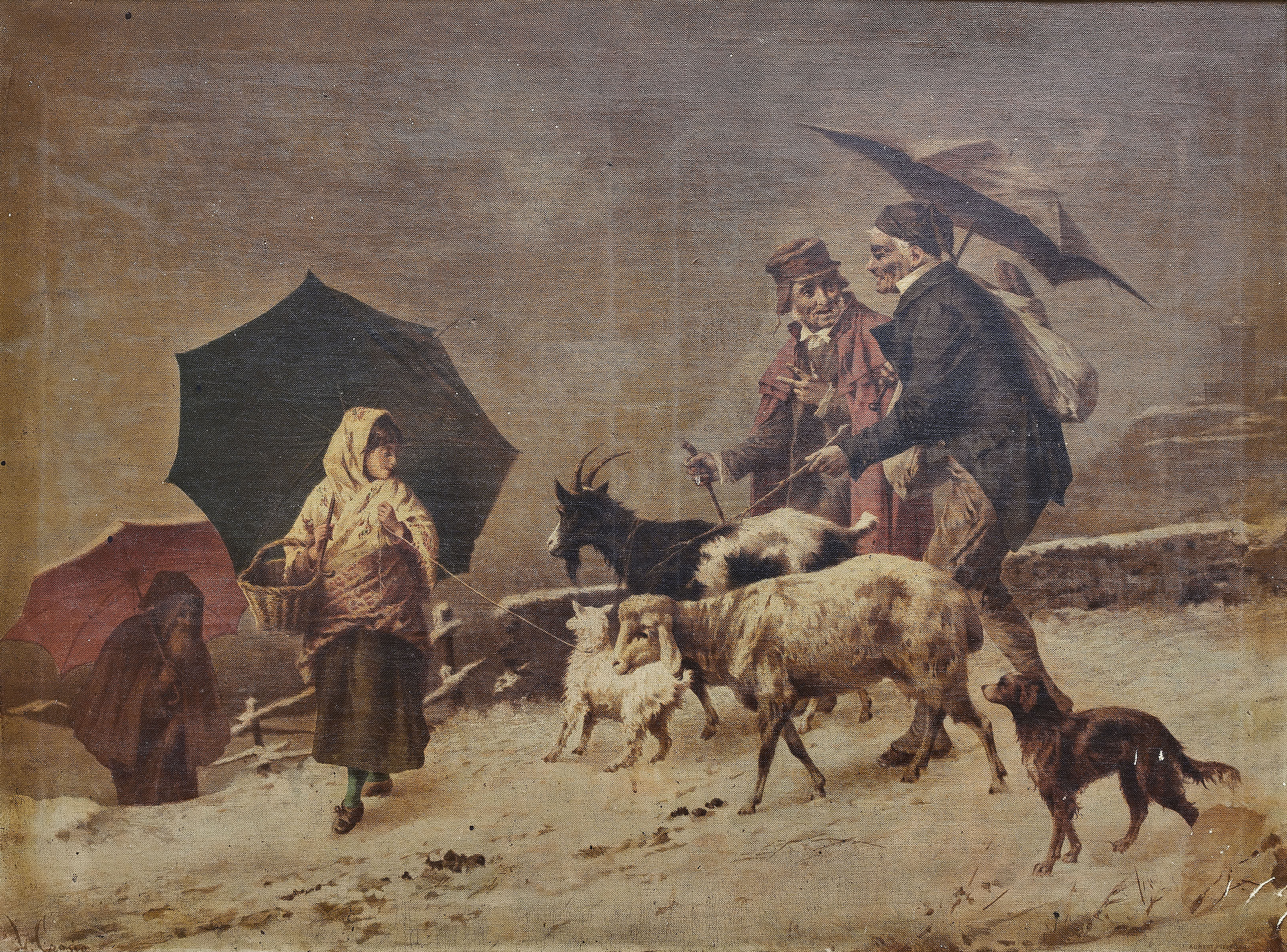 Dekorativní starožitný tisk na plátně představující venkovskou zimní scénu s lidmi a domácími zvířaty. Kompozice zachycuje dvojici mužů s ovcemi a kozami, ženu s košíkem a otevřenými deštníky, v pozadí pak venkovskou atmosféru. Dílo je provedeno jako reprodukce malby na malířském plátně, typicky označované jako olejotisk. Obraz je zasazen do původního zlaceného rámu s jemnou patinou, která podtrhuje jeho historický charakter. Zadní strana ukazuje původní napnuté plátno na dřevěném rámu.