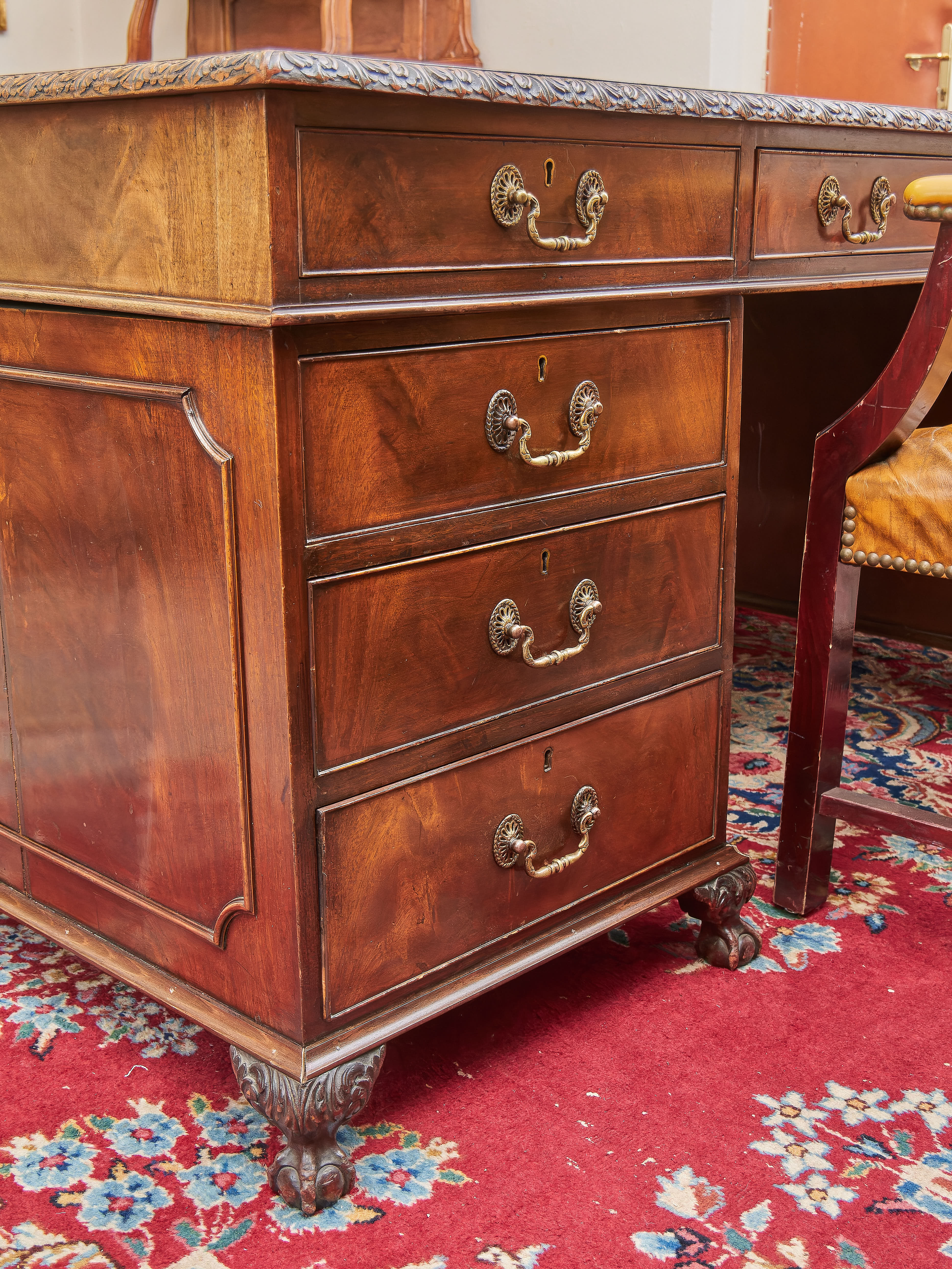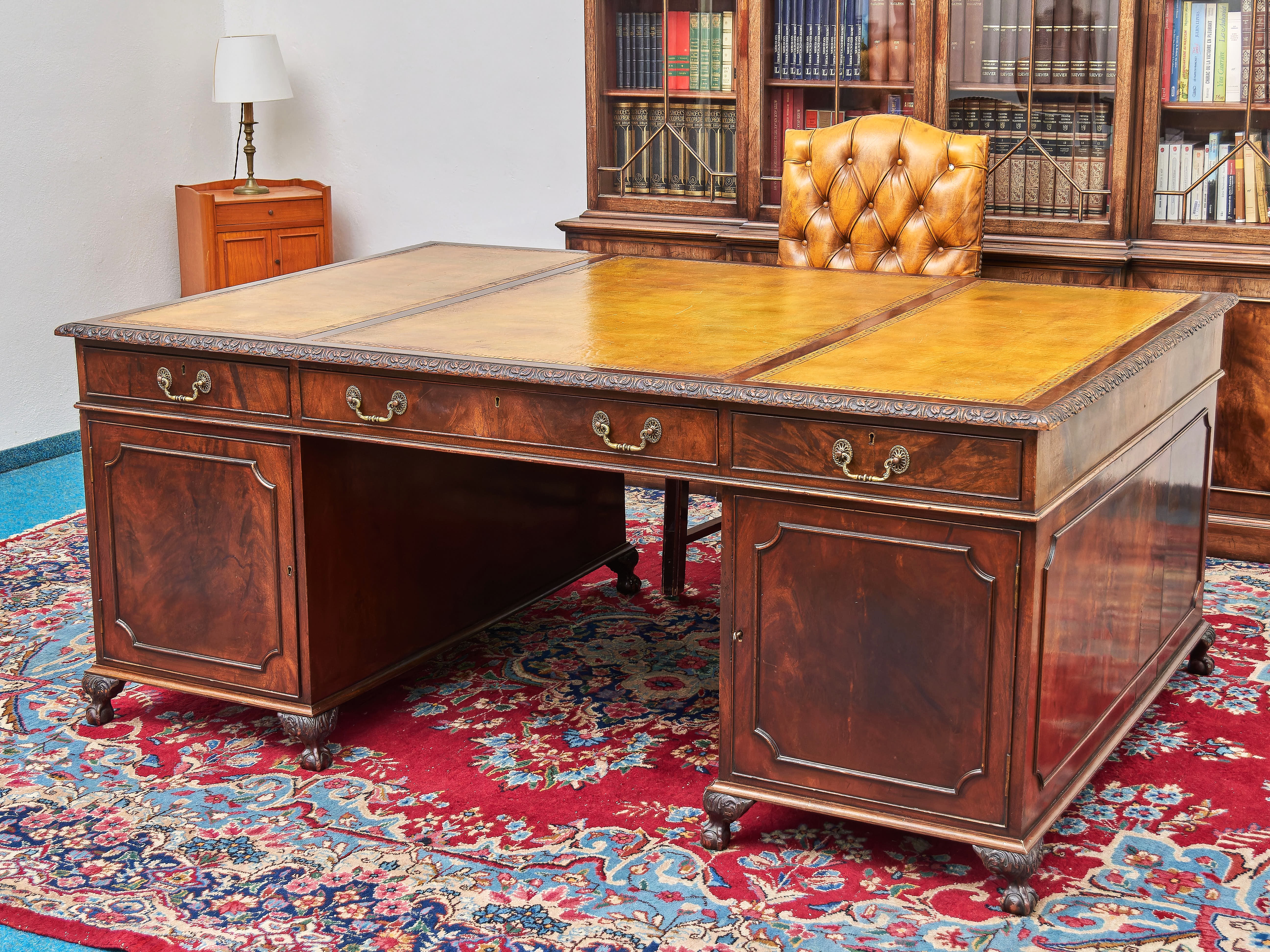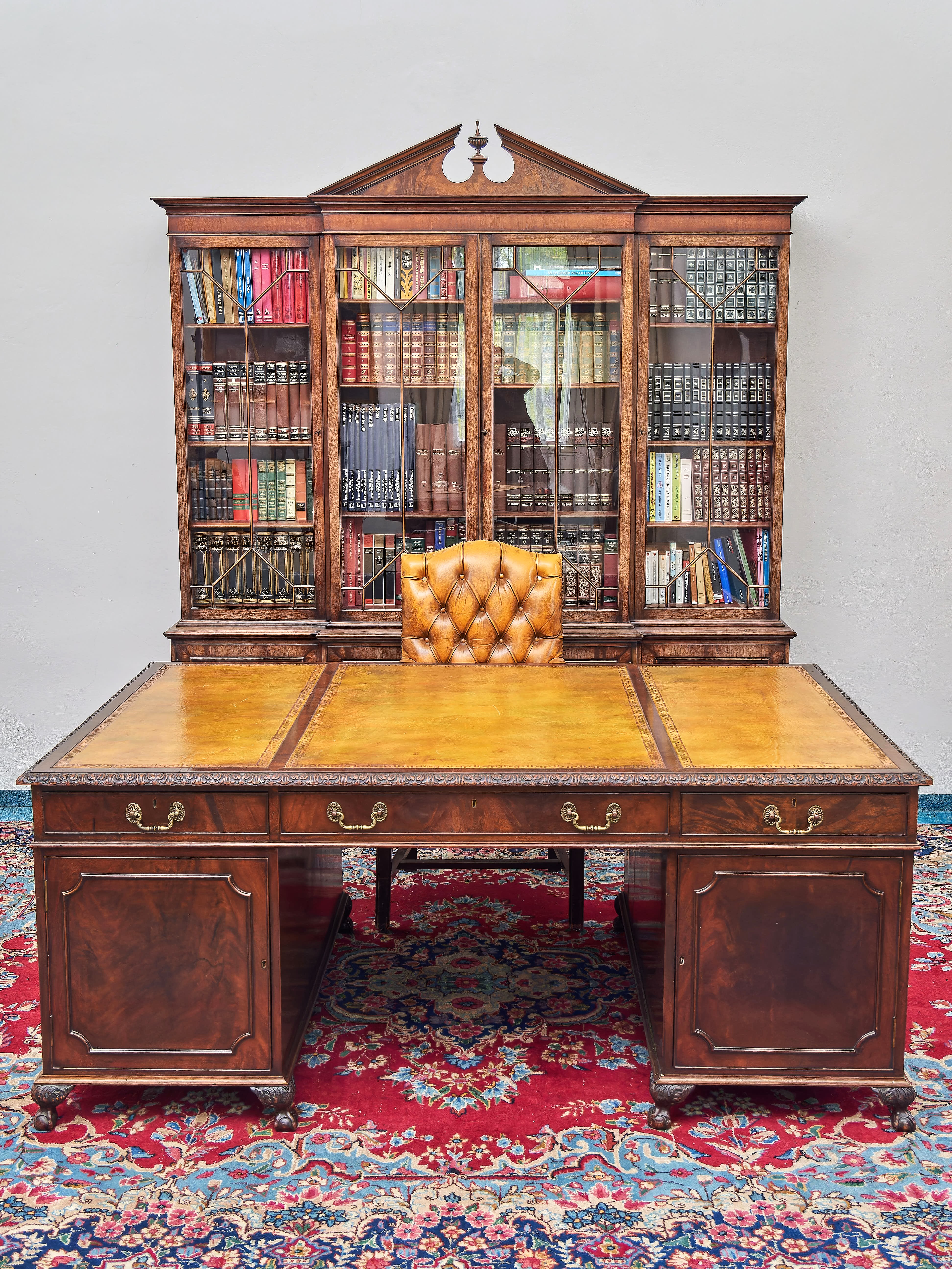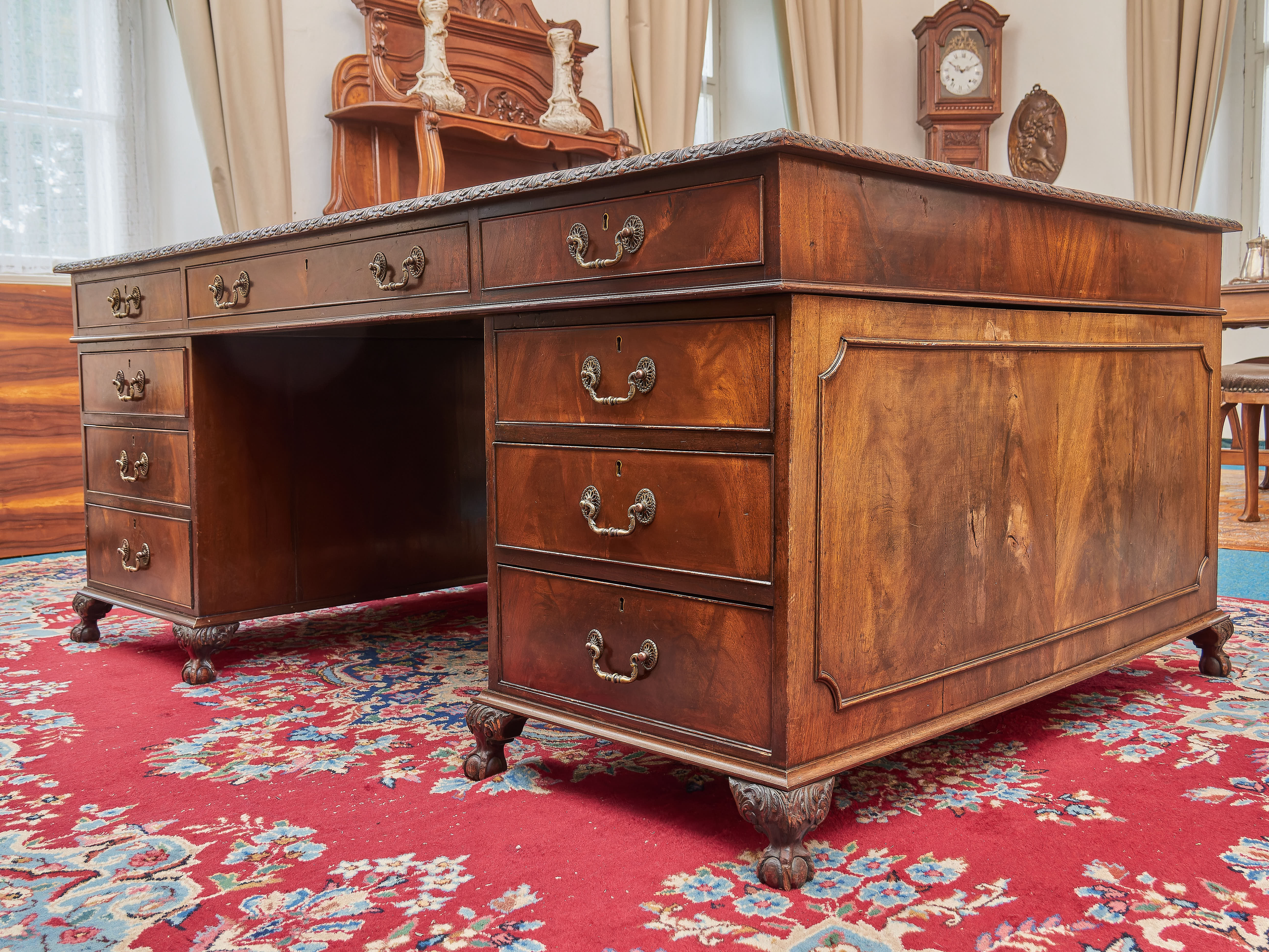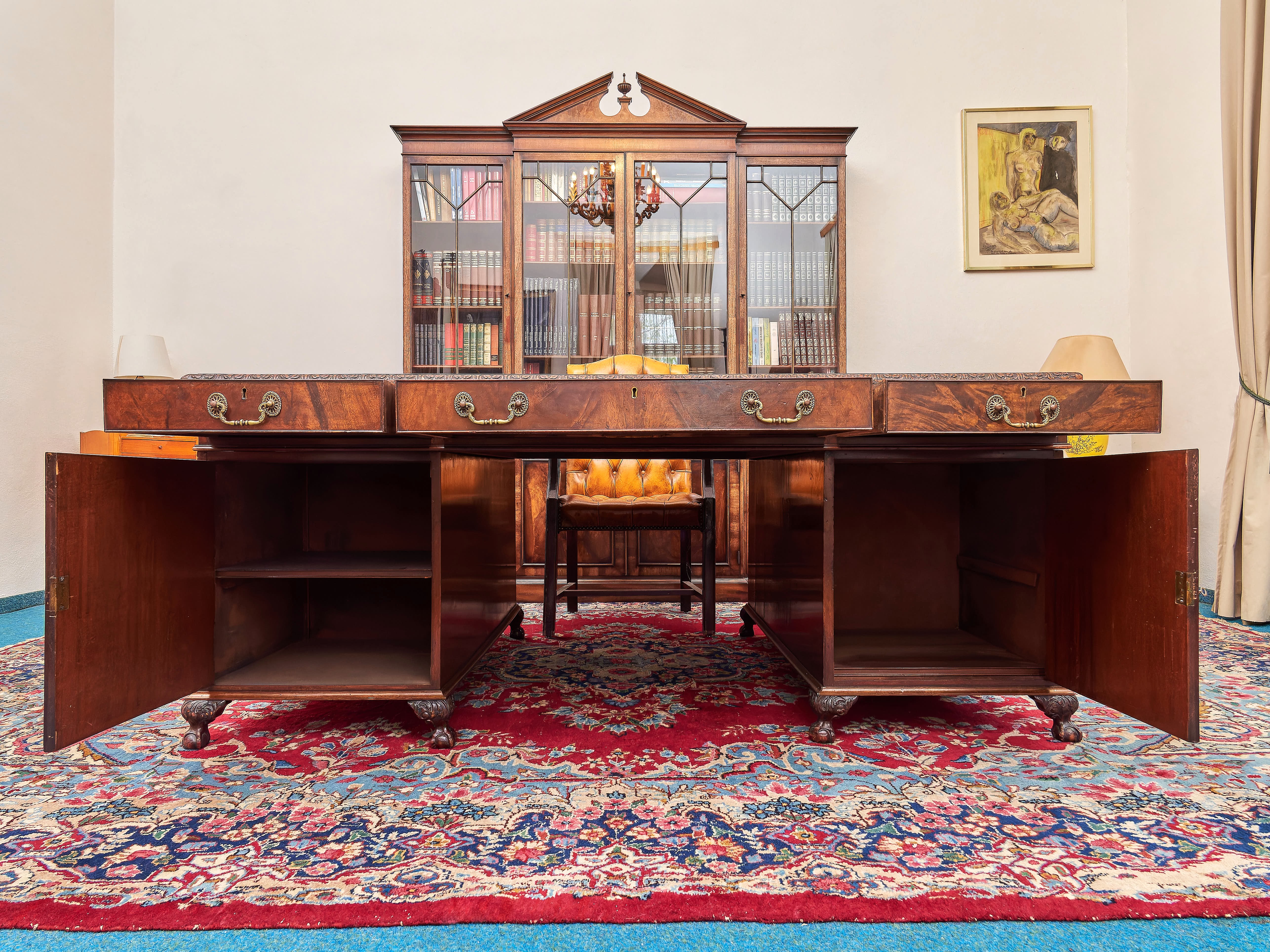 Anglický psací stůl v oboustranném provedení, kde na jedné straně naleznete šuplíkovou část s 2x 4 šuplíky po stranách a jedním velkým středovým a z druhé strany trojici vrchních šuplíků a dvojici kontejnerů třeba pro šanony. Vrchní deska je čalouněná ve třech polích kůží zdobenou slepotiskem po stranách. Vrchní deska je dále bohatě zdobená jemným okrajovým vyřezáváním. Psací stůl je vyrobený z masivního ořechu s krásnou kresbou. Nohy jsou typické Chippendalovské. Kvalitní lité kování z mosazi. Stůl je pro přepravu možné rozdělit na vrchní desku s šuplíky a dva spodní kontejnery – snadné stěhování.