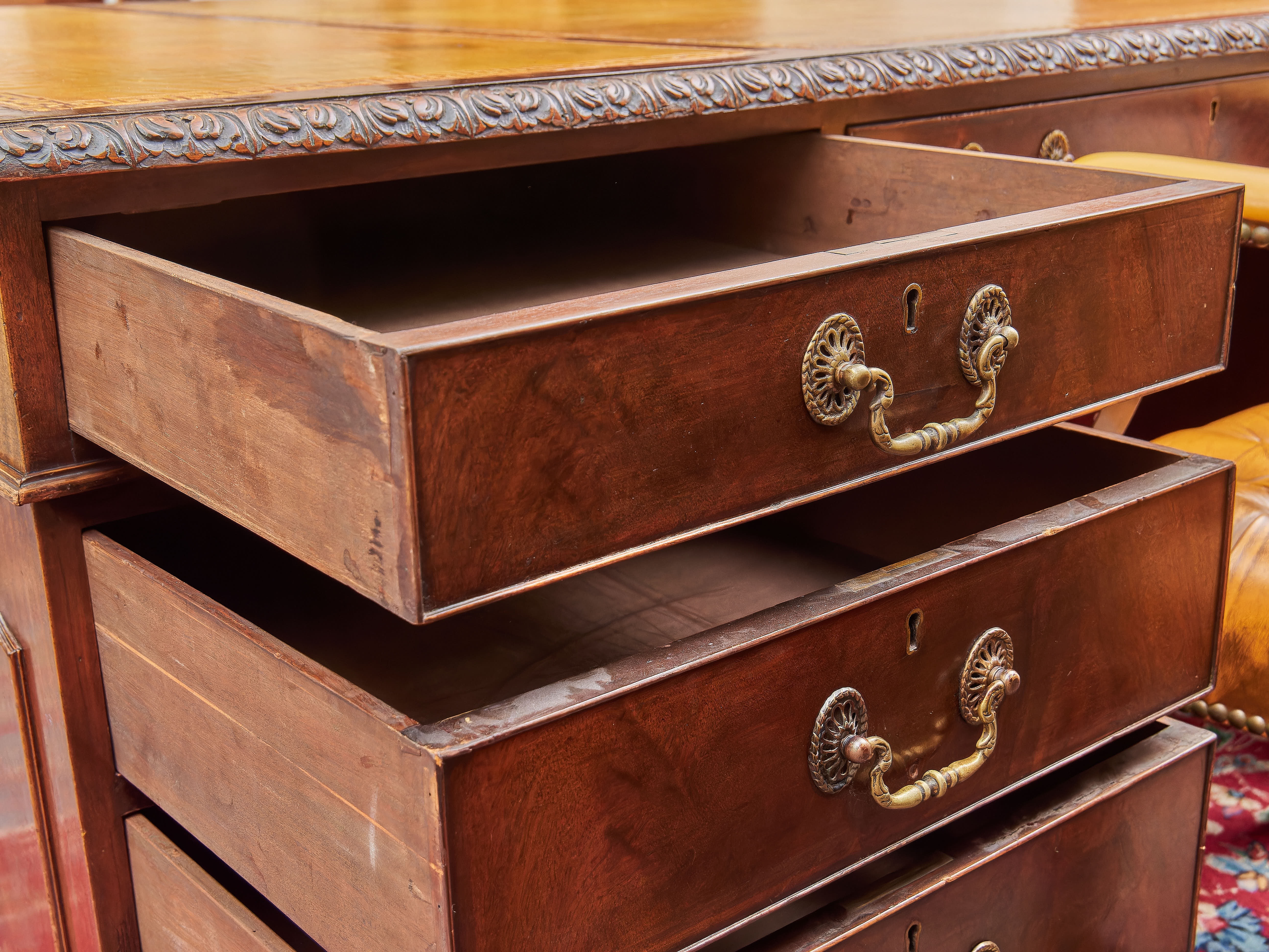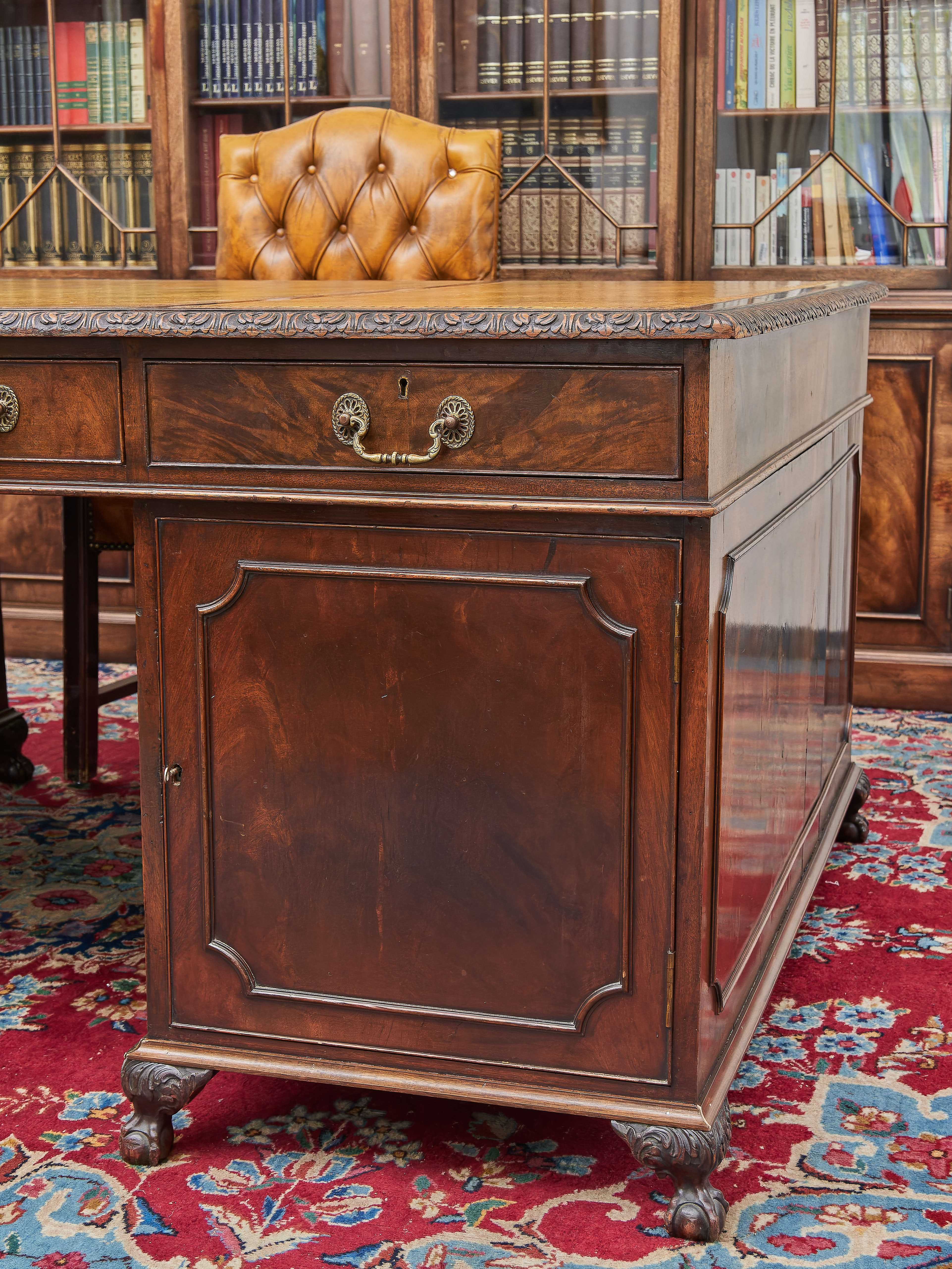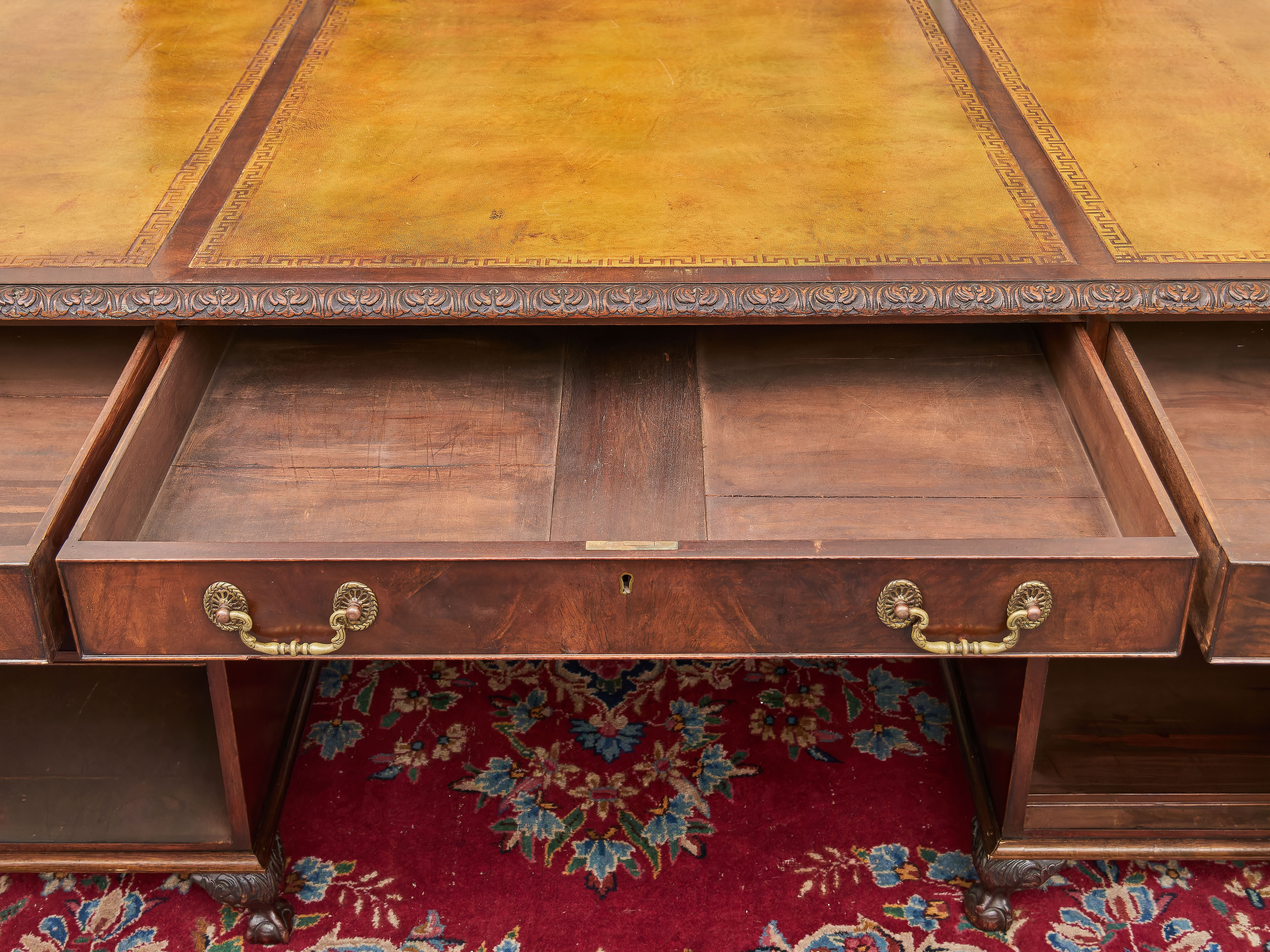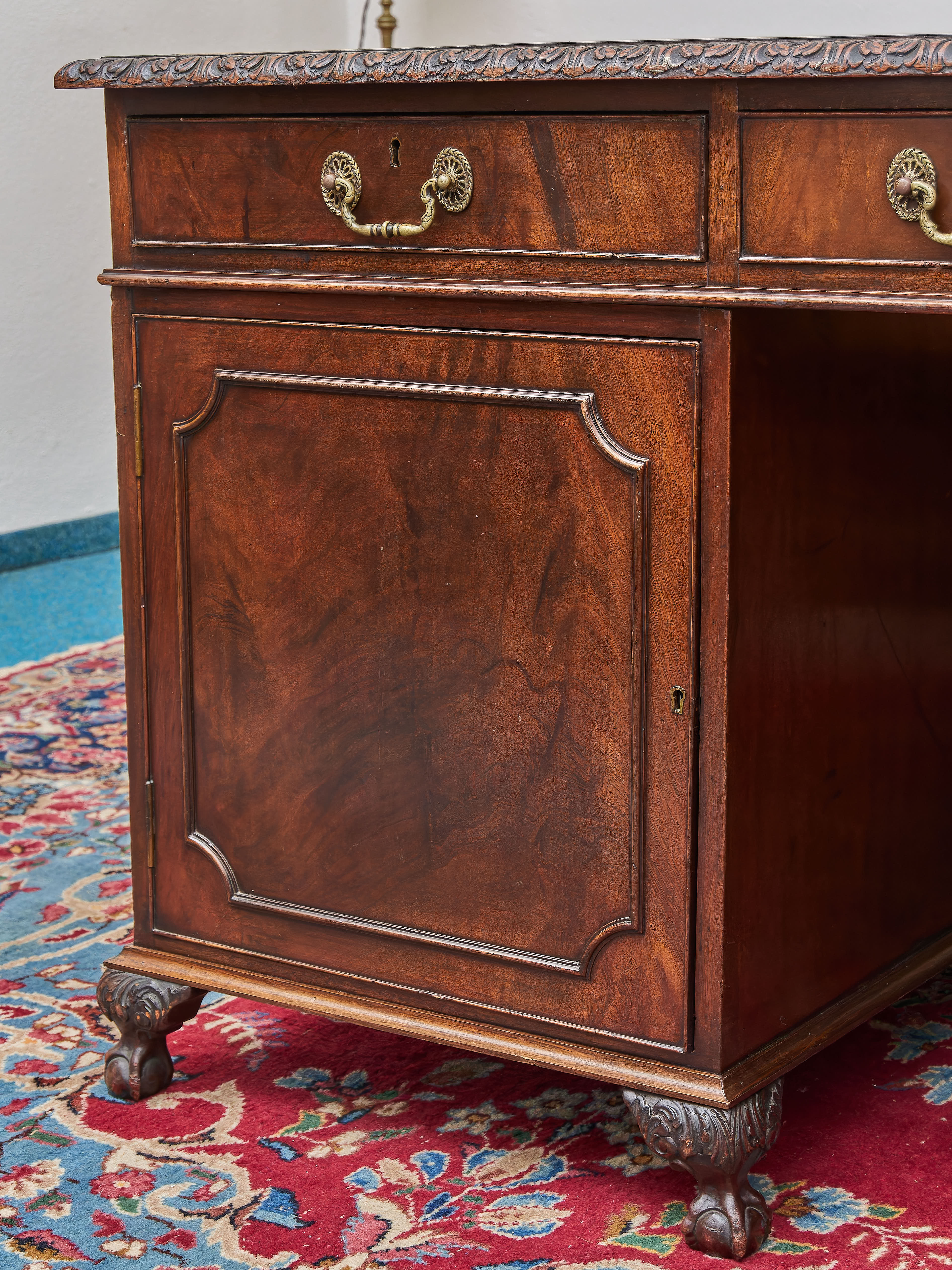 Anglický psací stůl v oboustranném provedení, kde na jedné straně naleznete šuplíkovou část s 2x 4 šuplíky po stranách a jedním velkým středovým a z druhé strany trojici vrchních šuplíků a dvojici kontejnerů třeba pro šanony. Vrchní deska je čalouněná ve třech polích kůží zdobenou slepotiskem po stranách. Vrchní deska je dále bohatě zdobená jemným okrajovým vyřezáváním. Psací stůl je vyrobený z masivního ořechu s krásnou kresbou. Nohy jsou typické Chippendalovské. Kvalitní lité kování z mosazi. Stůl je pro přepravu možné rozdělit na vrchní desku s šuplíky a dva spodní kontejnery – snadné stěhování.