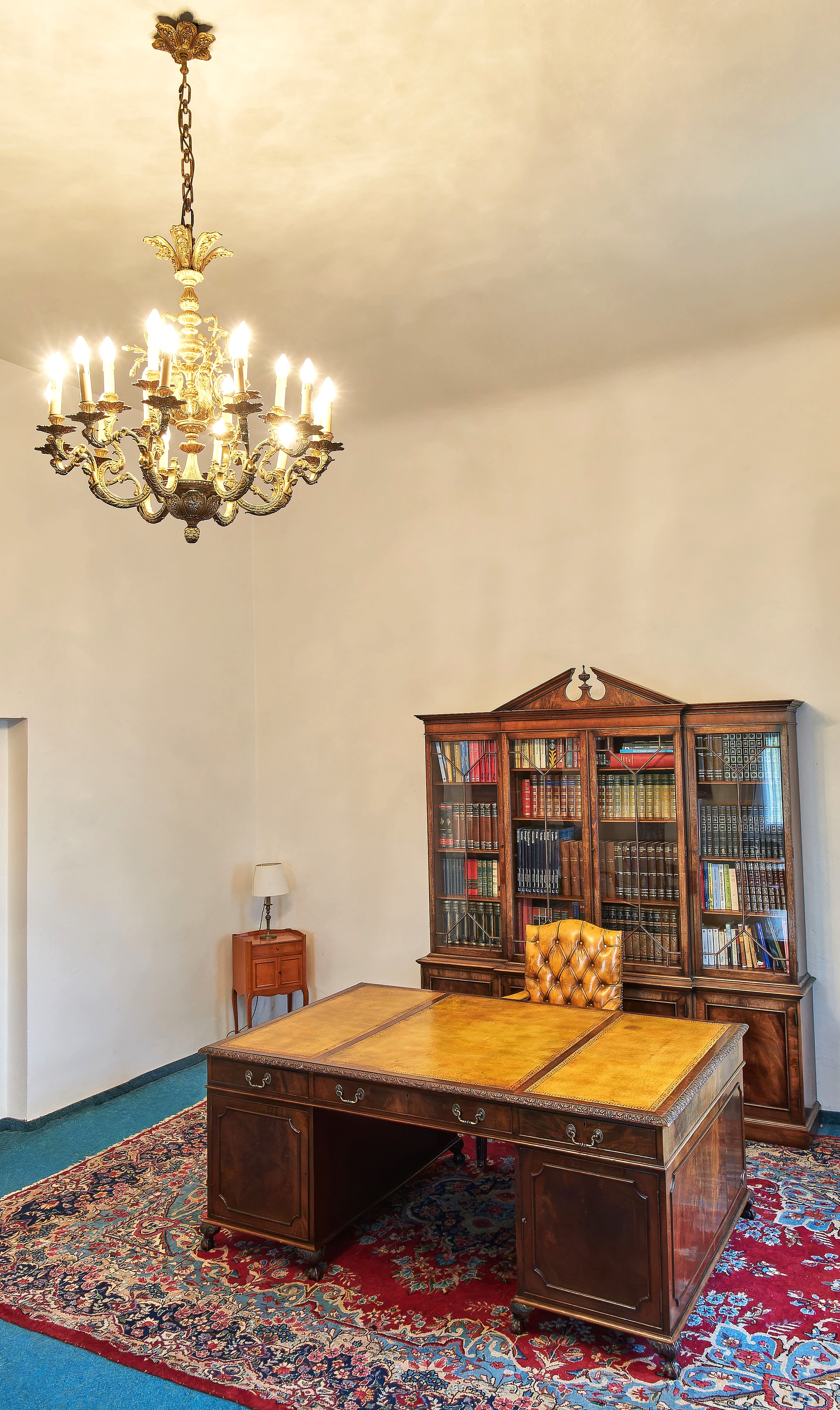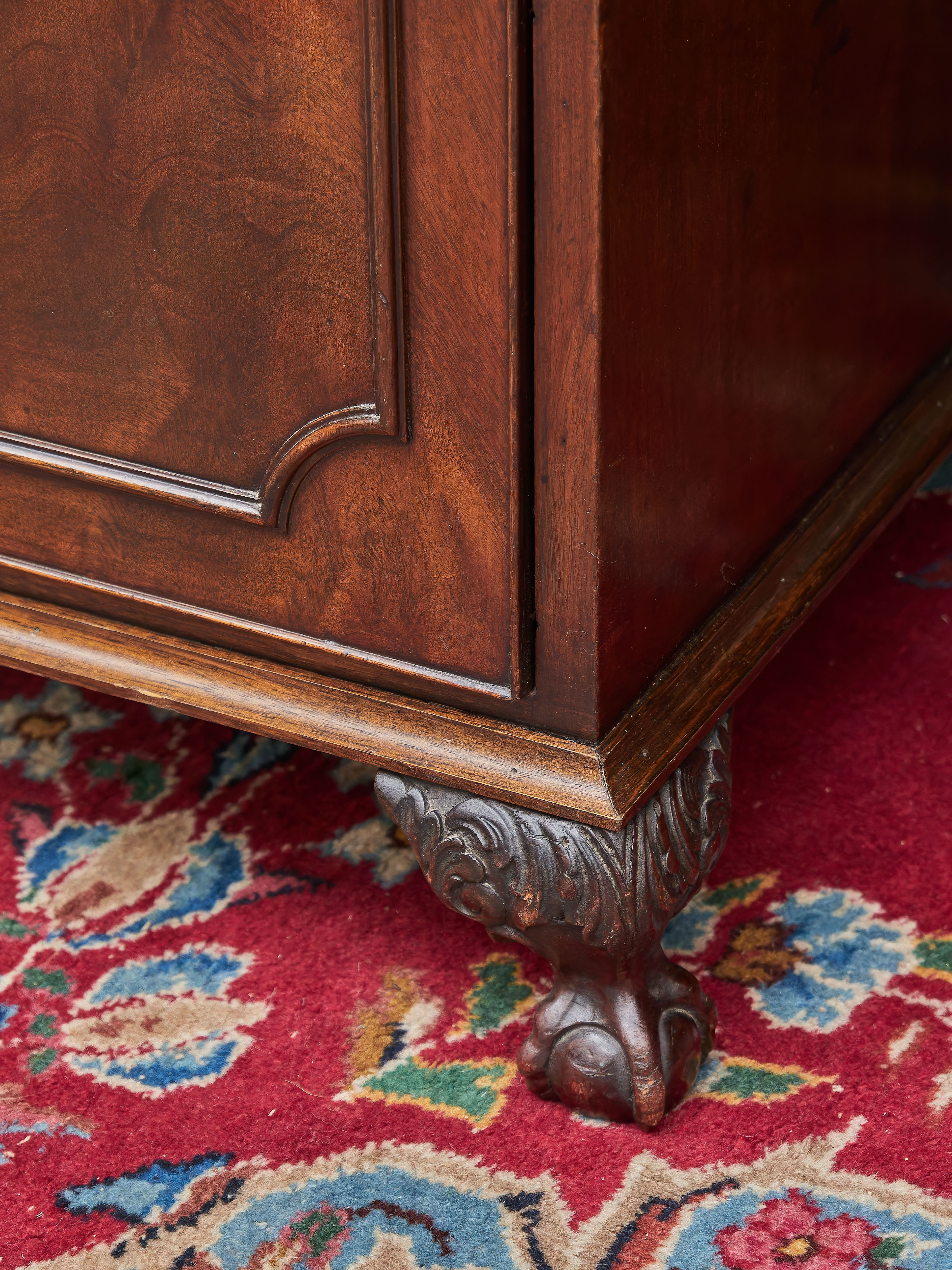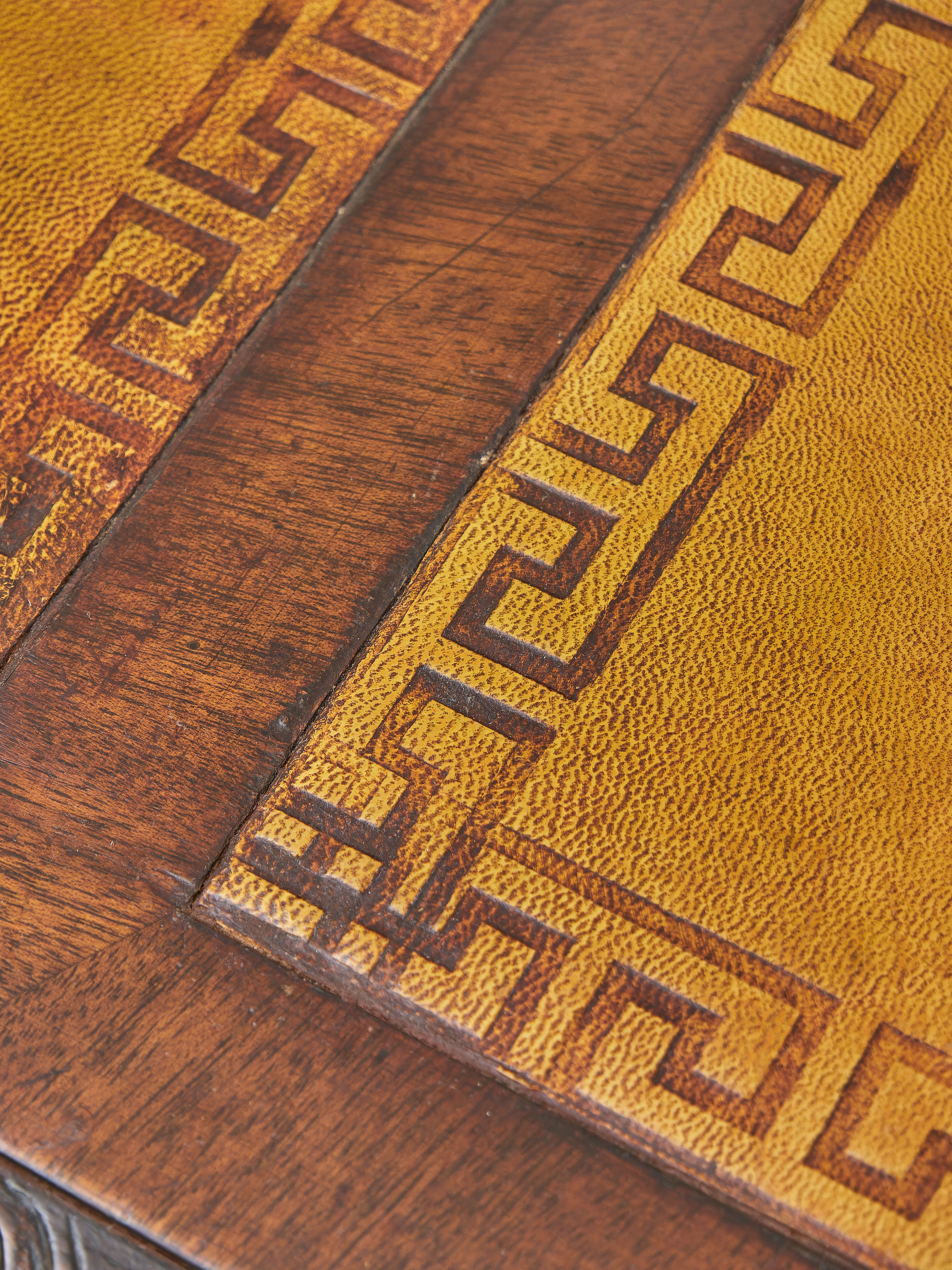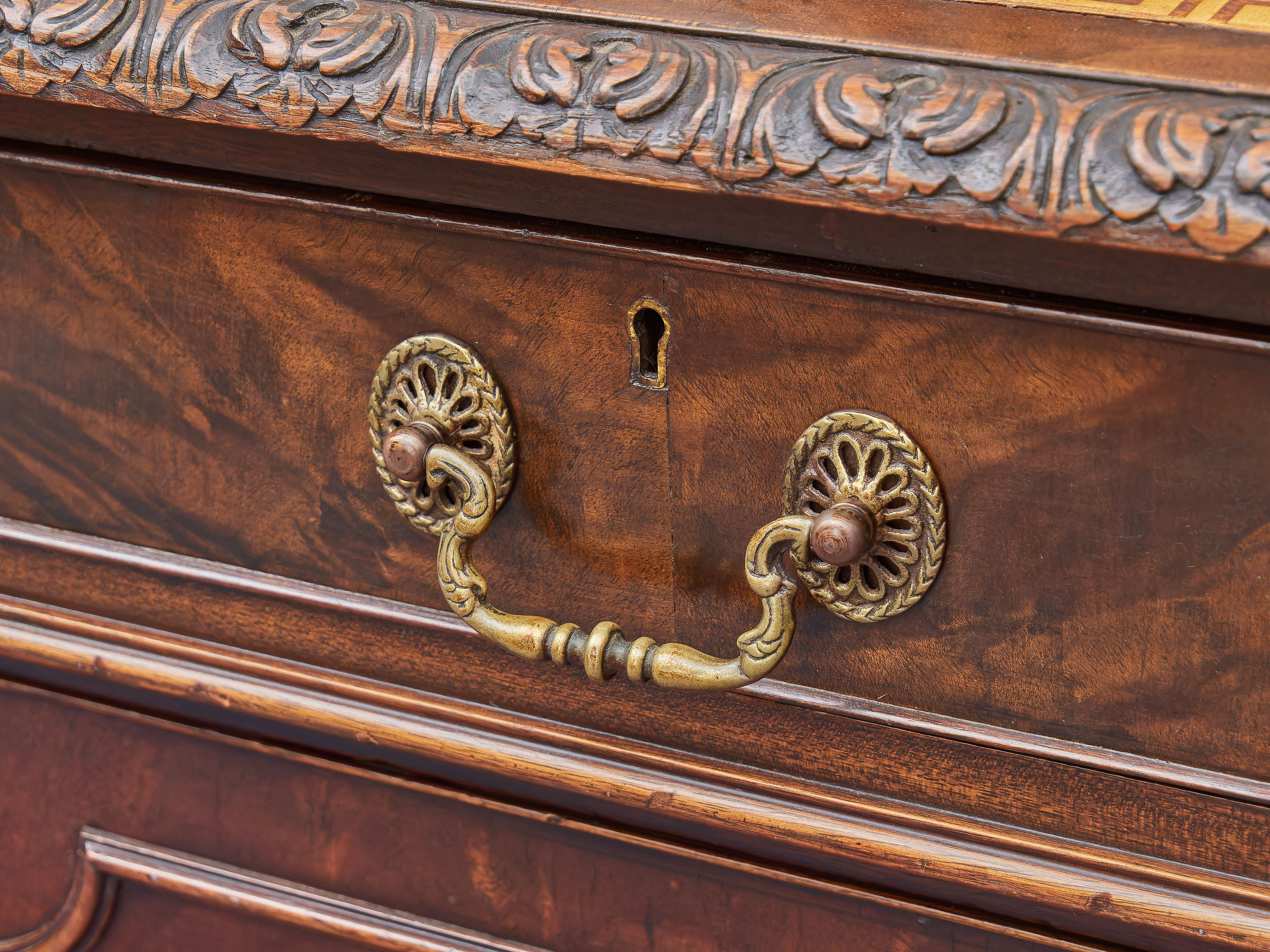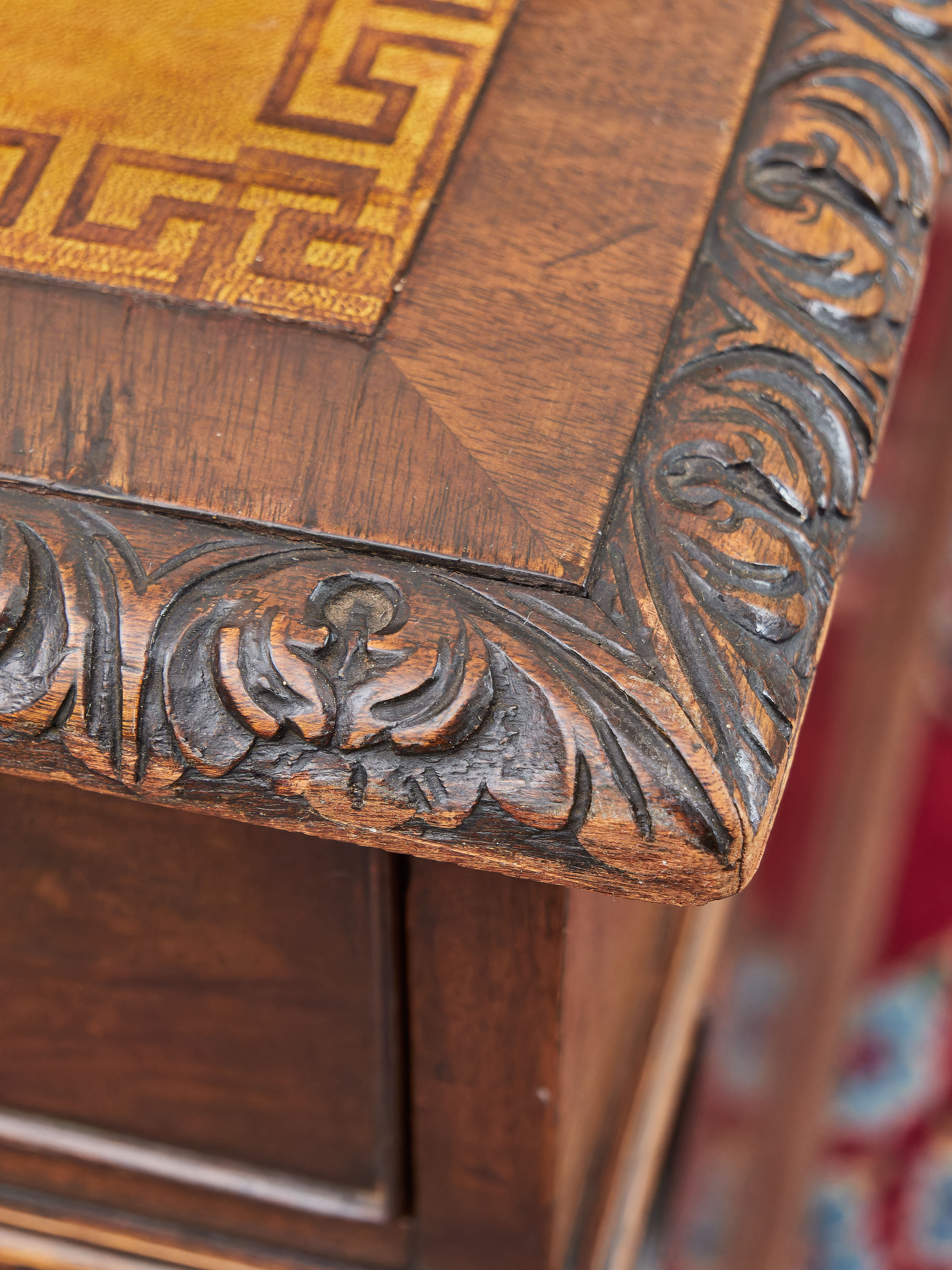 Anglický psací stůl v oboustranném provedení, kde na jedné straně naleznete šuplíkovou část s 2x 4 šuplíky po stranách a jedním velkým středovým a z druhé strany trojici vrchních šuplíků a dvojici kontejnerů třeba pro šanony. Vrchní deska je čalouněná ve třech polích kůží zdobenou slepotiskem po stranách. Vrchní deska je dále bohatě zdobená jemným okrajovým vyřezáváním. Psací stůl je vyrobený z masivního ořechu s krásnou kresbou. Nohy jsou typické Chippendalovské. Kvalitní lité kování z mosazi. Stůl je pro přepravu možné rozdělit na vrchní desku s šuplíky a dva spodní kontejnery – snadné stěhování.