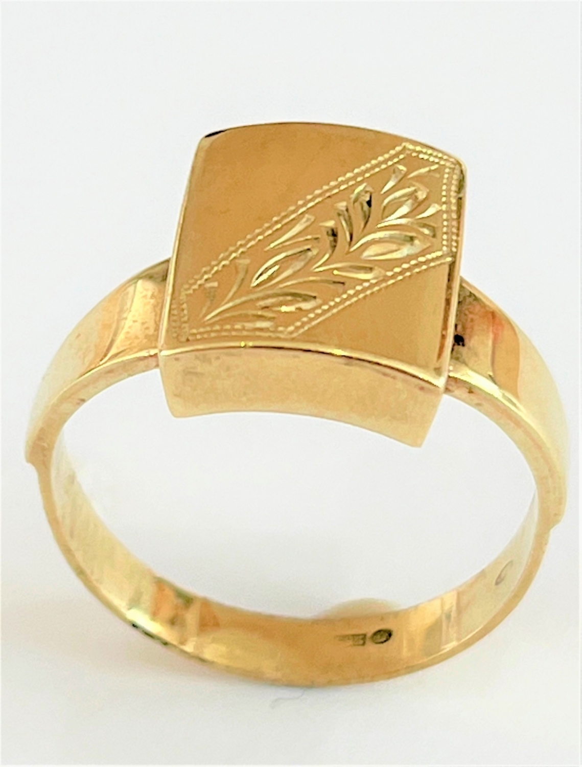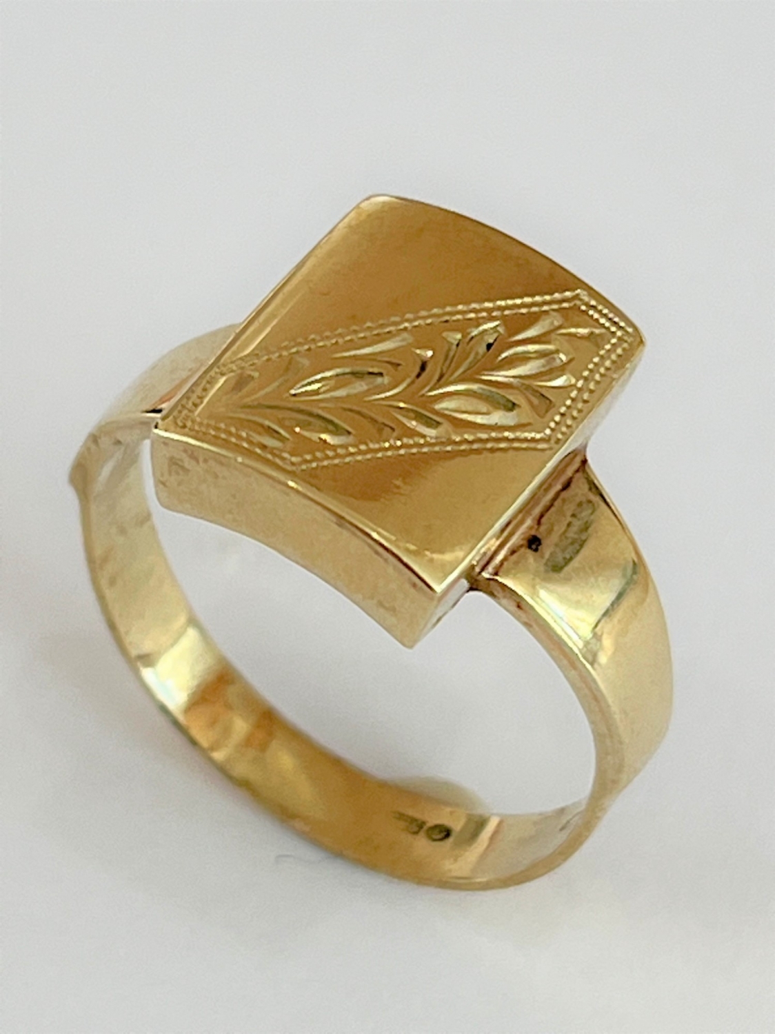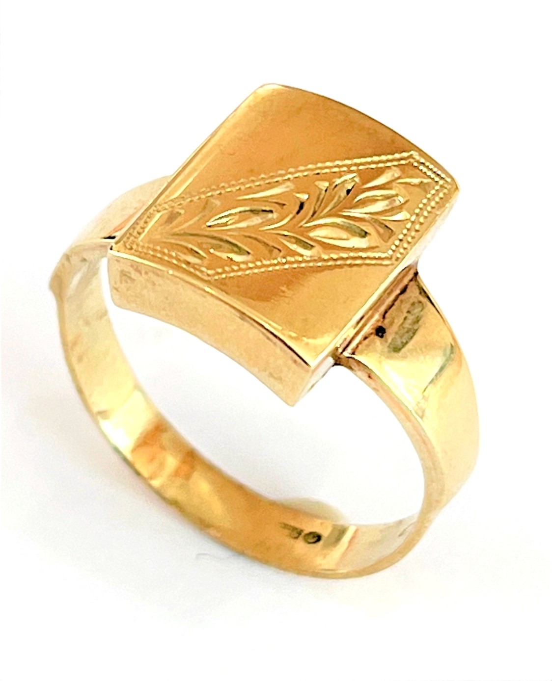 Starožitný zlatý prsten ze 14 karátového žlutého zlata zdobený jemnou ruční ozdobnou rytinou, AU 585/000 váha prstýnku 4,75 gramů- puncováno historickým puncem Čejka, velikost prstene číslo 62, prstýnek odborně vyčištěn a vyleštěn a je v perfektním stavu.