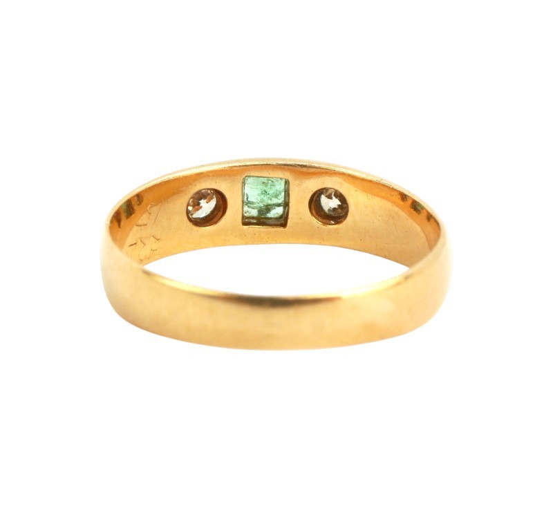 Starožitný zlatý prsten s přírodními diamanty briliantového brusu a smaragdem,