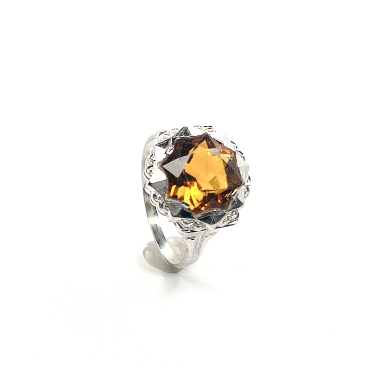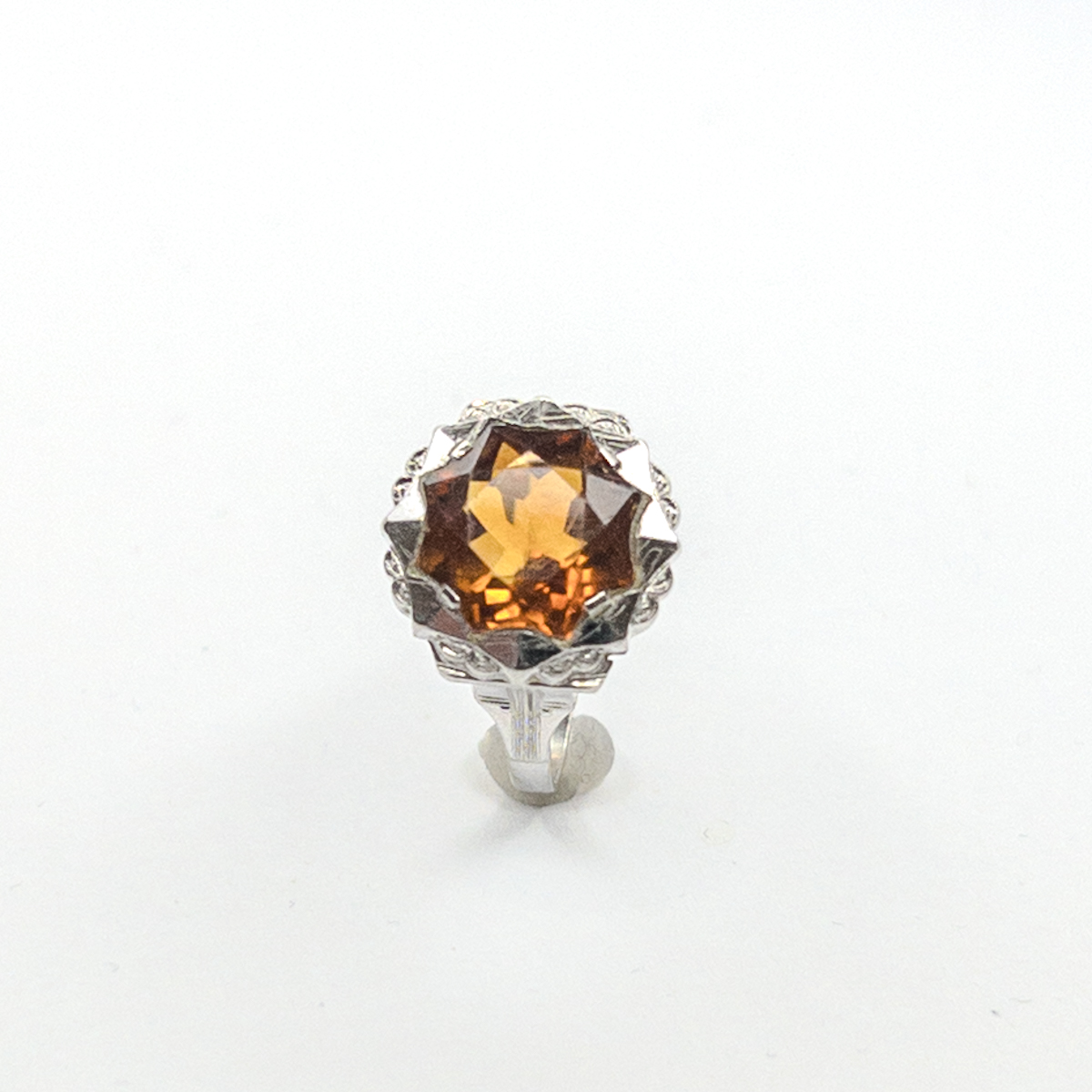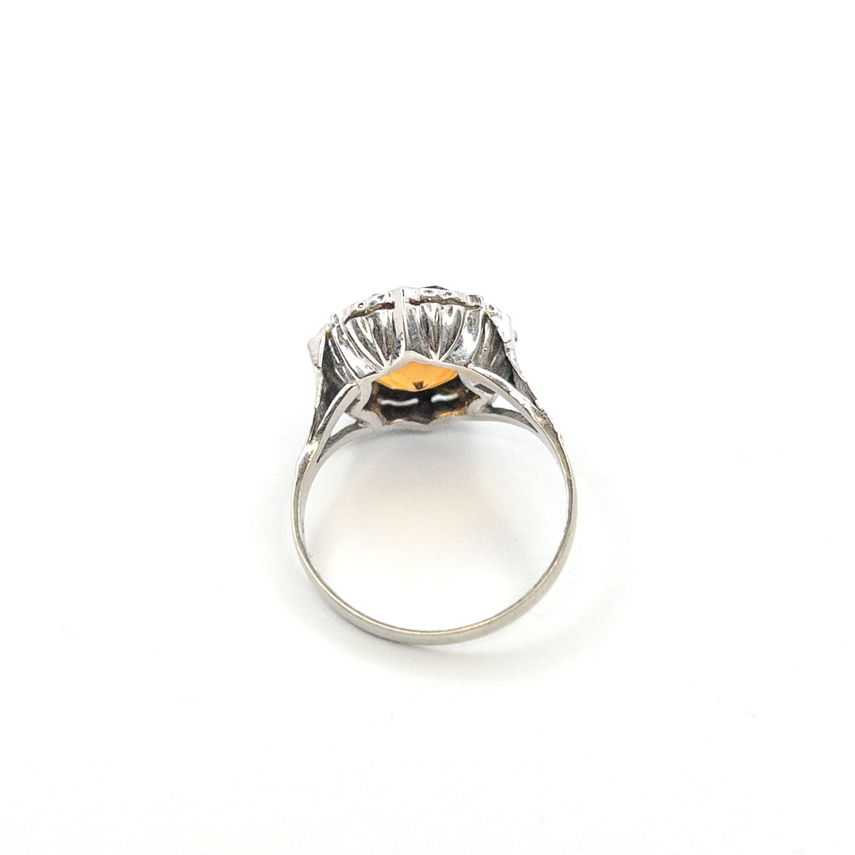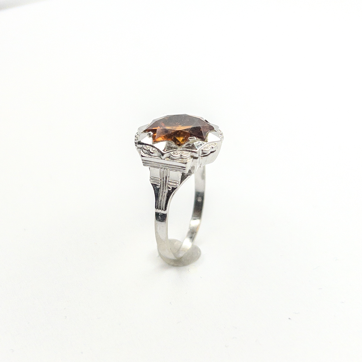 Velmi elegantní starožitný prsten z bílého zlata je osazený přírodním citrínem zářivé, hnědooranžové barvy o hmotnosti 4,3 ct,
