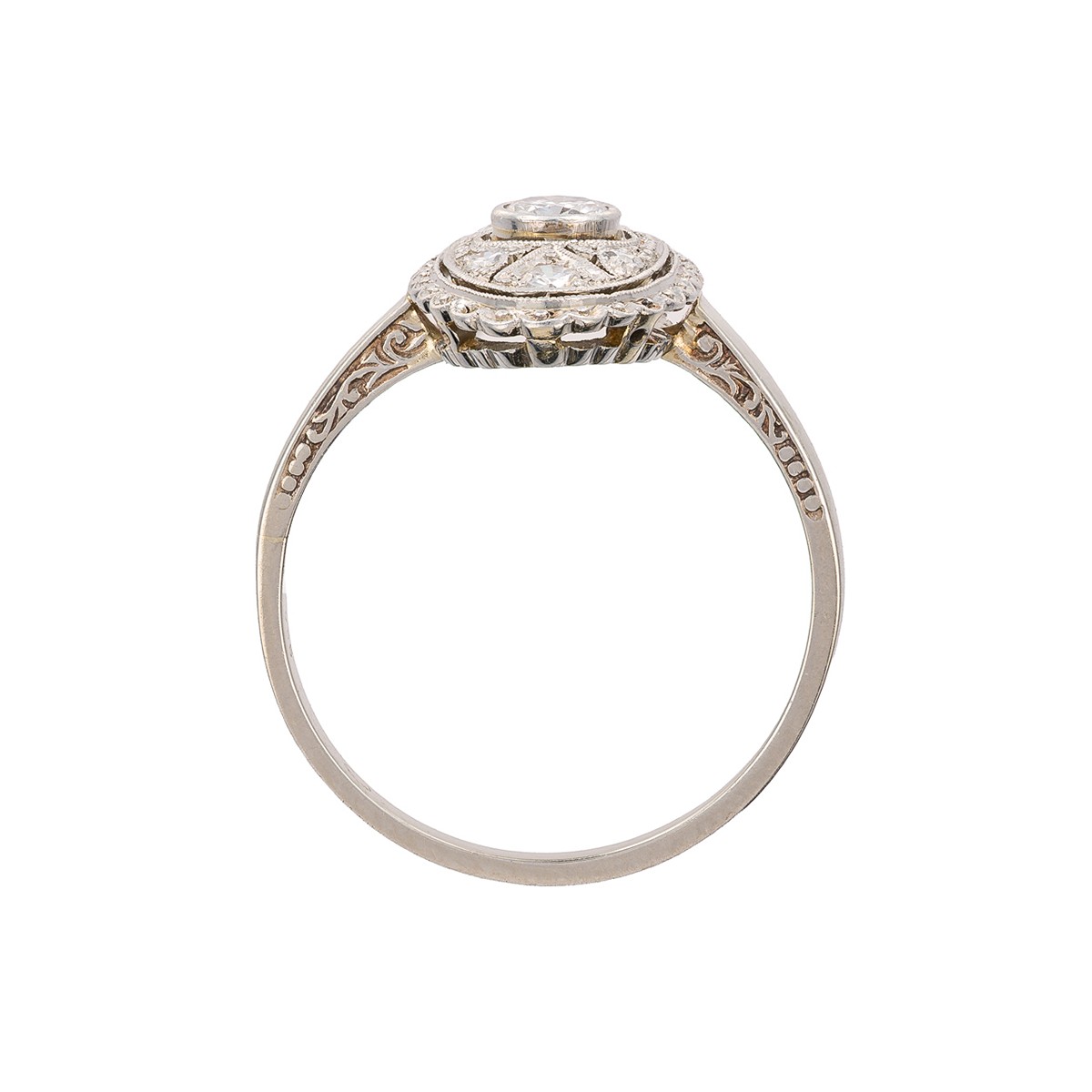 – 4 ks přírodních diamantů, kulatý briliantový brus Old Europe, celkem 0,10 ct, barva vzácně bílá (F–G–H), čistota VS až I1, průměr 1,8–1,9 mm
