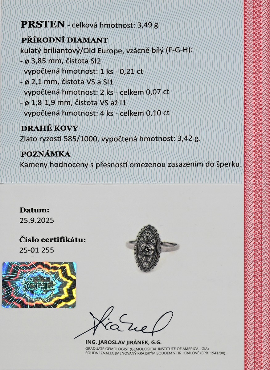 – 1 ks přírodního diamantu, kulatý briliantový brus Old Europe, celkem 0,21 ct, barva vzácně bílá (F–G–H), čistota SI2, průměr 3,85 mm