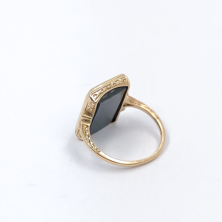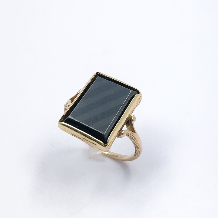 Starožitný zlatý prsten s vybrušovaným onyxem, zlato zdobené gravírováním o ryzosti 14 karátů 585/1000 o celkové hmotnosti 5,46 g,