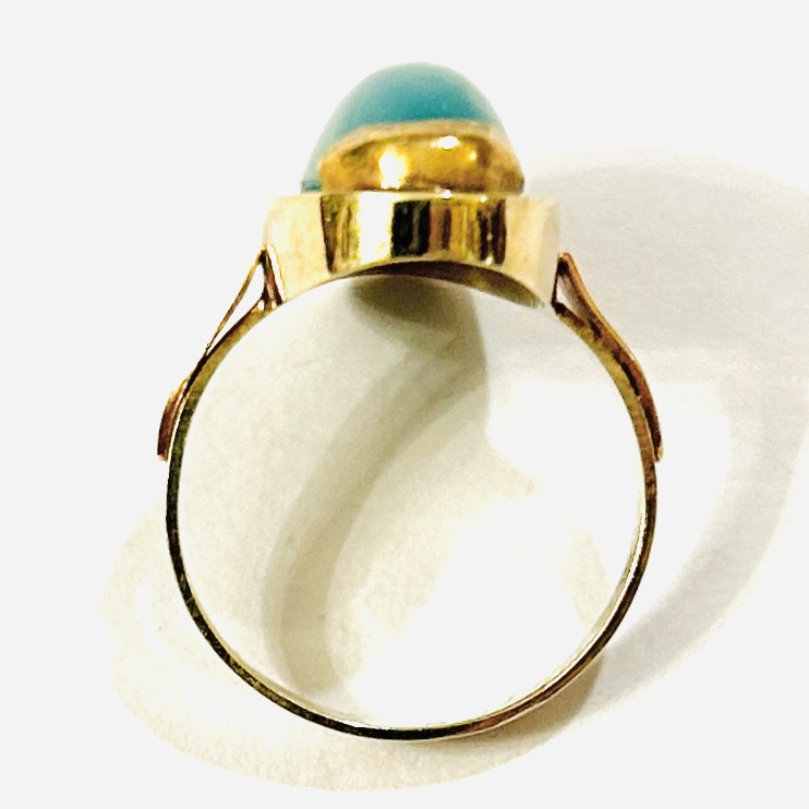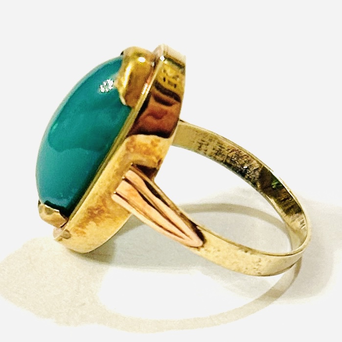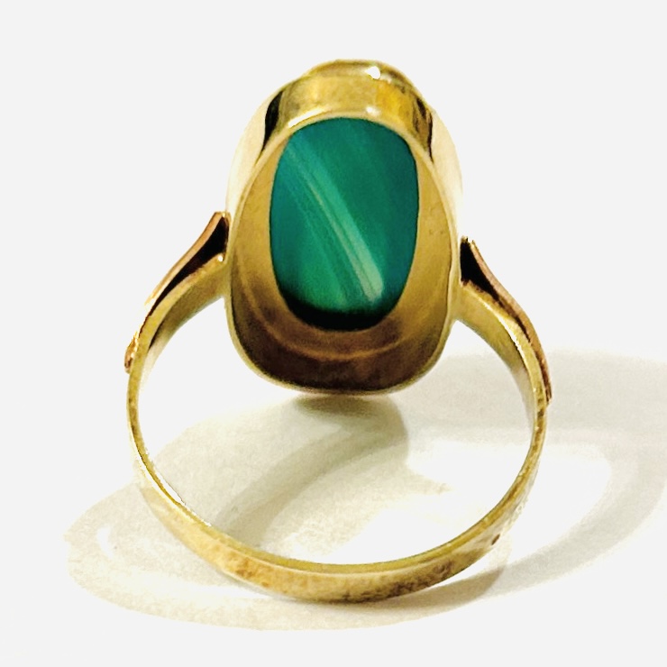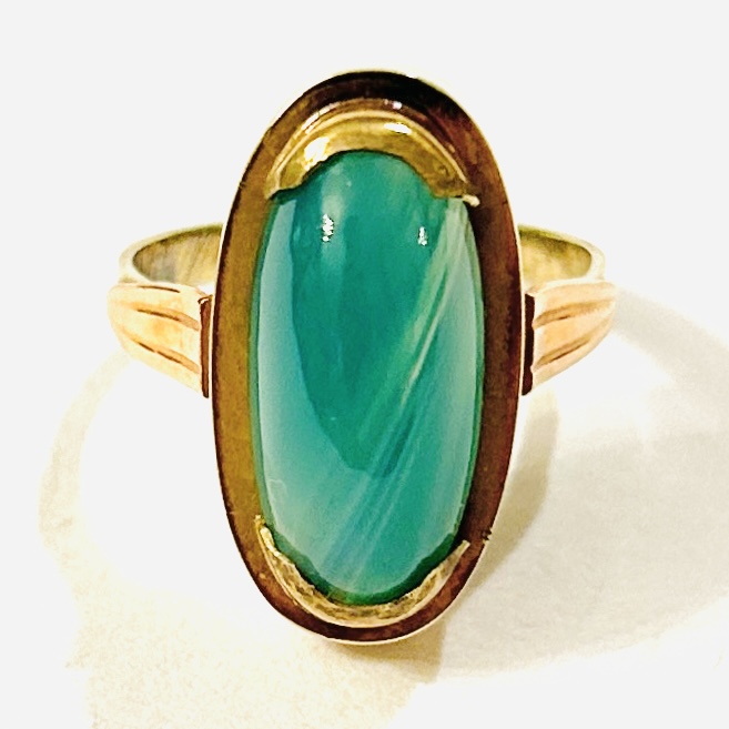 Elegantní, starožitný prsten osazený podlouhlou oválnou muglí přírodního zeleného achátu s jemnou pásovou kresbou, fasováno v minimalisticky pojaté hlavici, ramena s rytými liniemi. Patrně zakázková tuzemská zlatnická práce z 50. až 60. let 20. století.