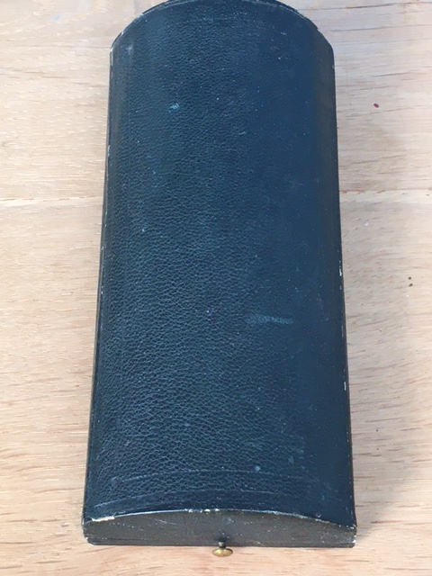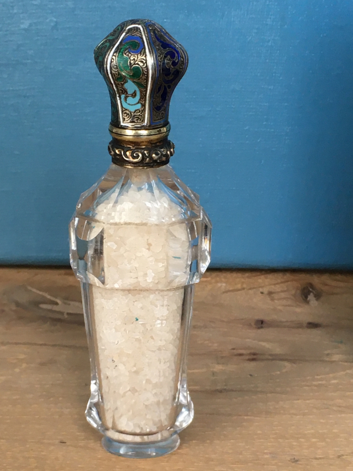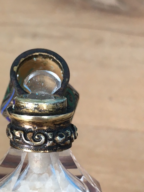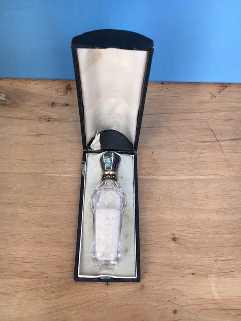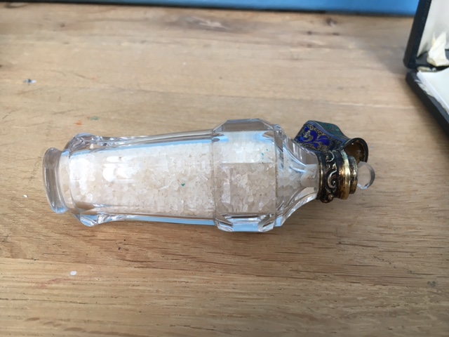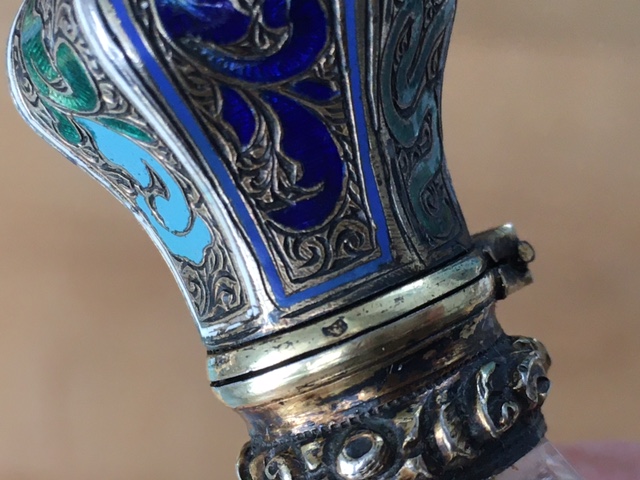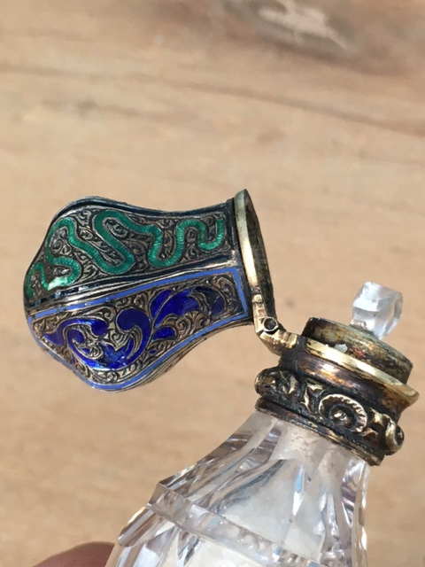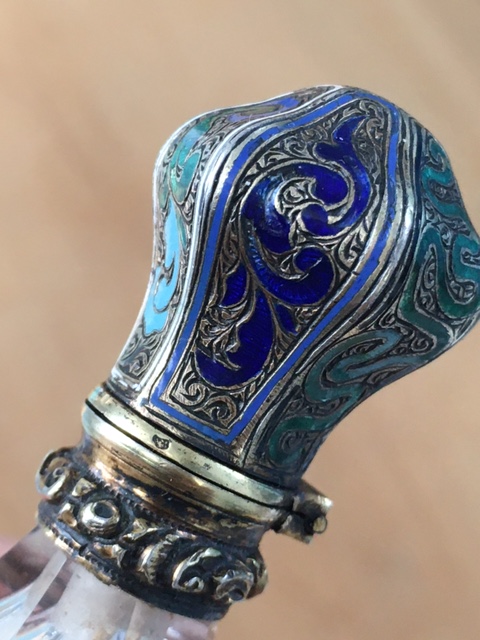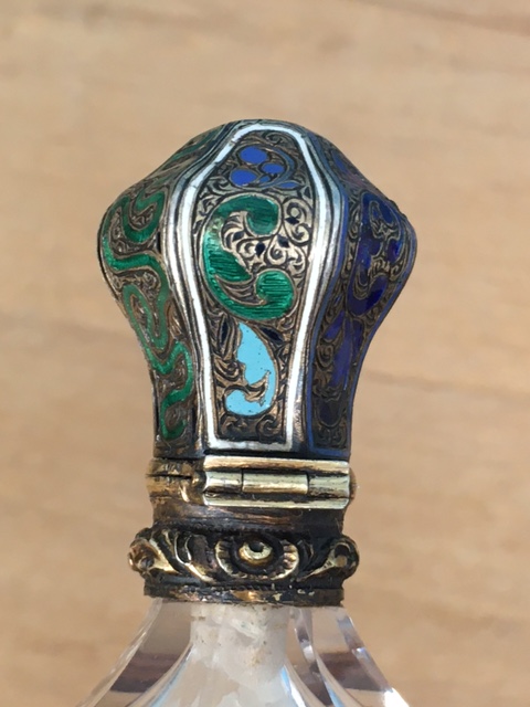 Starý flakon z 19. Stol. Broušené sklo se zlaceným uzávěrem s emaily. Originální etue, délka flakonu 11 cm, perfektní stav, období biedermeieru