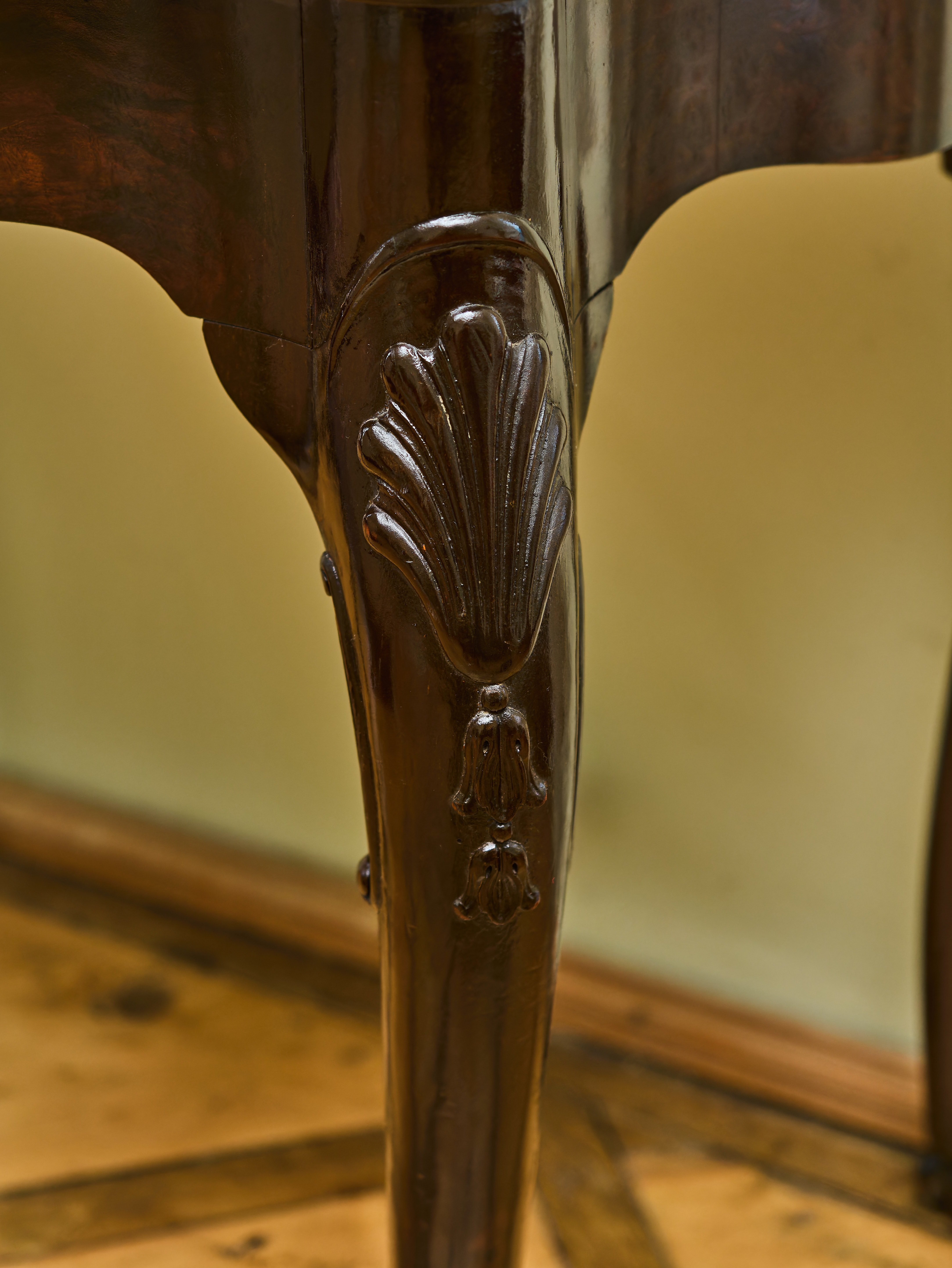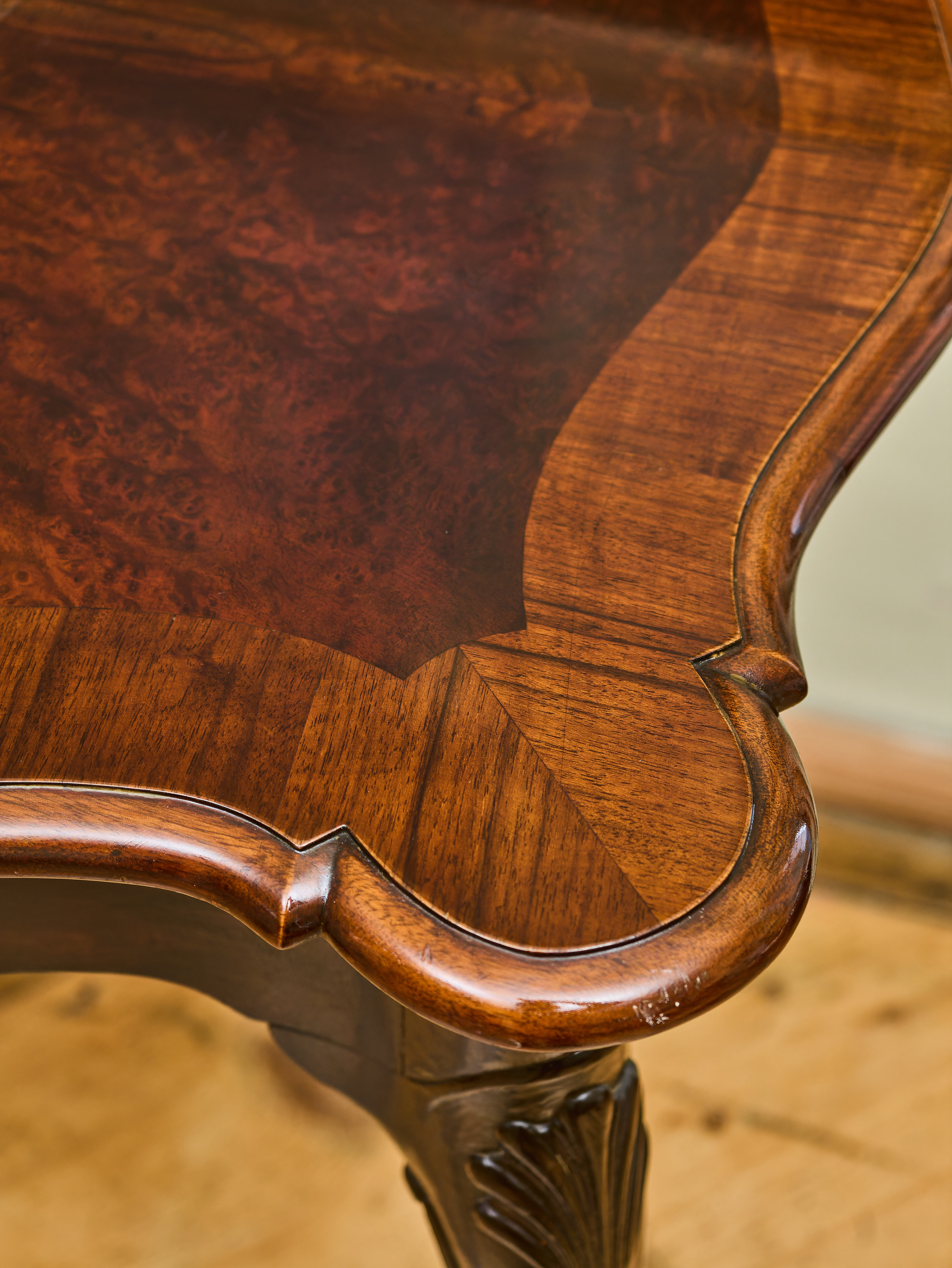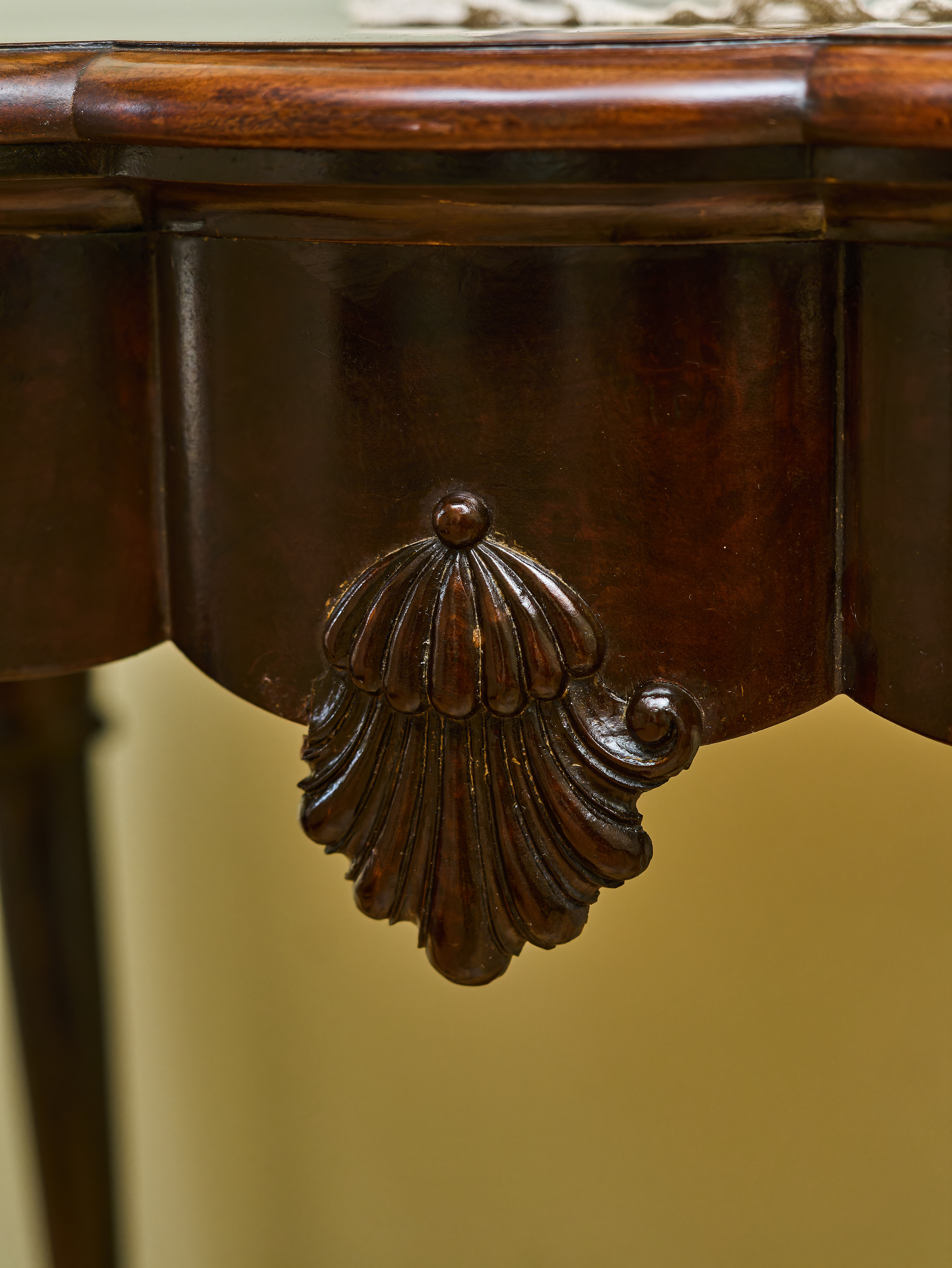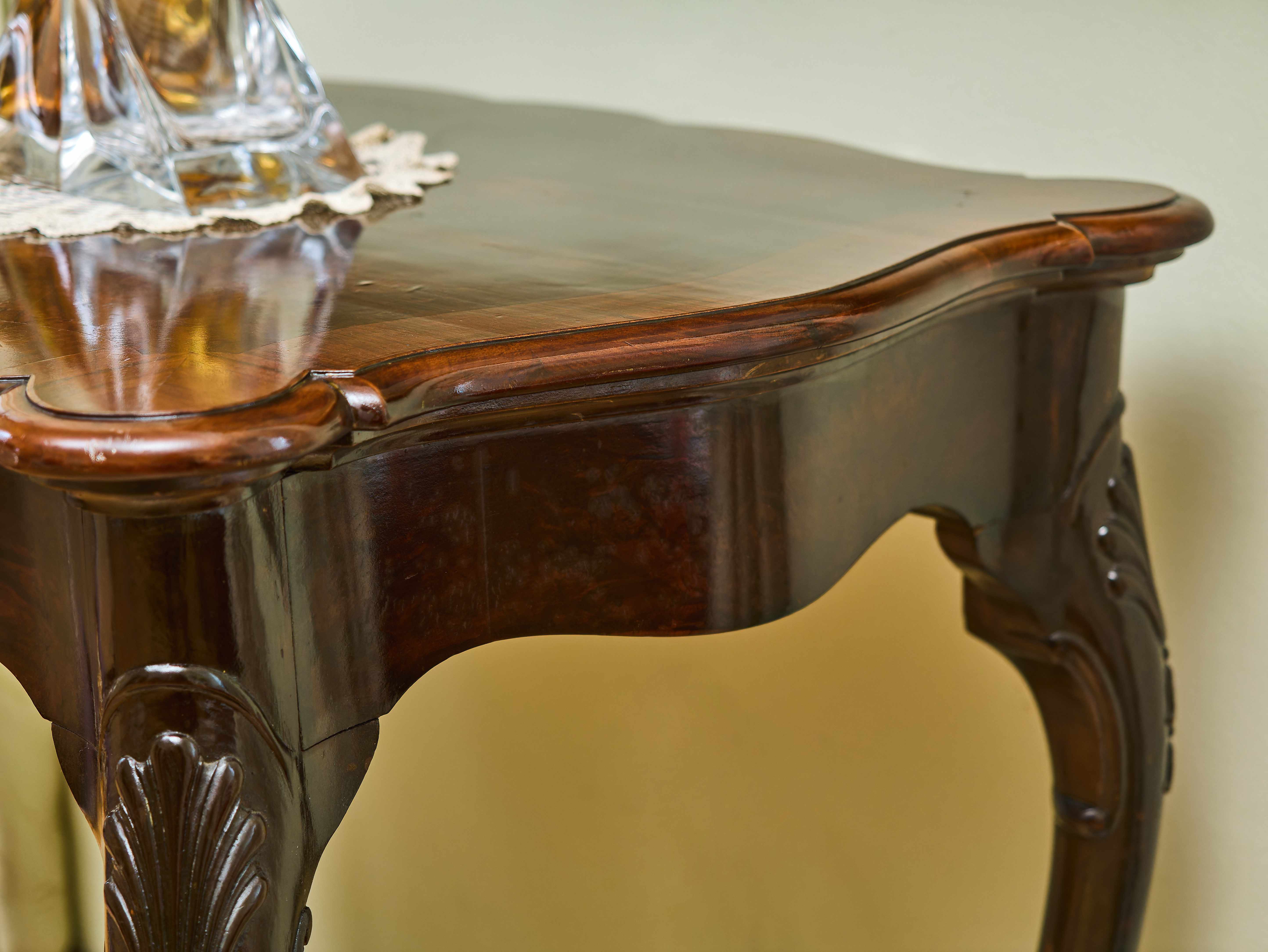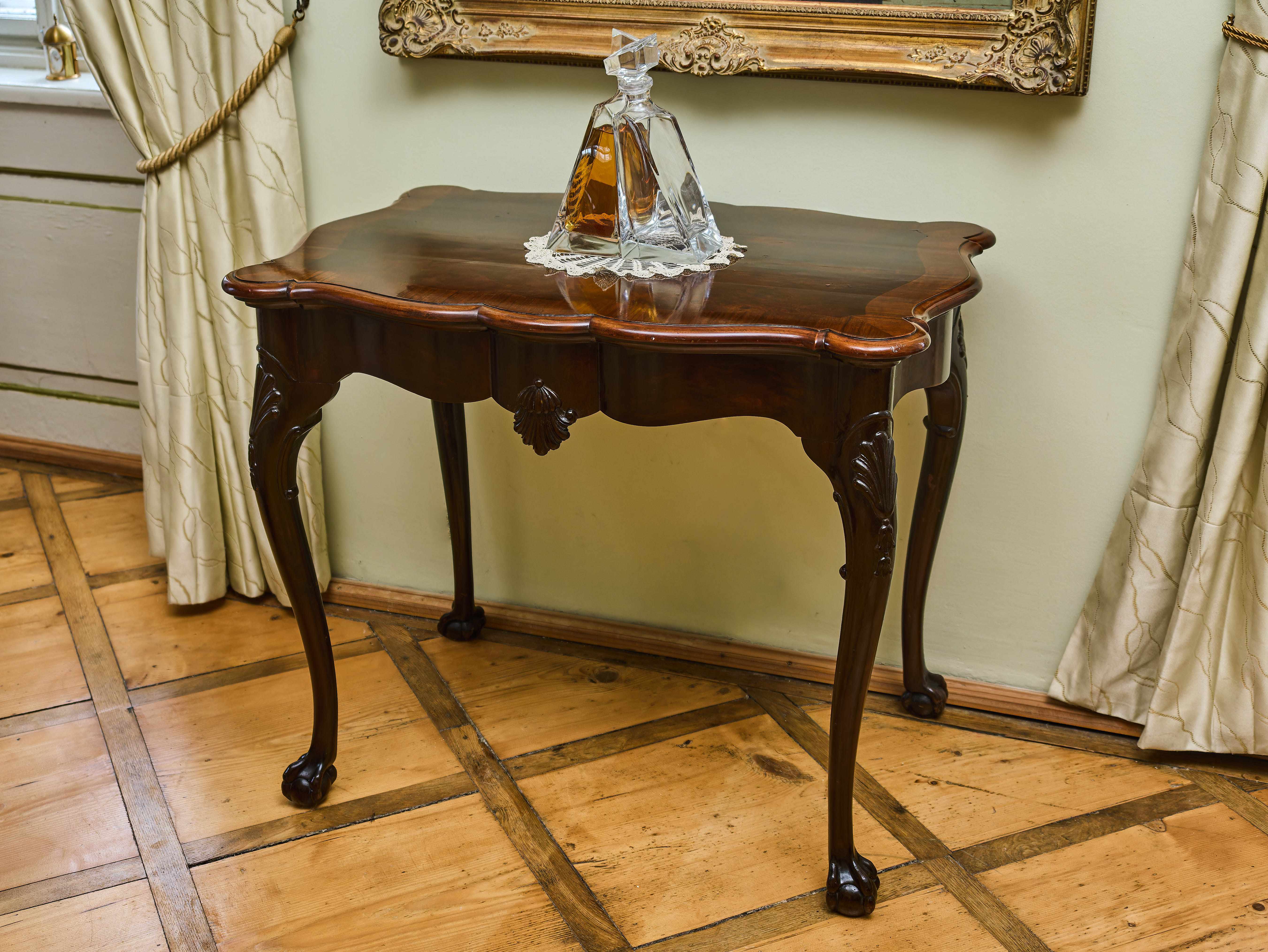 Elegantně tvarovaná deska je zasazena do plasticky profilovaného rámu a spočívá na čtyřech štíhlých, ručně vyřezávaných nohách s charakteristickým dekorativním motivem mušle. Nohy jsou zakončeny výraznými zoomorfními zakončeními připomínajícími orlí spáry, které svírají kouli, což je jeden z typických znaků nábytku inspirovaného anglickým stylem Chippendale. Tento styl vychází z návrhů slavného londýnského nábytkáře Thomase Chippendala z 18. století a byl ve 20. století často znovu interpretován v kvalitní řemeslné produkci.