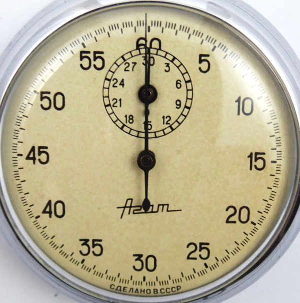 Světlý kov. Celková hmotnost 74,53 g. Sovětské stopky značky Agat. Světlý ciferník s černými arabskými číslicemi. Funkční. Vzhledem ke stáří bez záruky přesnosti chodu a dlouhodobé funkčnosti. Sovětský svaz, druhá polovina minulého století. Průměr 50 mm.
