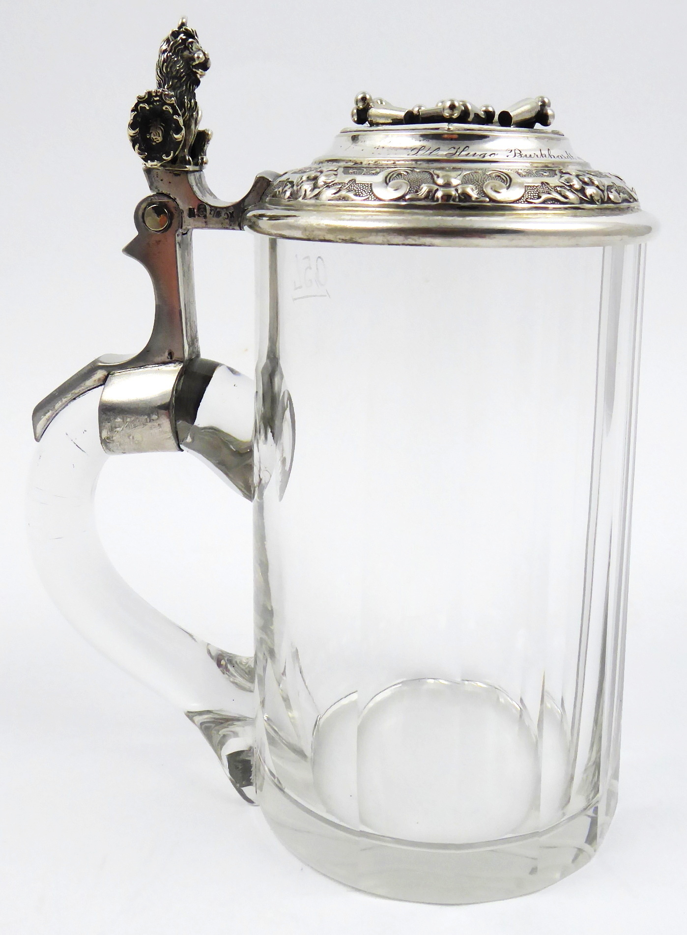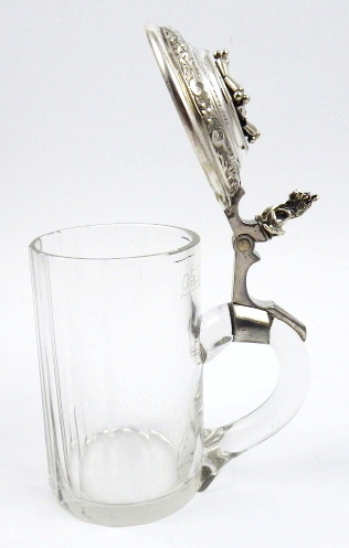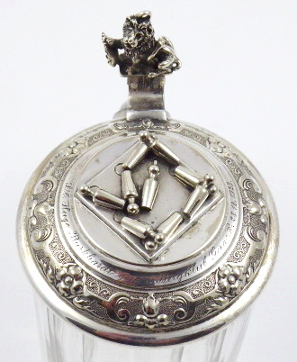 Postříbřená mosaz – alpaka, bezbarvé broušené sklo. Výrobce víka s úchytem: Württembergische Metallwarenfabrik (WMF), Geislingen. Skleněný korbel s broušenými svislými fazetami a postříbřeným víkem s okružím. Centrální část víka dekorovaná reliéfními kuželkami. Okraj s gravírovanými a gilošovanými ornamenty spolu s gravírovaným věnováním v němčině, přeloženo jako: Panu Hugo Burkhardtovi věnováno od Bergclubu Gera (sportovní kuželkářský klub) s datem 28.12.1923. Úchyt zakončen figurou lva držícího štít či erb. Značeno: firemní značka WMF, písmeno N (Neusilber, I/0 síla postříbření a značka X (oxidující). Německo, Geislingen, kolem roku 1923. Výška 17 cm.
