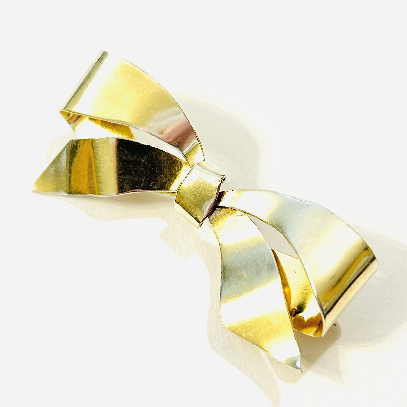 Půvabná, nadčasová větší brož v podobě mašle, realisticky tvarováno s důrazem na čistotu kovu. Kvalitní práce pražského (Královské Vinohrady) klenotníka Jaroslava Seidla z 1. poloviny 40. let 20. století.