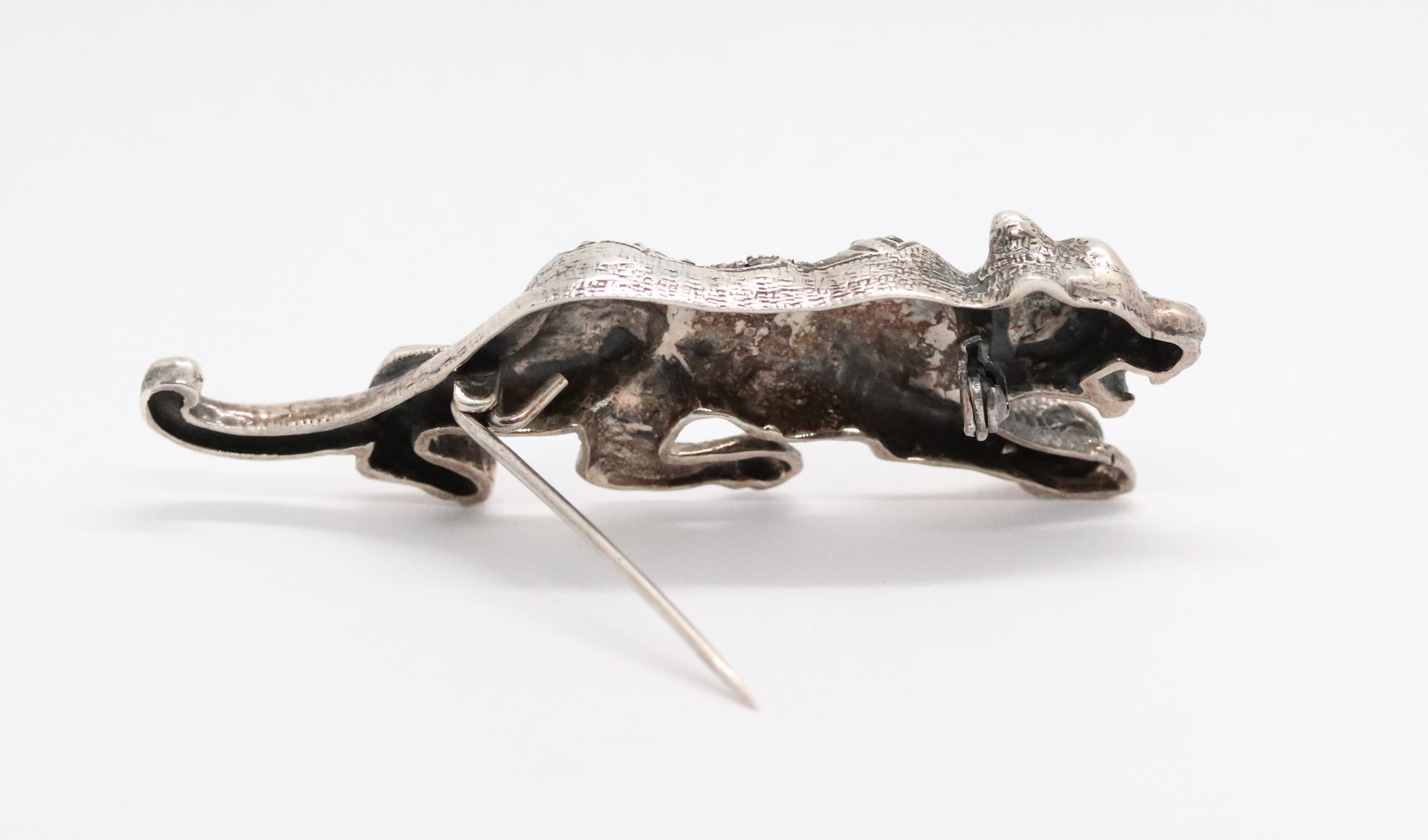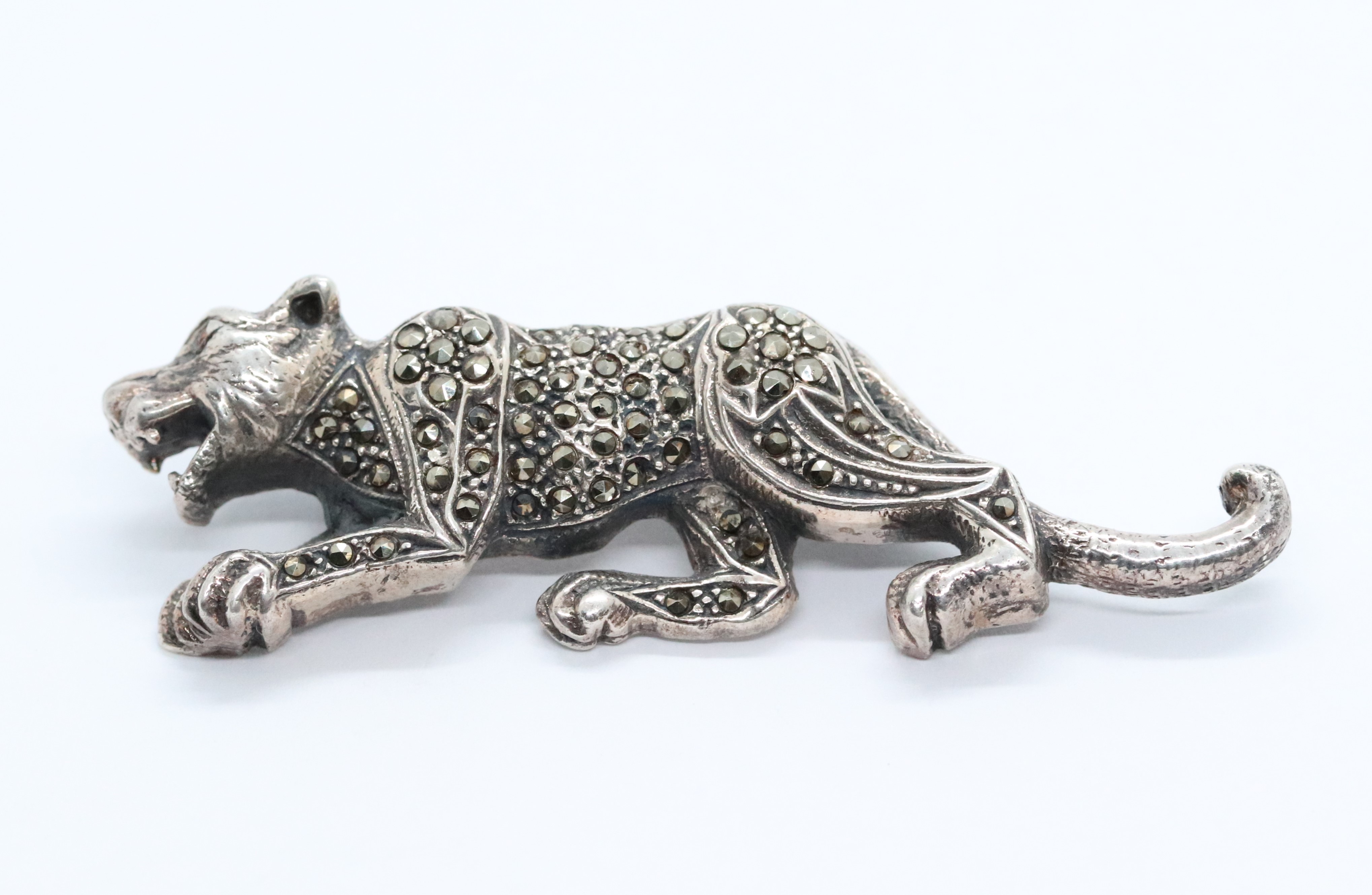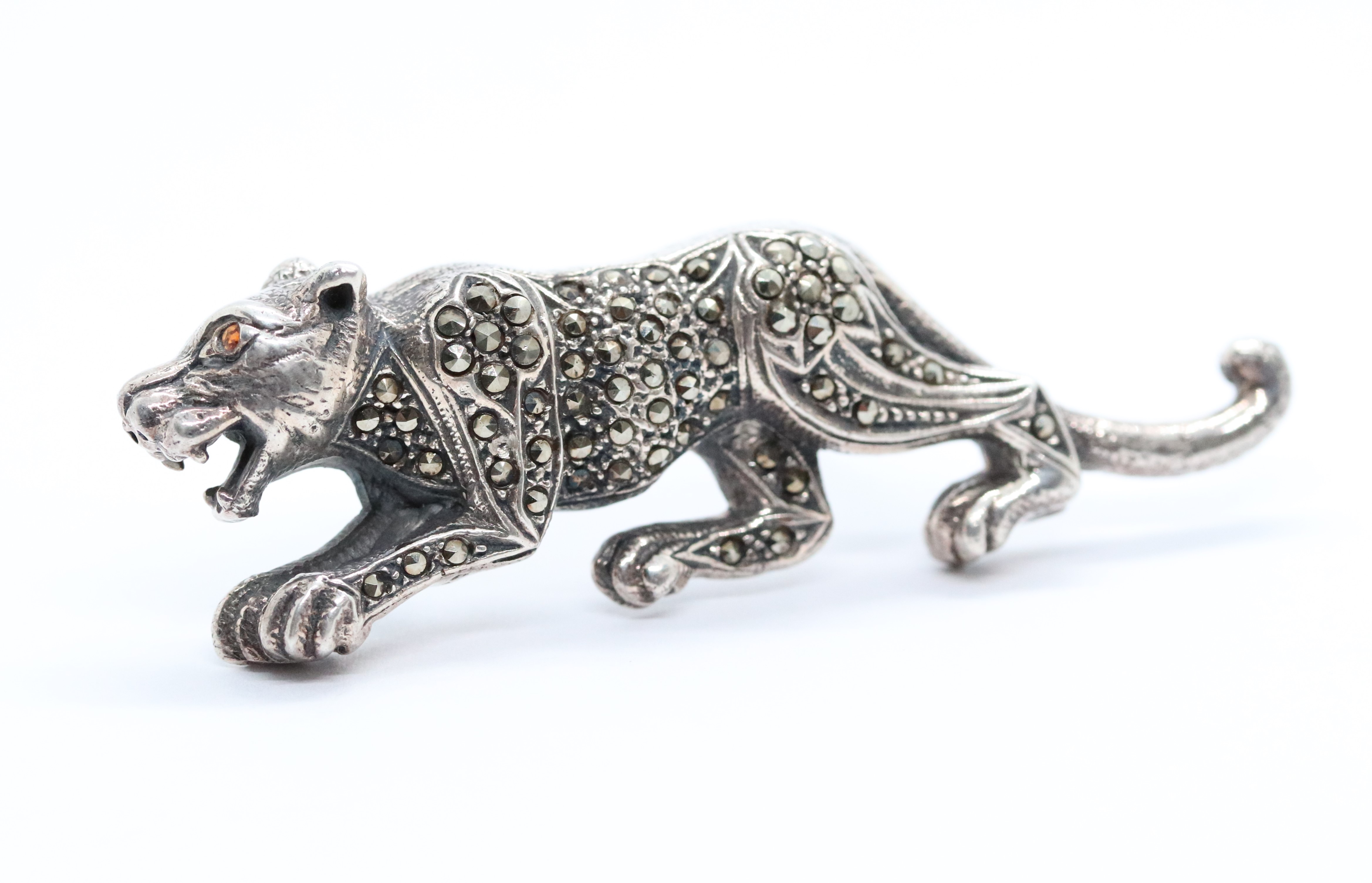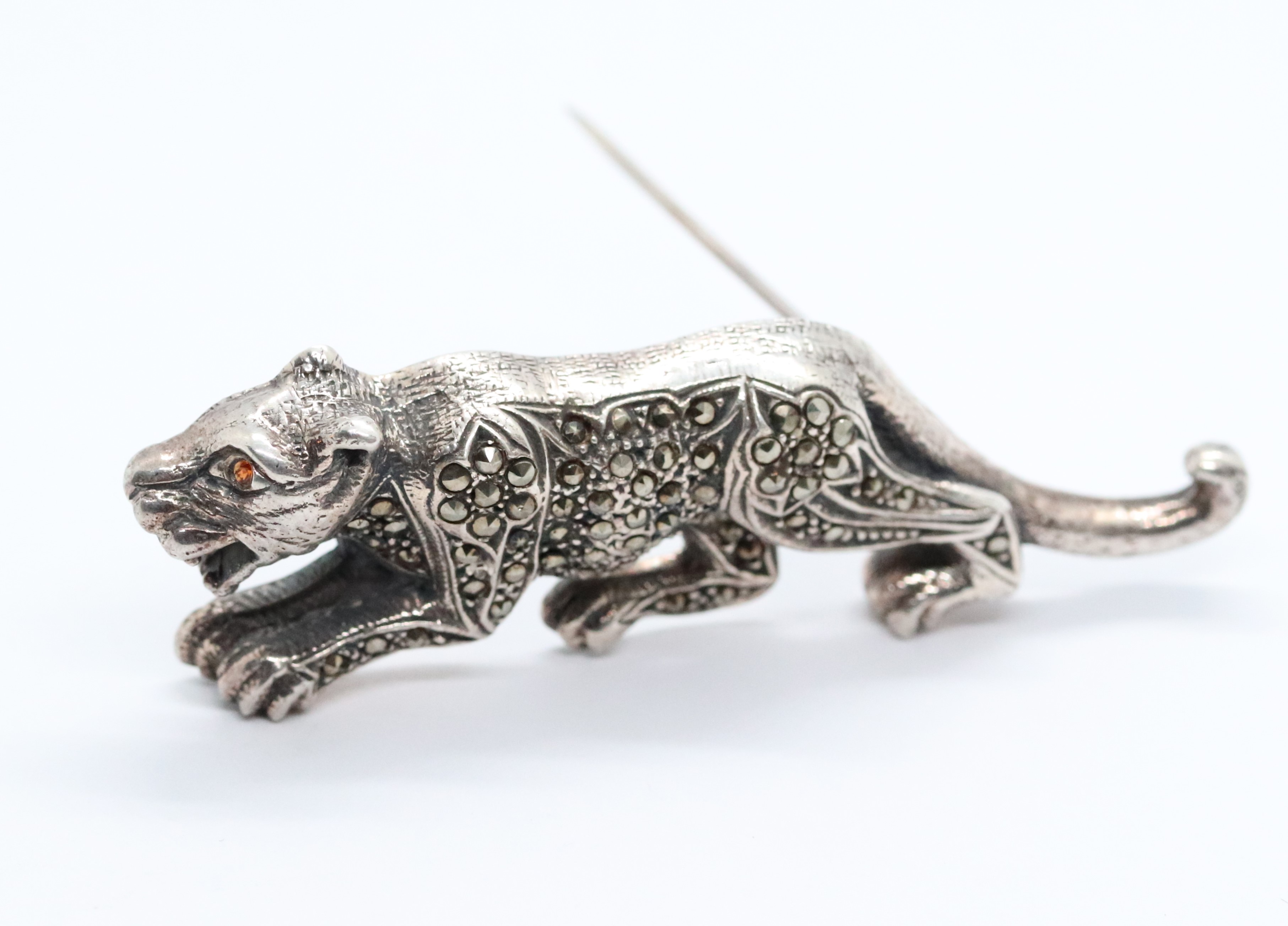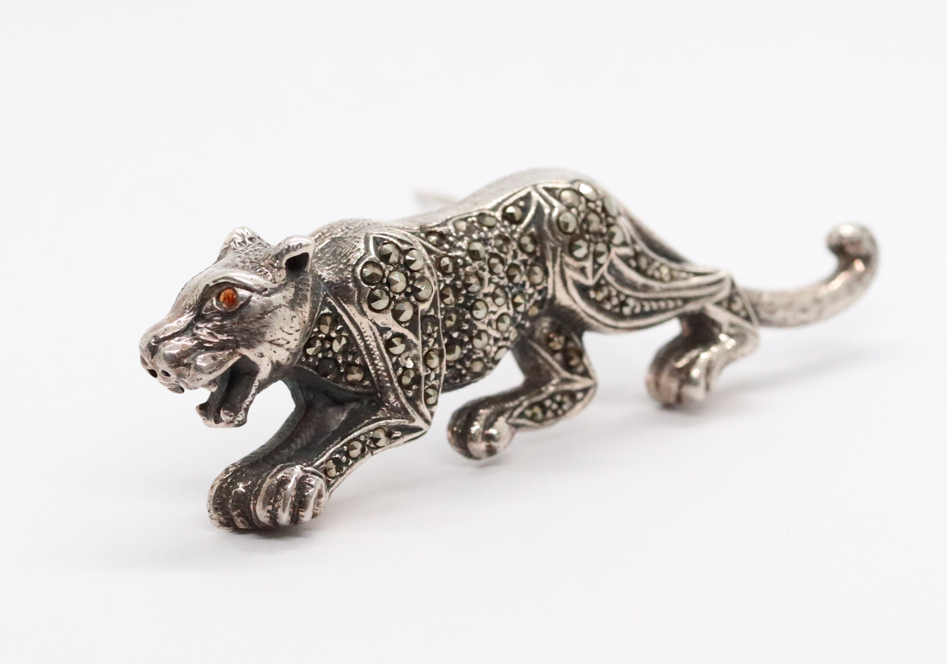 Stříbrná art deco brož v podobě pantera, zdobený markazity a oranžovým sklíčkem, Ag btto 16,45g/925/1000, Západní Evropa, 30. léta 20. století, atest puncovního úřadu; délka 6,8 cm, šířka 2,3 cm