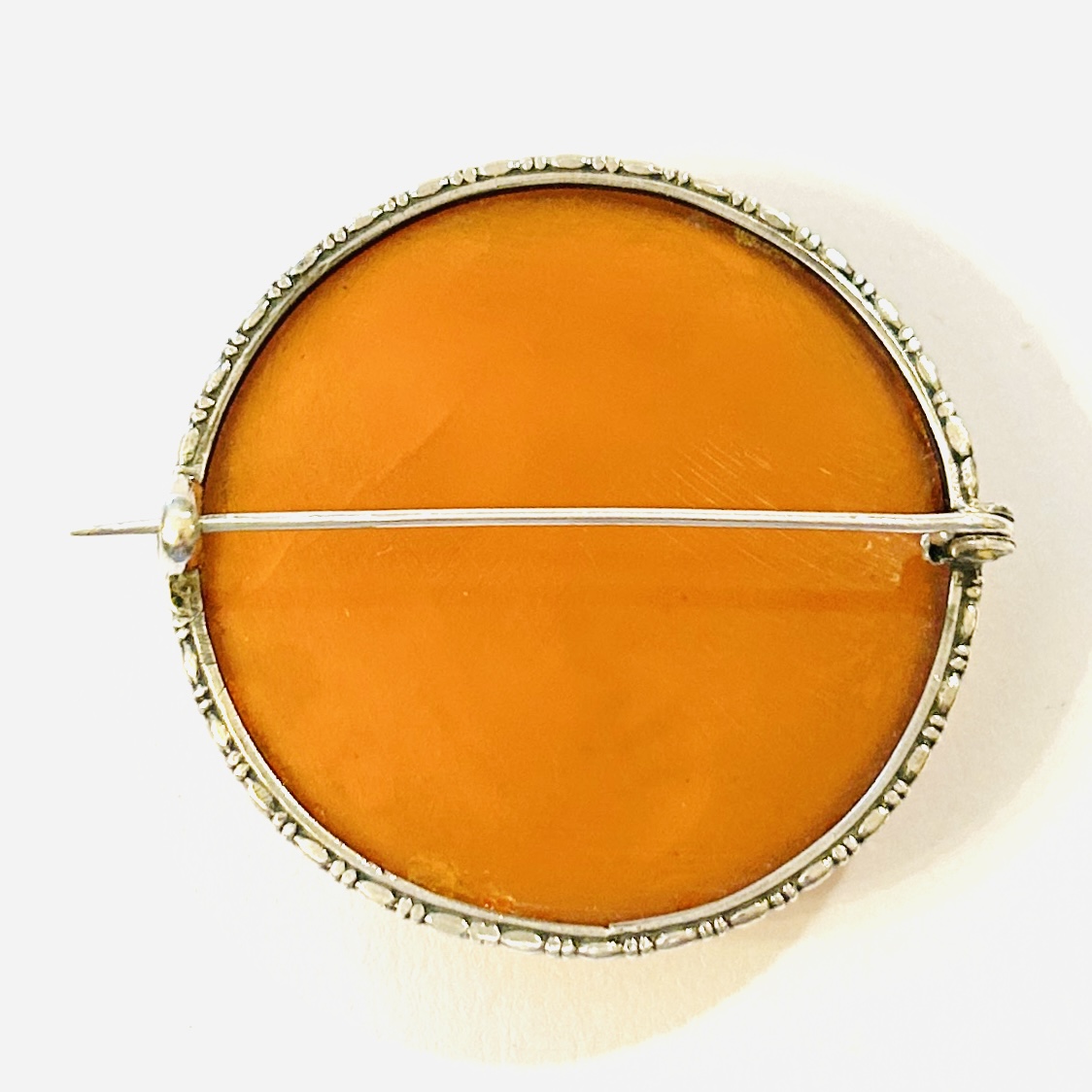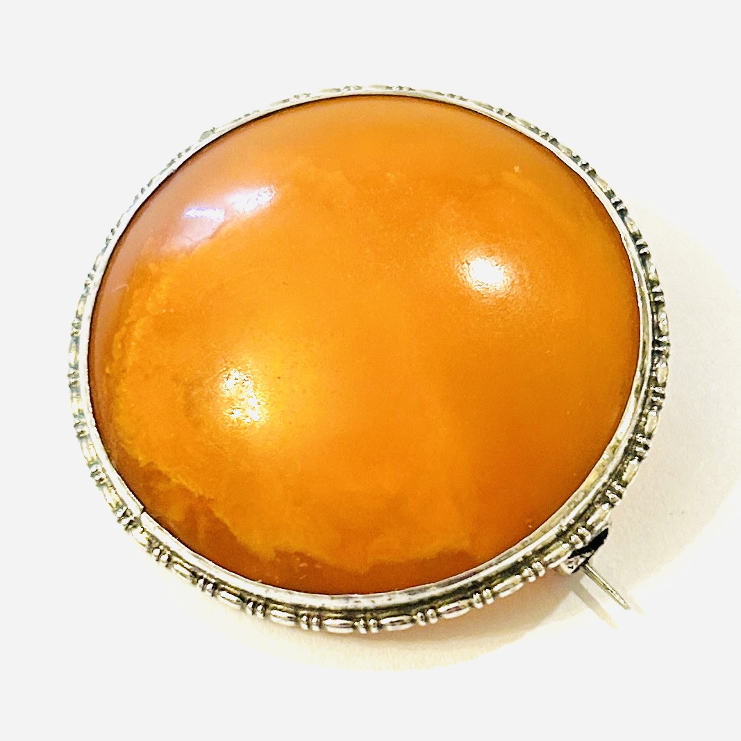 Větší brož z období art-deco, jíž vévodí nadstandardně velká kulatá plošší mugle přírodního oranžového mléčného jantaru, decentně rámováno perlovcem. Kvalitní středoevropská práce z 30. let 20. století.