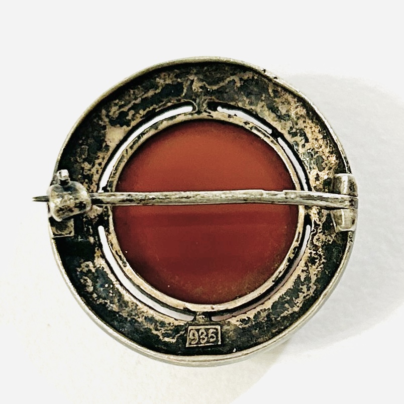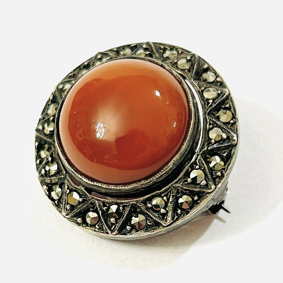 Elegantní, minimalističtější brož osazená kulatou muglí přírodního cihlově červeného karneolu, rámeček se zigzag art-deco motivem osazen v zrnitých lůžkách přírodními markazity kulatého hvězdicového brusu. Kvalitní německá zlatnická práce z 30. let 20. století.