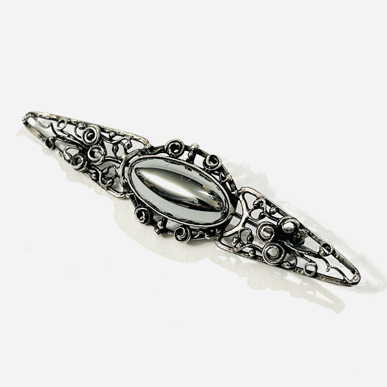 Dekorativní podlouhlá brož osazena oválnou muglí přírodního hematitu, spletité tělo s organicky vinutými křivkami. Historizující vyznění šperku podtrhává umělá patina. Polská autorská práce z konce 20. či počátku 21. století.