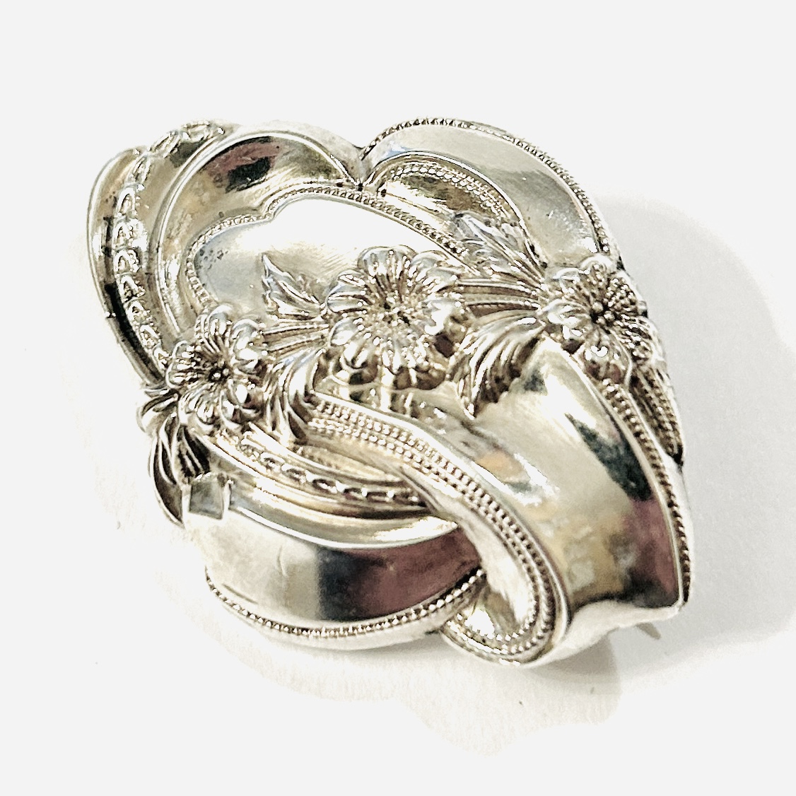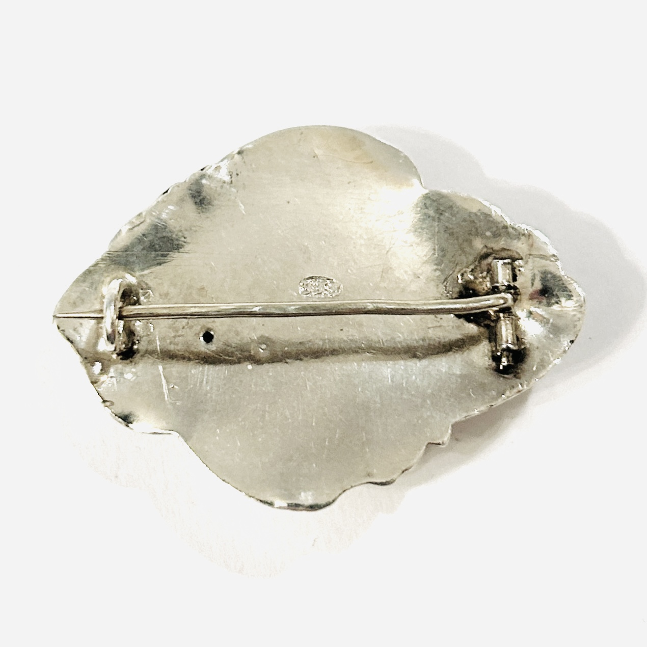 Zhotoveno z nezlaceného stříbra, svrchní část o ryzosti 925/1000, spodní část, spona a mechanismus zapínání o ryzosti 800/1000, jehla z obecného kovu; vyhotoveno osvědčení puncovního úřadu, mistrovská značka zespoda. Hmotnost 4,58 g, délka 42 mm, šířka 32 mm. Zapínání na „C“ sponu v pořádku, celkově v zachovalém stavu, odborně vyčištěno a vyleštěno zlatníkem.