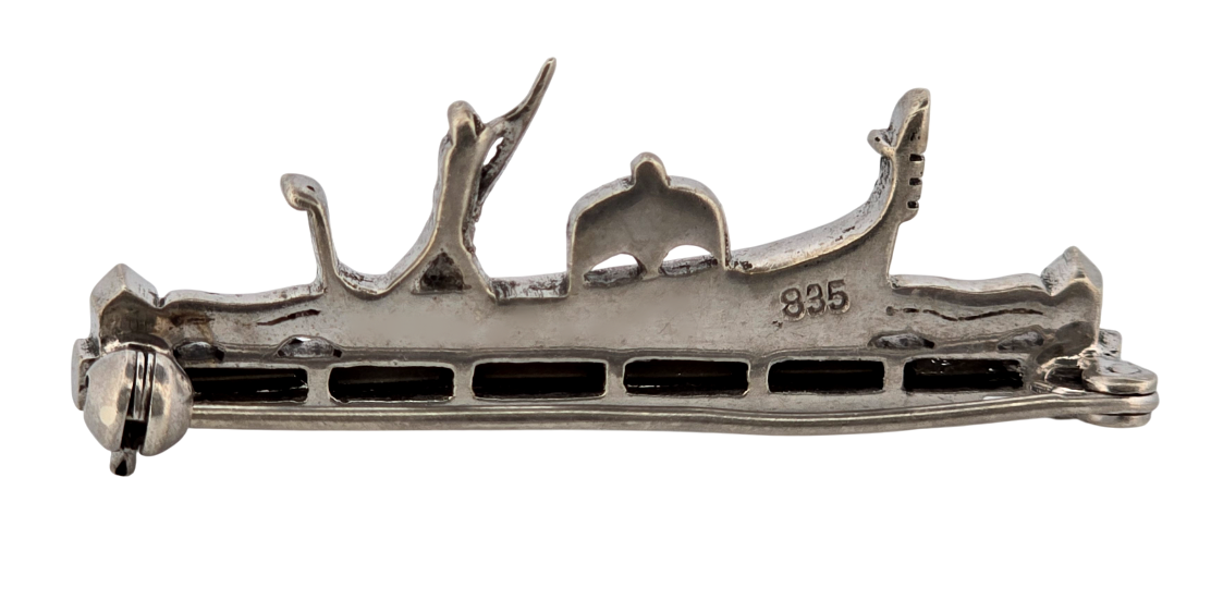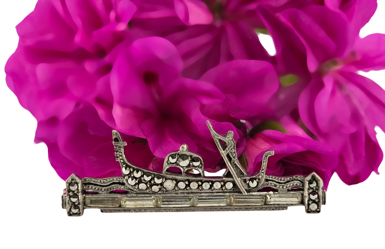 Popis: Stříbrná starožitná výjimečná brož. Detailně znázorňuje plující gondolu na vlnách s gondoliérem. Zdobeno markazity a čirými kameny bagetového brusu. Bezpečnostní funkční zapínání.