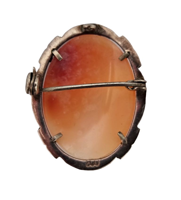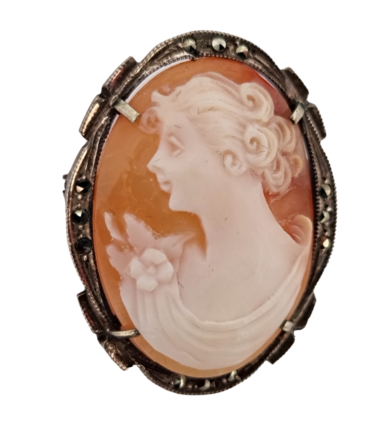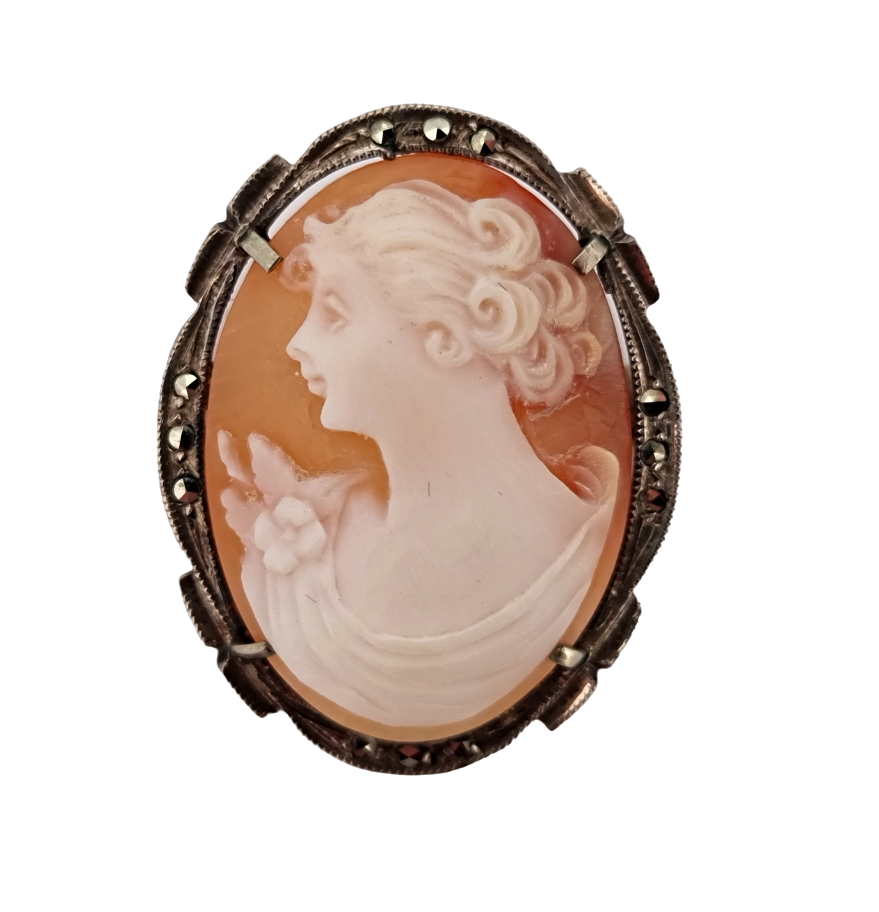 Popis: Stříbrná brož/přívěsek (2 v 1), krásná starožitná, kamej z přírodní mušloviny, ručně vyřezávaná kvalitní precizní detailní práce. Doplněno zdobením z markazitů. Jehla z obecného kovu.