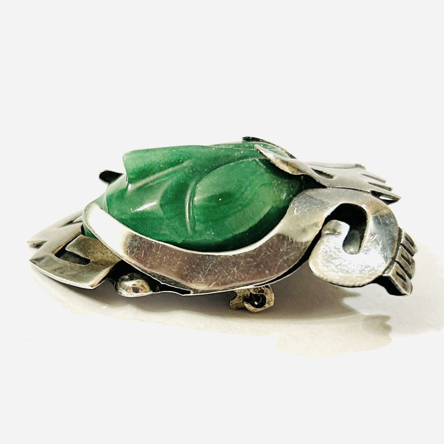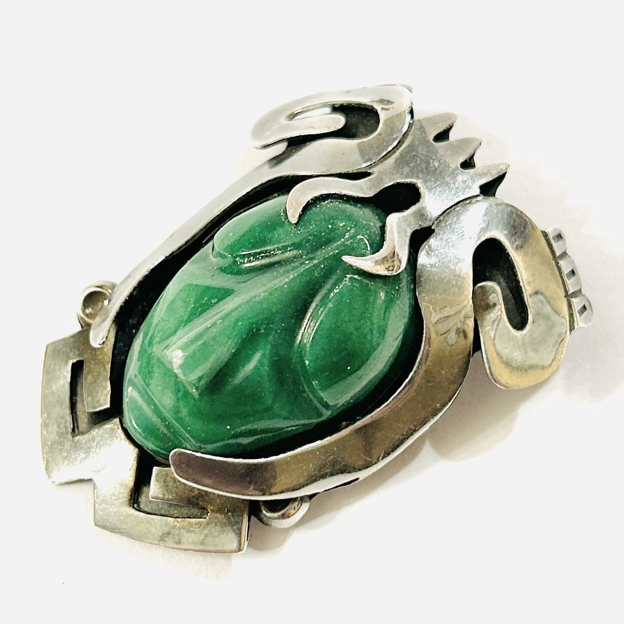 Nevšední, extravagantní brož ve tvaru aztécké masky, obličej ruční glyptikou z přírodního jadeitu, rámování v podobě rituální koruny. Kvalitní mexická zlatnická a řezačská práce z 3. čtvrtiny 20. století.