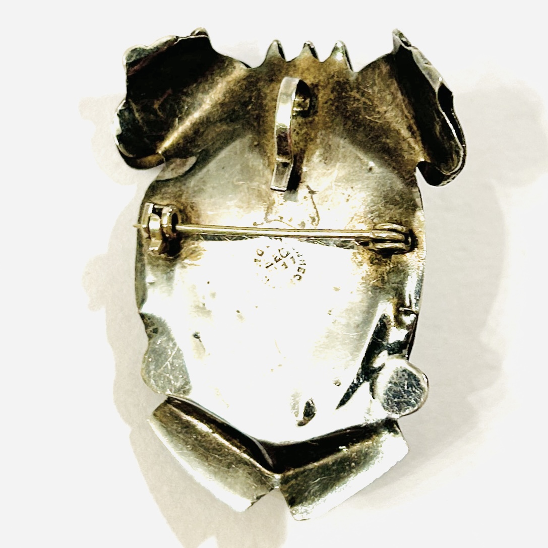 Zhotoveno z nezlaceného stříbra o ryzosti 925/1000, jehla z obecného kovu; nově opatřeno puncem S-61 (kozlík 2) na háčku a značkou \“METAL\“ na jehle, značení výrobce zezadu. Hmotnost 18,86 g, délka 49 mm šířka 39 mm. Zapínání včetně pojistky v pořádku, otevřený háček pro zavěšení na řetízek. Ponecháno s přirozenou patinou, lze vyčistit, stopy nošení, jinak v dobrém stavu.