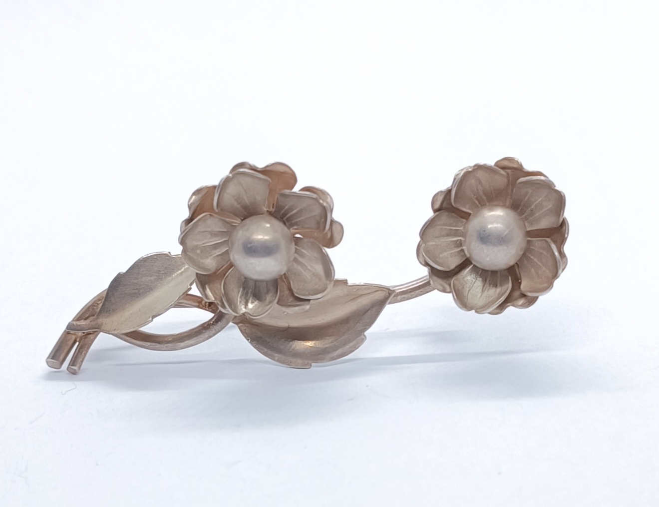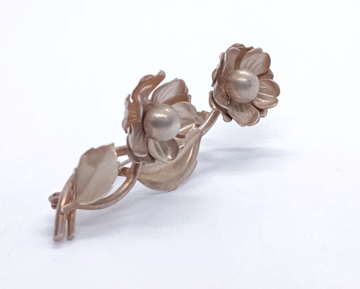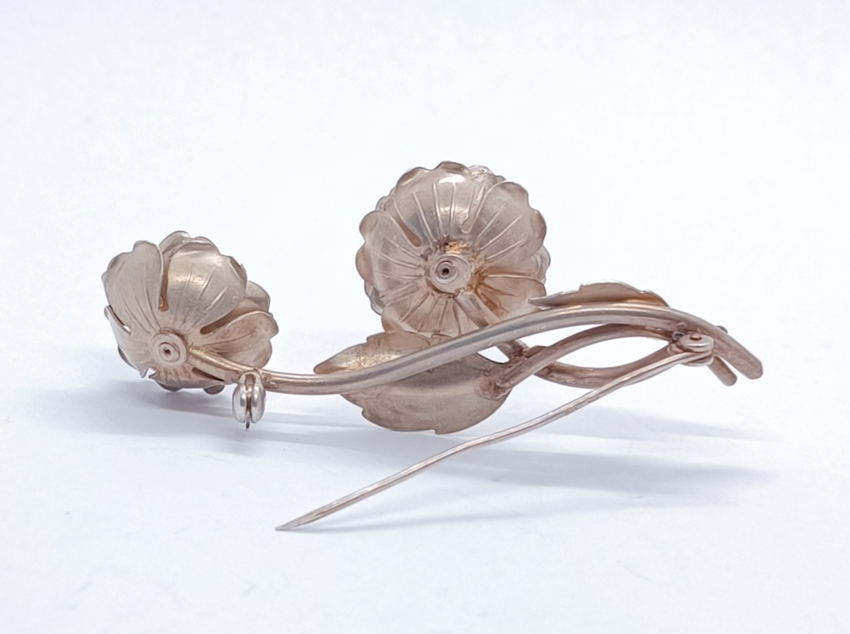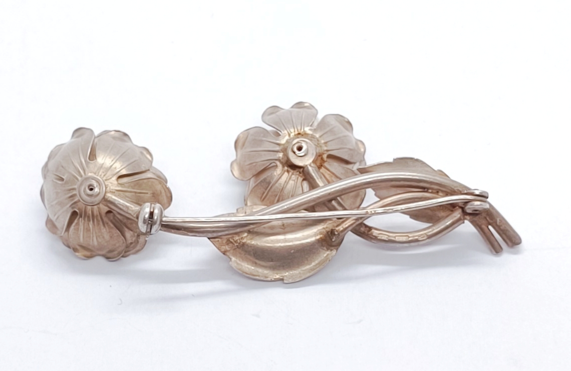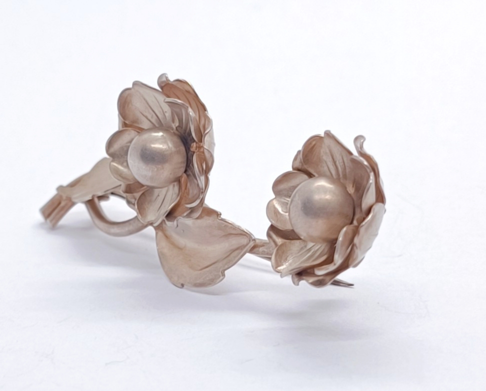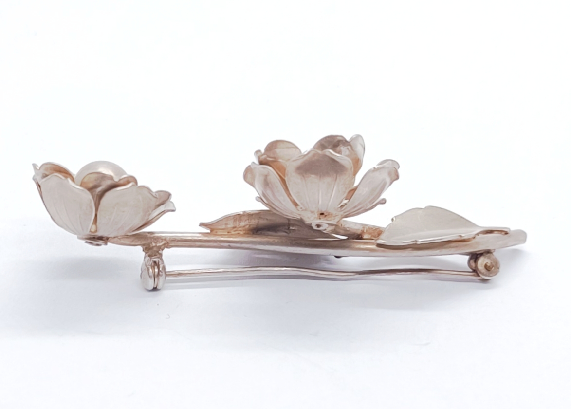 Stříbrná brož v podobě růže, matované stříbro, Ag 13,30g/900/1000 (punc S-62, kamzík 3), Československo, 50. léta 20. století; délka 6,8 cm, šířka 3 cm