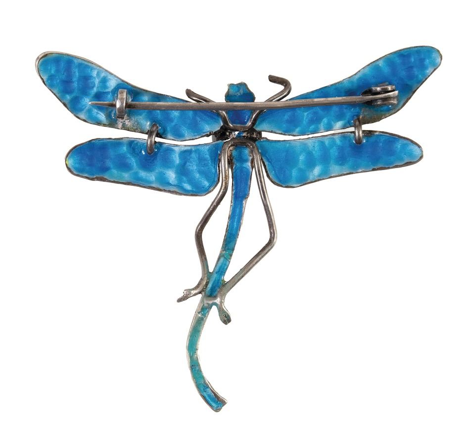 Nádherná, neobvyklá brož ve tvaru vážky je vyrobena ze stříbra o ryzosti 800/1000 a je zdobena perletí a barevným smaltem,