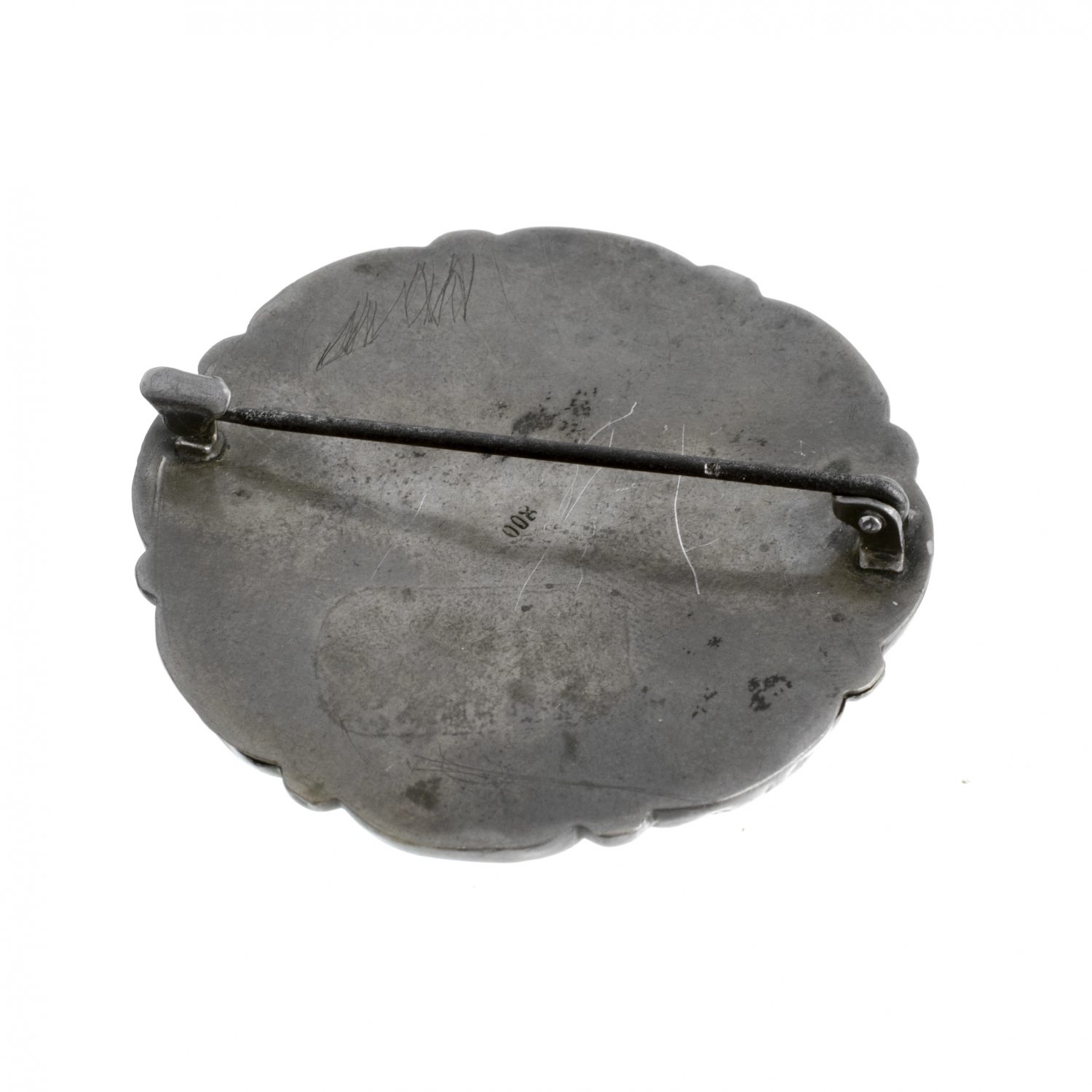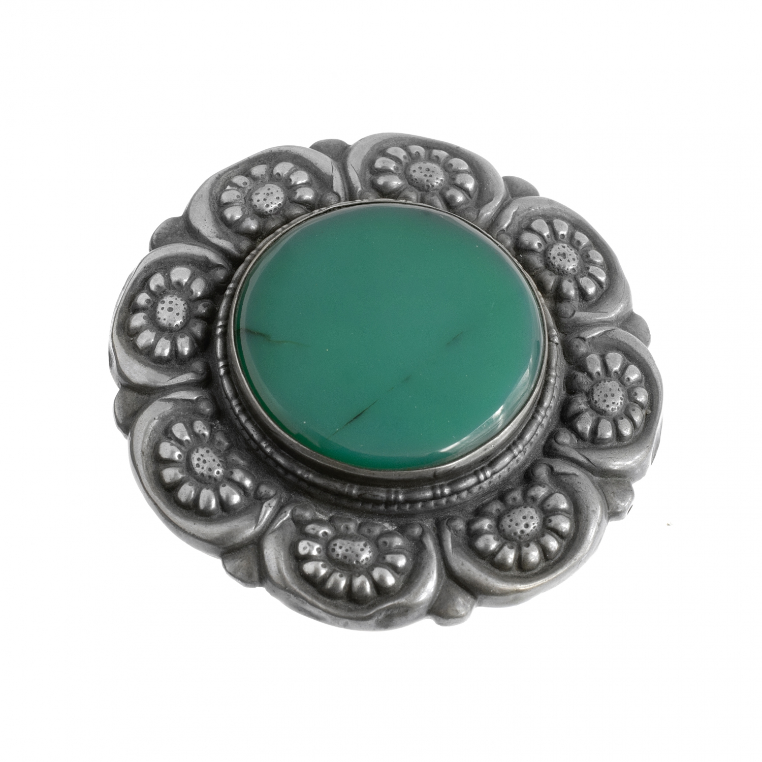 Brož ve tvaru květu je původem z Čech, rok 1940. Zdobí ji velký kulatý chryzopras o průměru 2,6 cm.