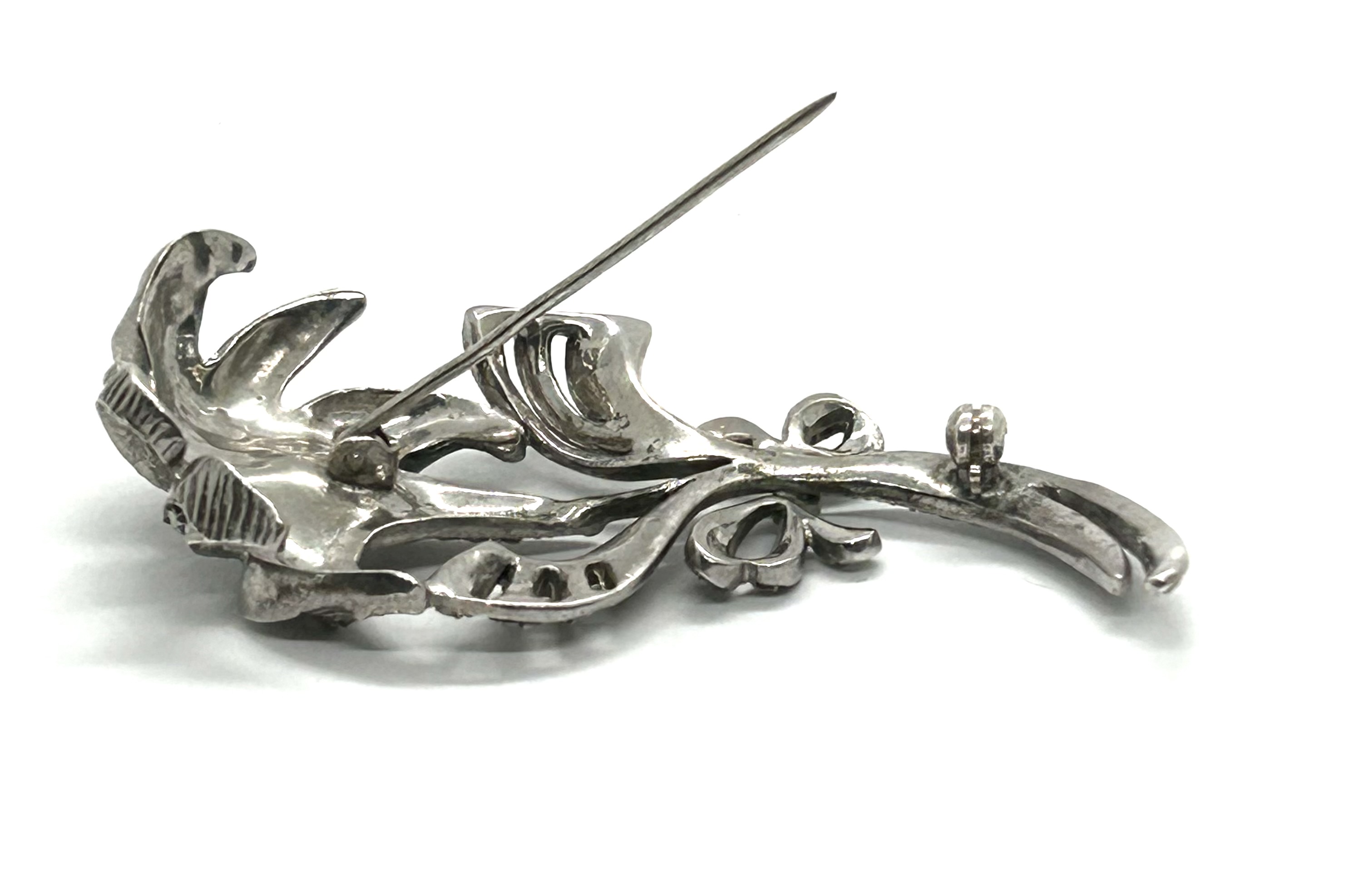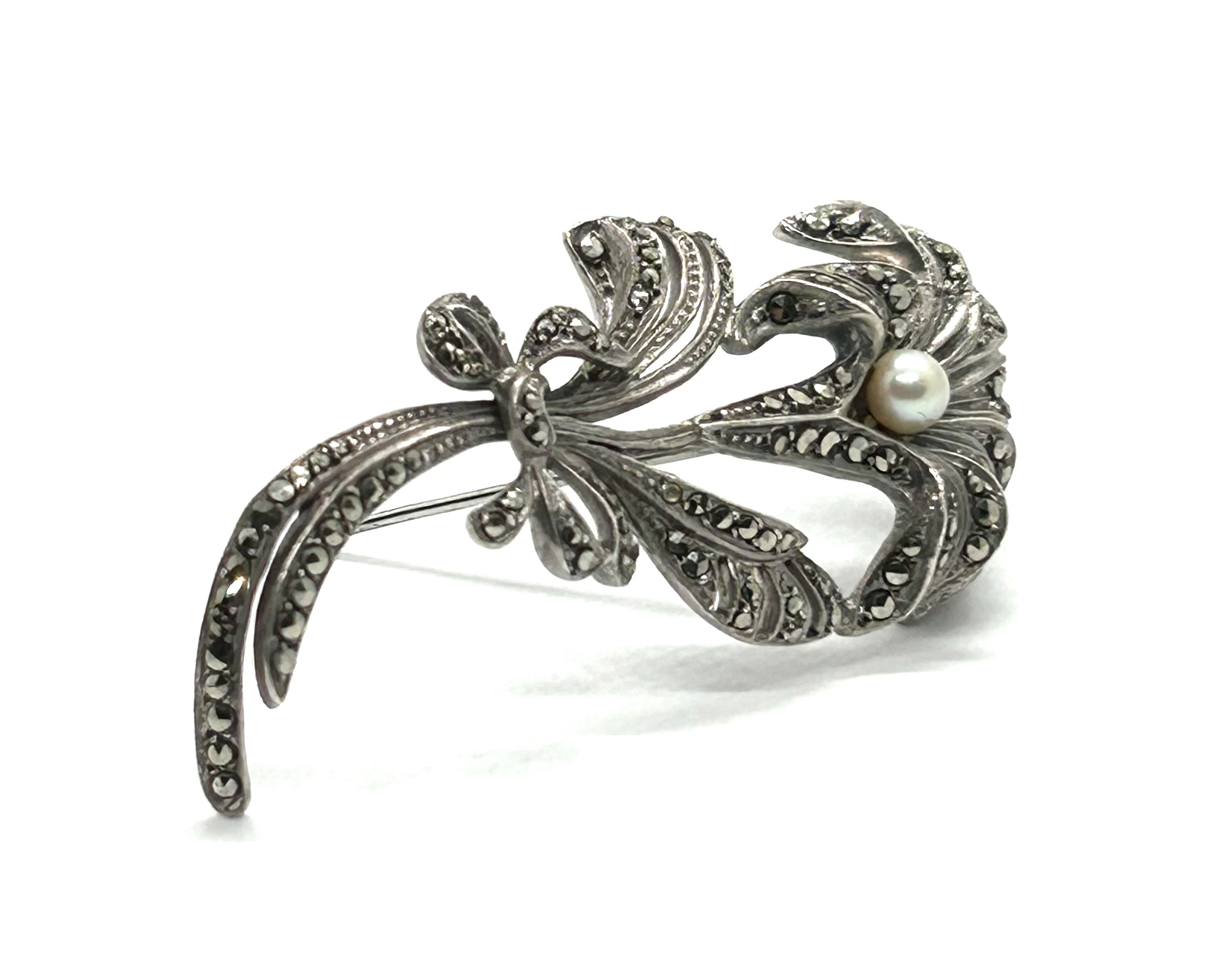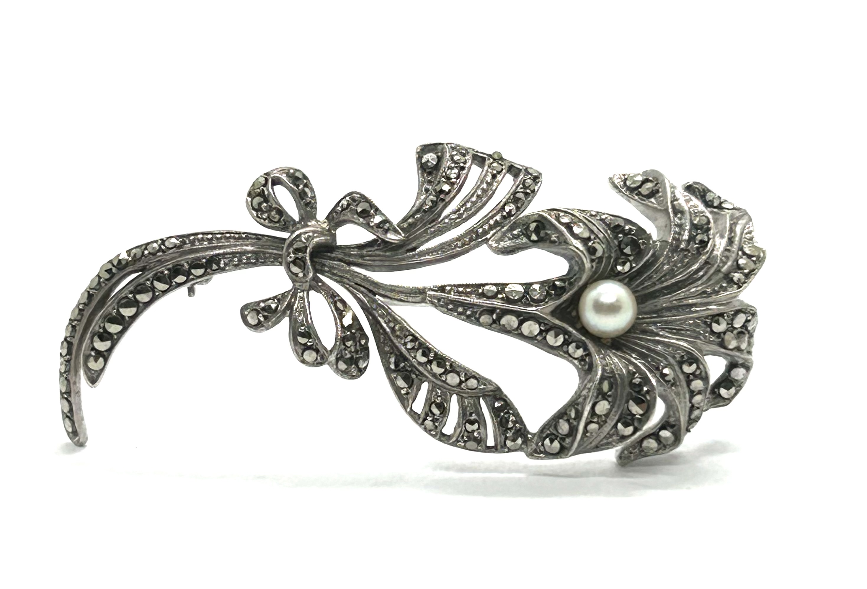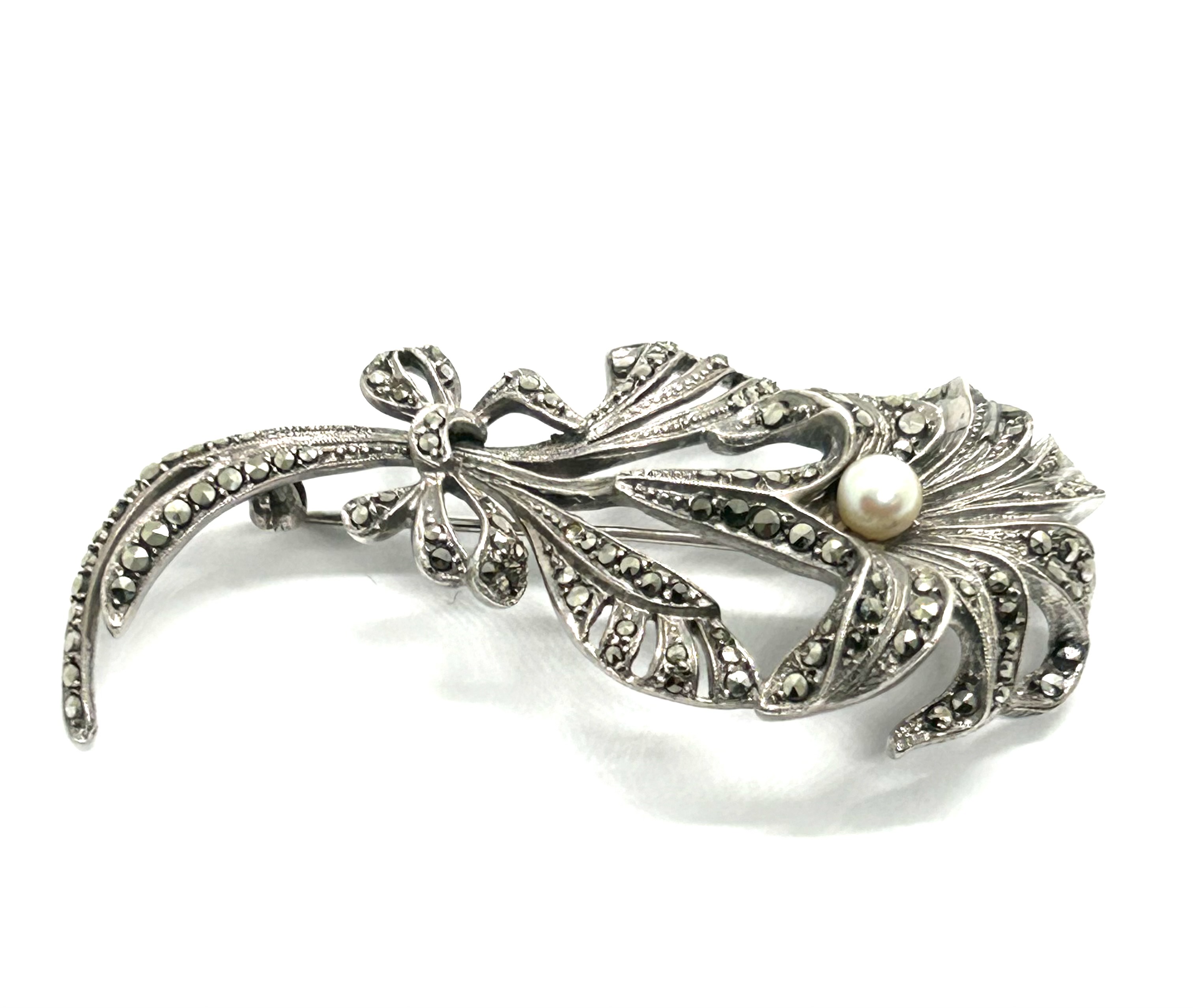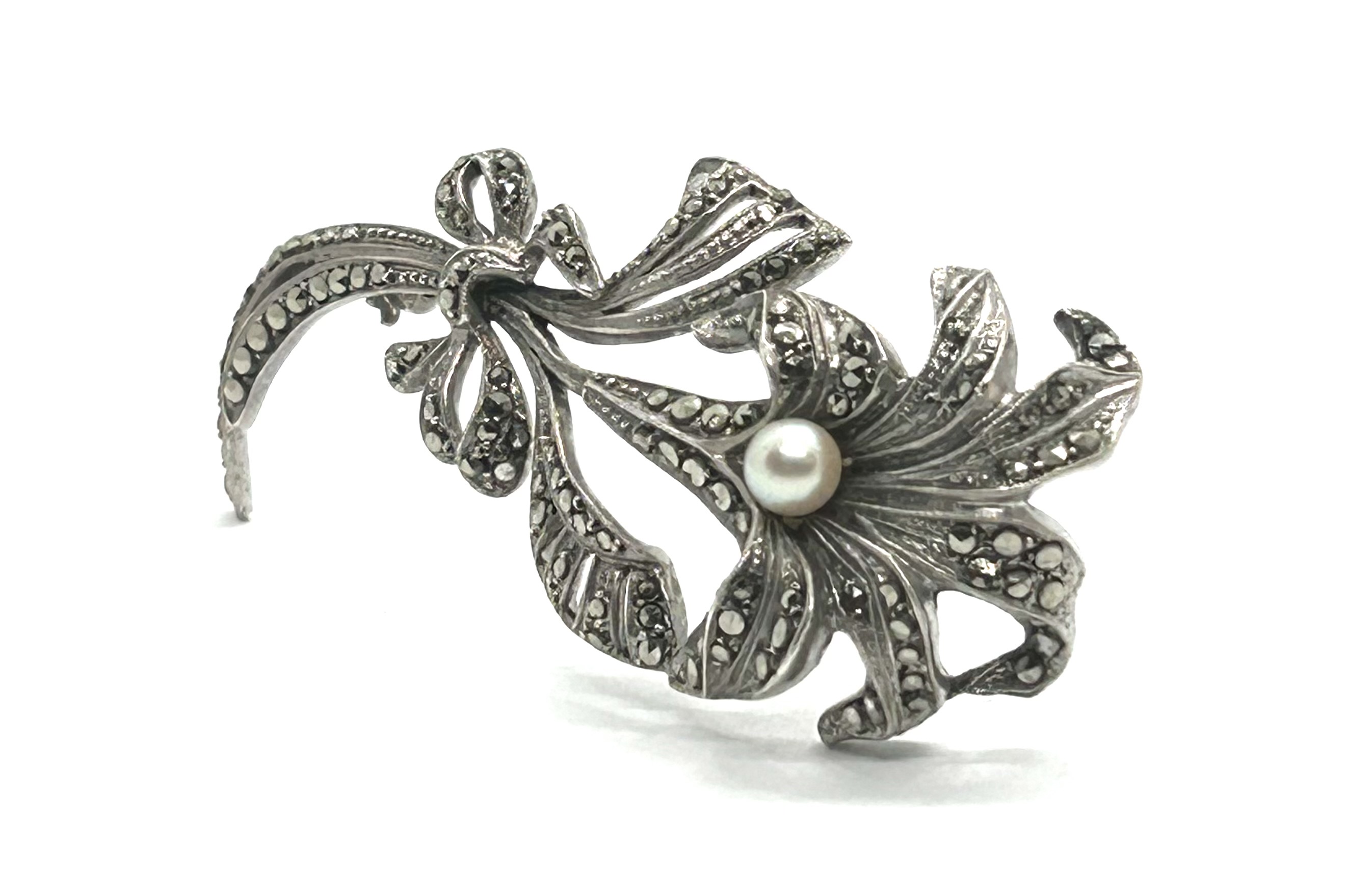 Stříbrná brož s přírodní mořskou perlou a markazity z 30. let minulého století, západní Evropa. Ag btto 12,10 g, 925/1000; šířka 6,7 cm, výška 3,2 cm. Jehla s bezpečnostní pojistkou v obecném kovu. Brož ze stříbra vysoké ryzosti v působivém tvaru květiny se nachází ve výborném stavu a je k ní přiložen atest Puncovního úřadu České republiky.