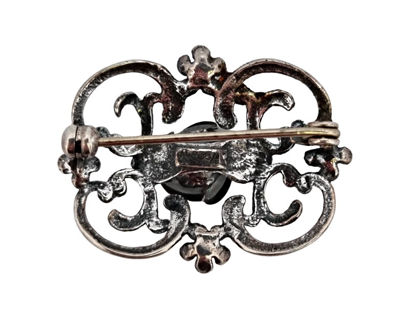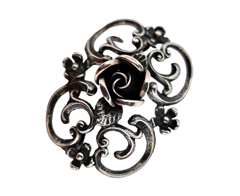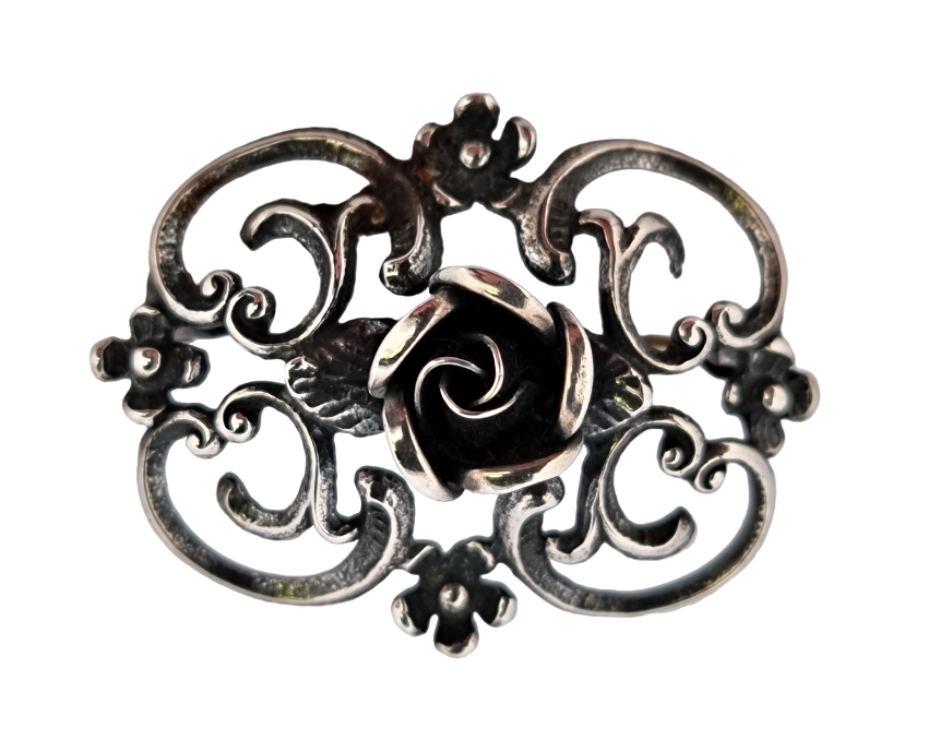 Popis: Stříbrná brož s růžičkou, zdobená, tvar ornamentů. Jehla z obecného kovu.