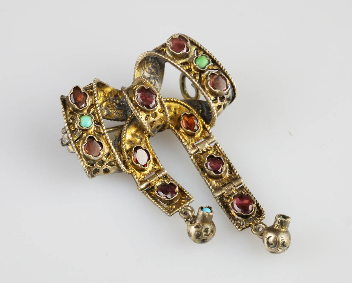 stříbrná brož ve tvaru mašle s tyrkysy a almandiny, Ag 8,90 g/800/1000, Rakousko-Uhersko, Sedmihradsko, kolem r. 1890; rozměry 5 x 3,5 cm; atest Puncovního úřadu