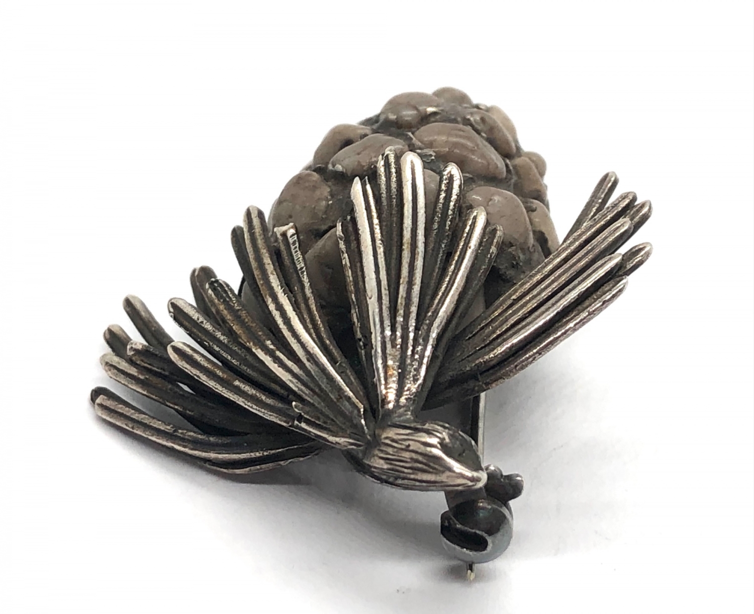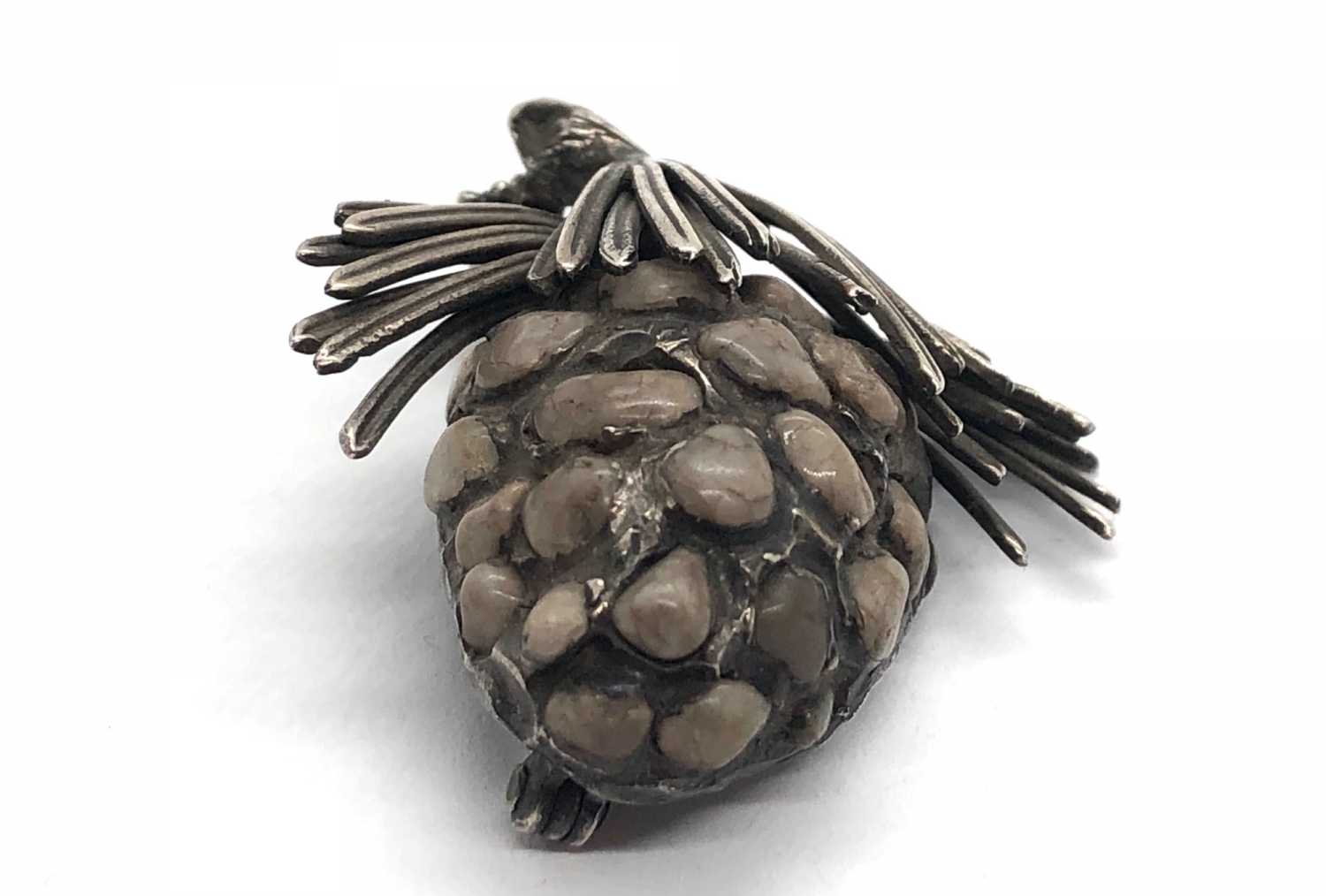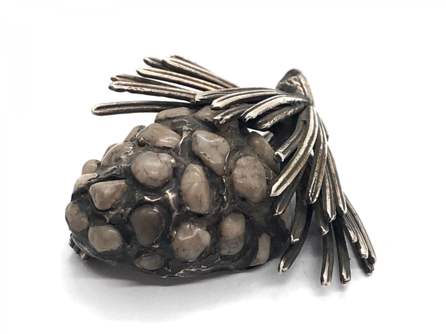 Zajímavě propracovaná art deco brož ve tvaru šišky, kterou tvoří kamínky zasazené do stříbra, vznikla kolem roku 1925. Ag btto 13,70g/835/1000; výška 4 cm, šíře 4,5 cm.