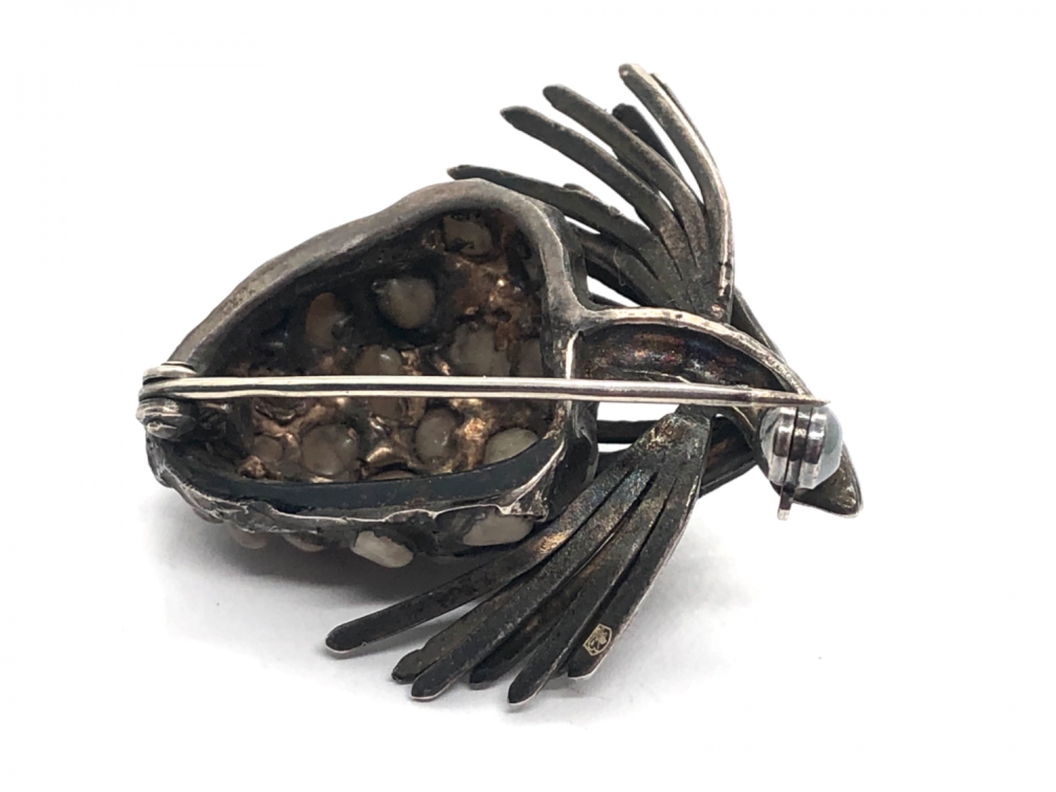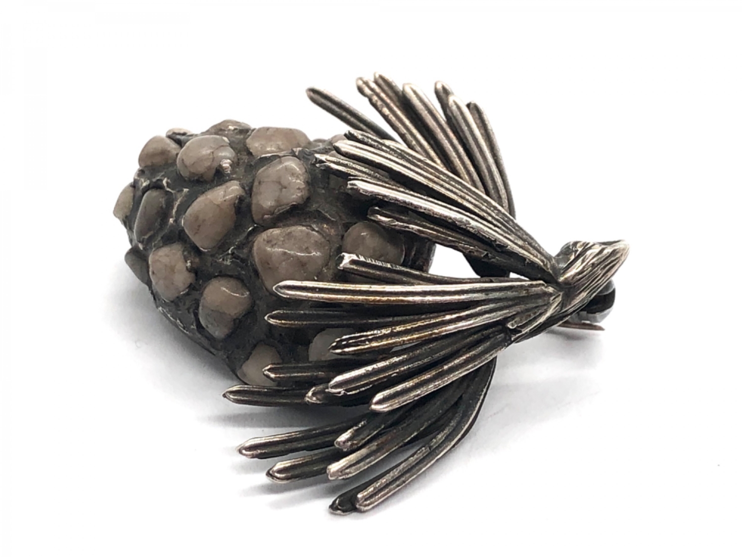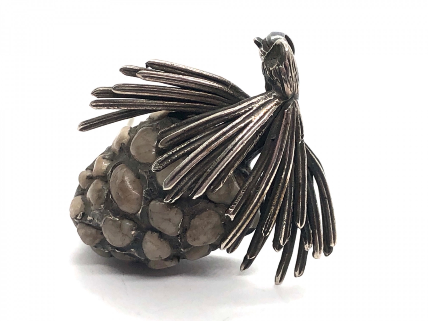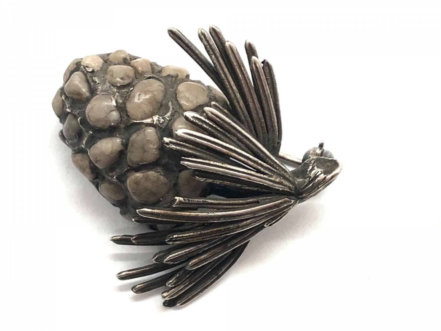Zajímavě propracovaná art deco brož ve tvaru šišky, kterou tvoří kamínky zasazené do stříbra, vznikla kolem roku 1925. Ag btto 13,70g/835/1000; výška 4 cm, šíře 4,5 cm.