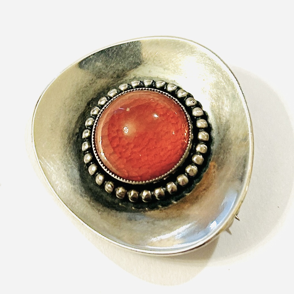 Nadčasová, elegantní brož v bruselském stylu, prohnuté tělo typického asymetrického buněčného tvaru, uprostřed osazeno kulatou muglí medově oranžového kamene s organicky strukturovaným podložím, fasováno v zrnité obrubě a rámováno perlovcem. Solidní německá práce z 60. let 20. století.