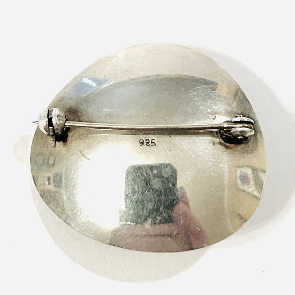 Zhotoveno z nezlaceného stříbra o ryzosti 935/1000; nově opatřeno puncem S-61 (kamzík 2) a ryzostní číslo zezadu, nově označeno \“METAL\“ na jehle. Hmotnost 10,04 g, délka 34,5 mm, šířka 31,5 mm. Zapínání včetně pojistky v pořádku, ponecháno s lehkou přirozenou patinou, lze vyčistit, celkově v zachovalém stavu.